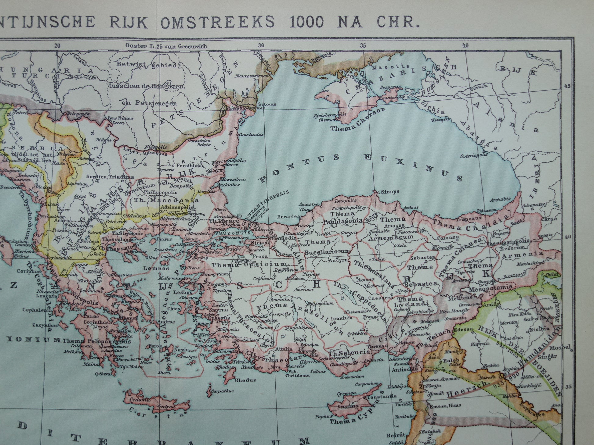 Byzantijnse Rijk oude landkaart van Oost Romeinse Rijk uit 1915 originele antieke Nederlandse kaart geschiedeniskaart