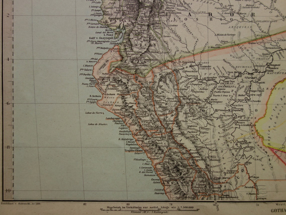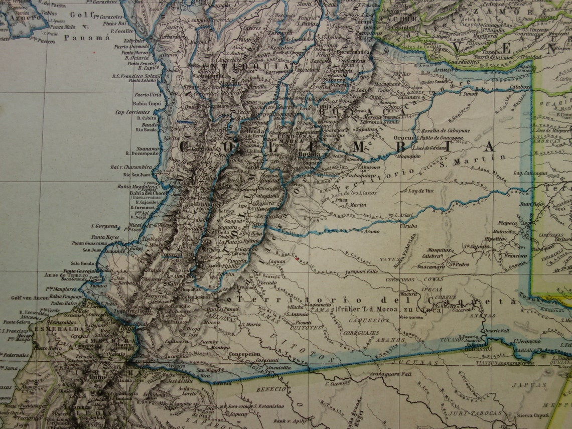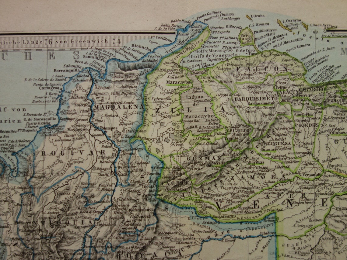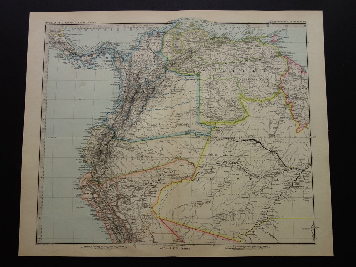 Zum Verkauf steht eine sehr detaillierte, alte deutsche Karte des nordwestlichen Südamerikas (Venezuela, Kolumbien, Ecuador und Peru) aus dem Jahr 1886. Die Fotos zeigen alle Details. Die Karte hat breite Ränder und eignet sich hervorragend zum Einrahmen. Die Jahreszahl 1886 ist in kleiner Schrift unterhalb der Karte aufgedruckt.