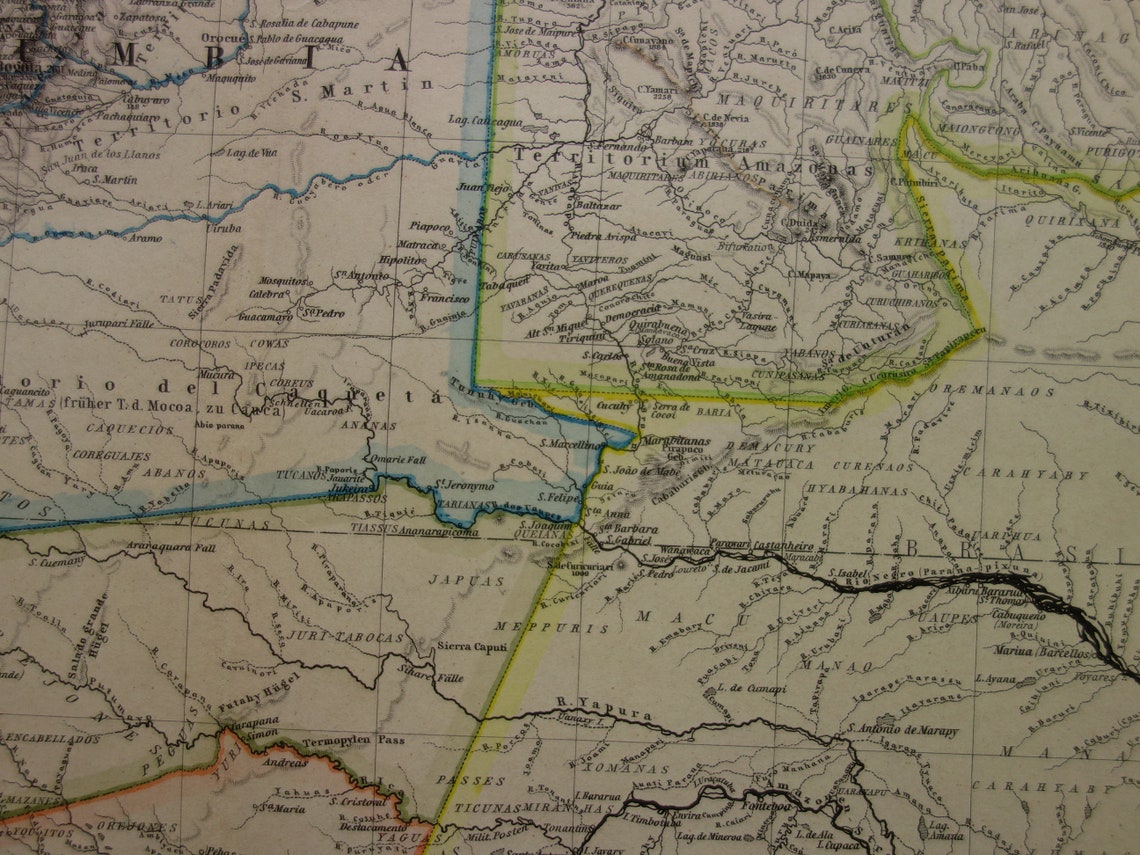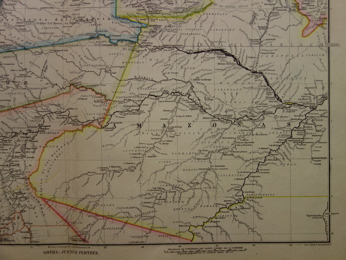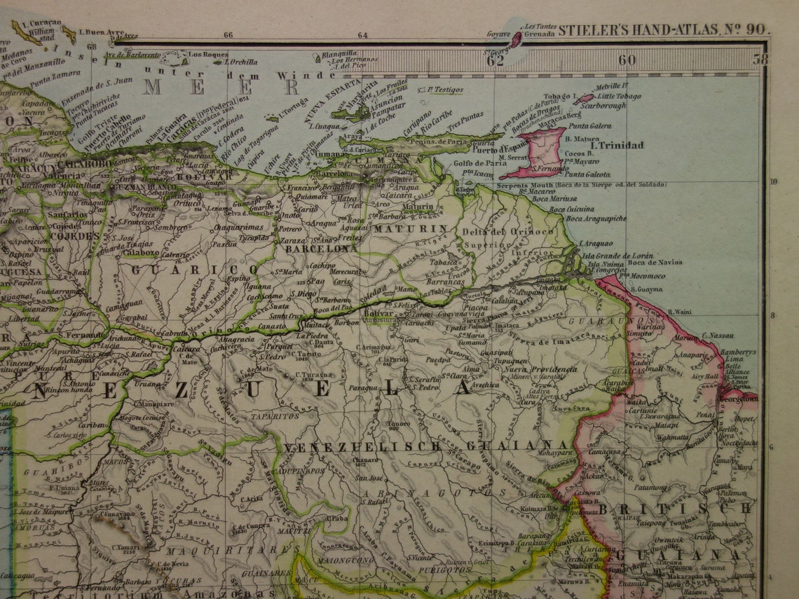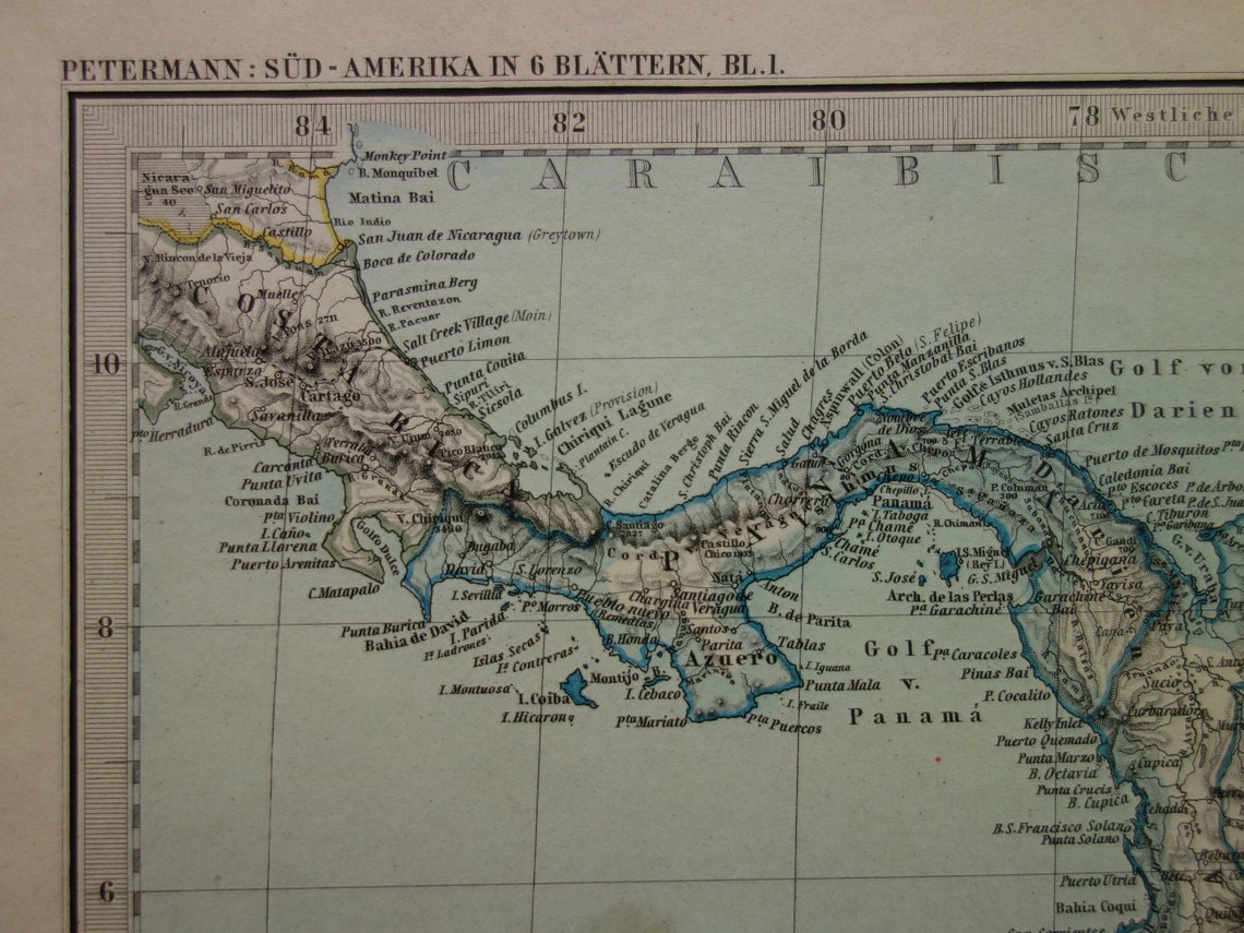 Zum Verkauf steht eine sehr detaillierte, alte deutsche Karte des nordwestlichen Südamerikas (Venezuela, Kolumbien, Ecuador und Peru) aus dem Jahr 1886. Die Fotos zeigen alle Details. Die Karte hat breite Ränder und eignet sich hervorragend zum Einrahmen. Die Jahreszahl 1886 ist in kleiner Schrift unterhalb der Karte aufgedruckt.