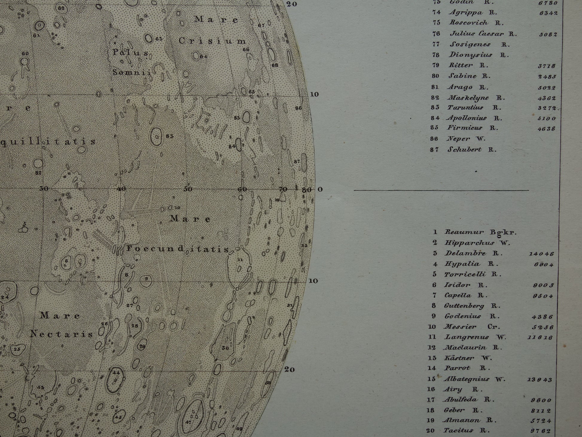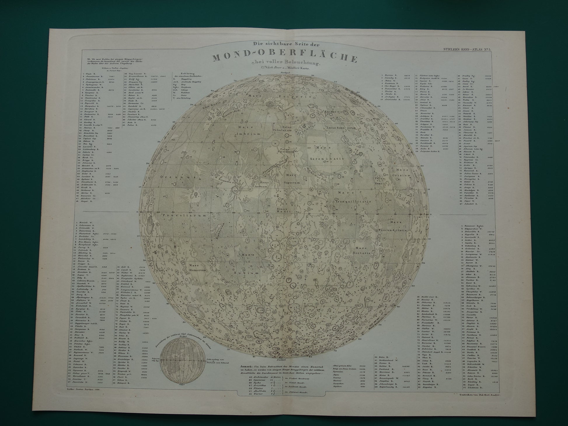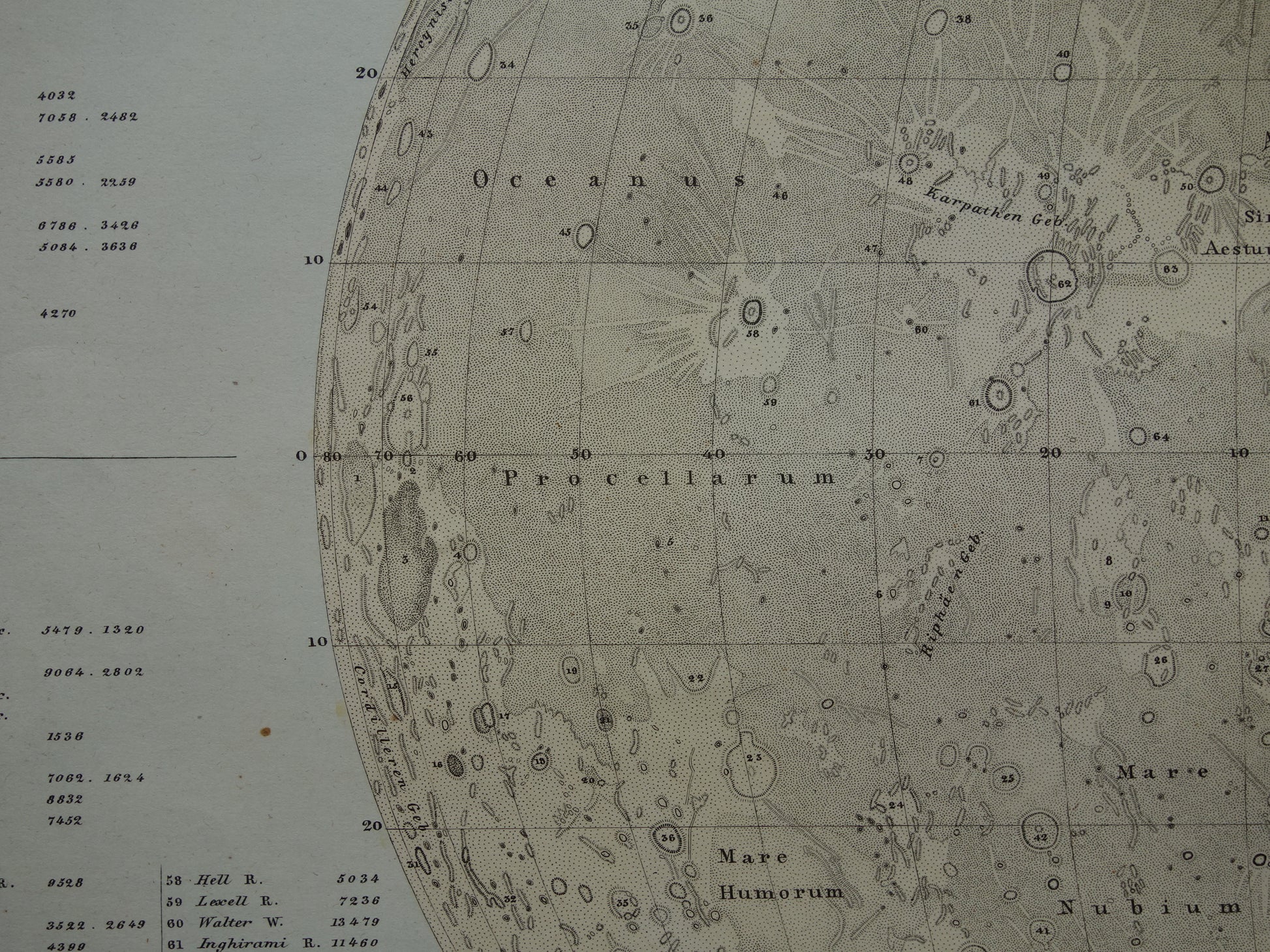 Te koop is een mooie oude kaart van de zichtbare zijde van de maan uit het jaar 1880. Rondom staan per kwadrant de namen van de grootste/bekendste kraters en toppen met de hoogte/diepte. Linksonder staat het jaartal 1880 afgedrukt.