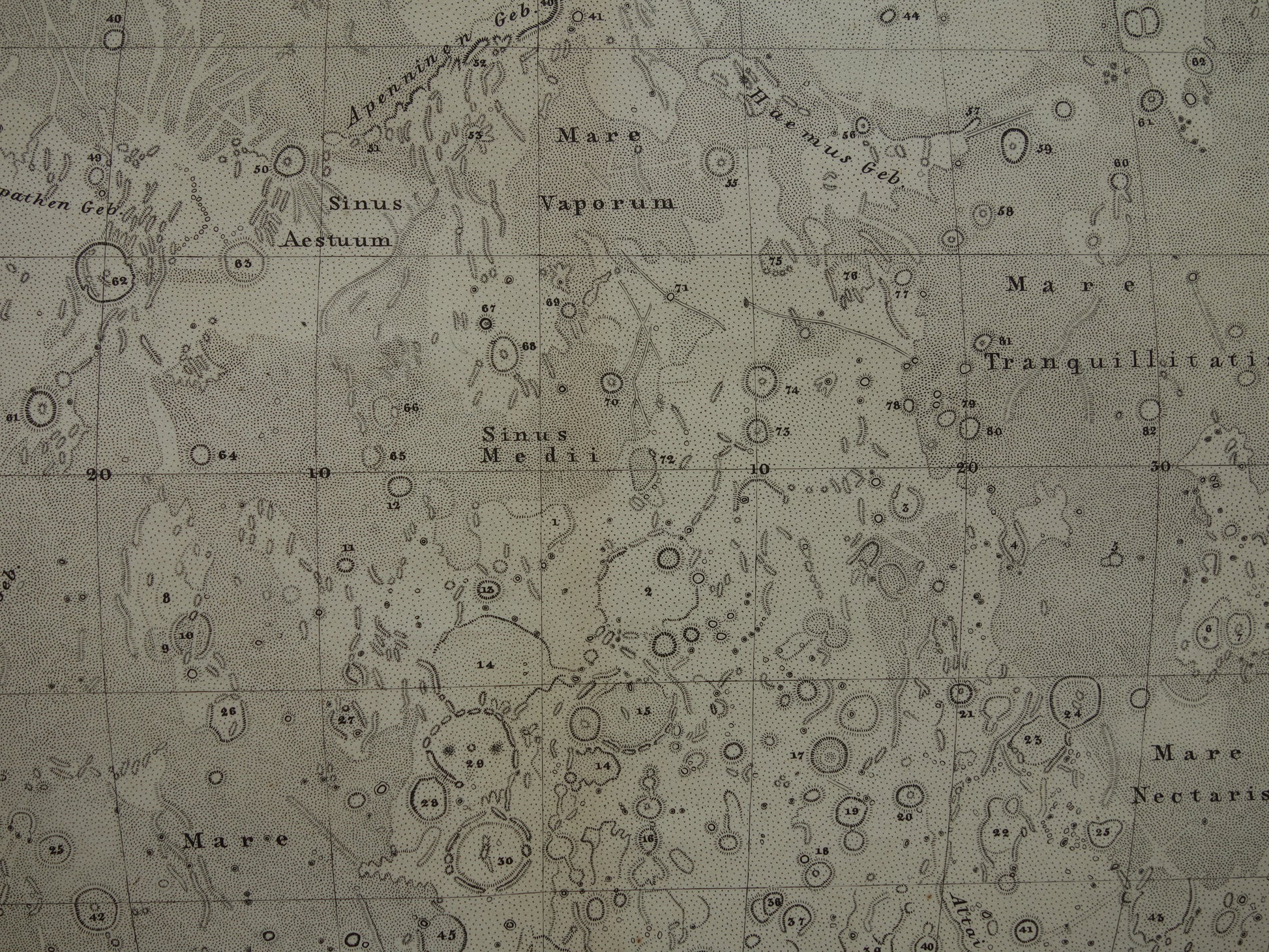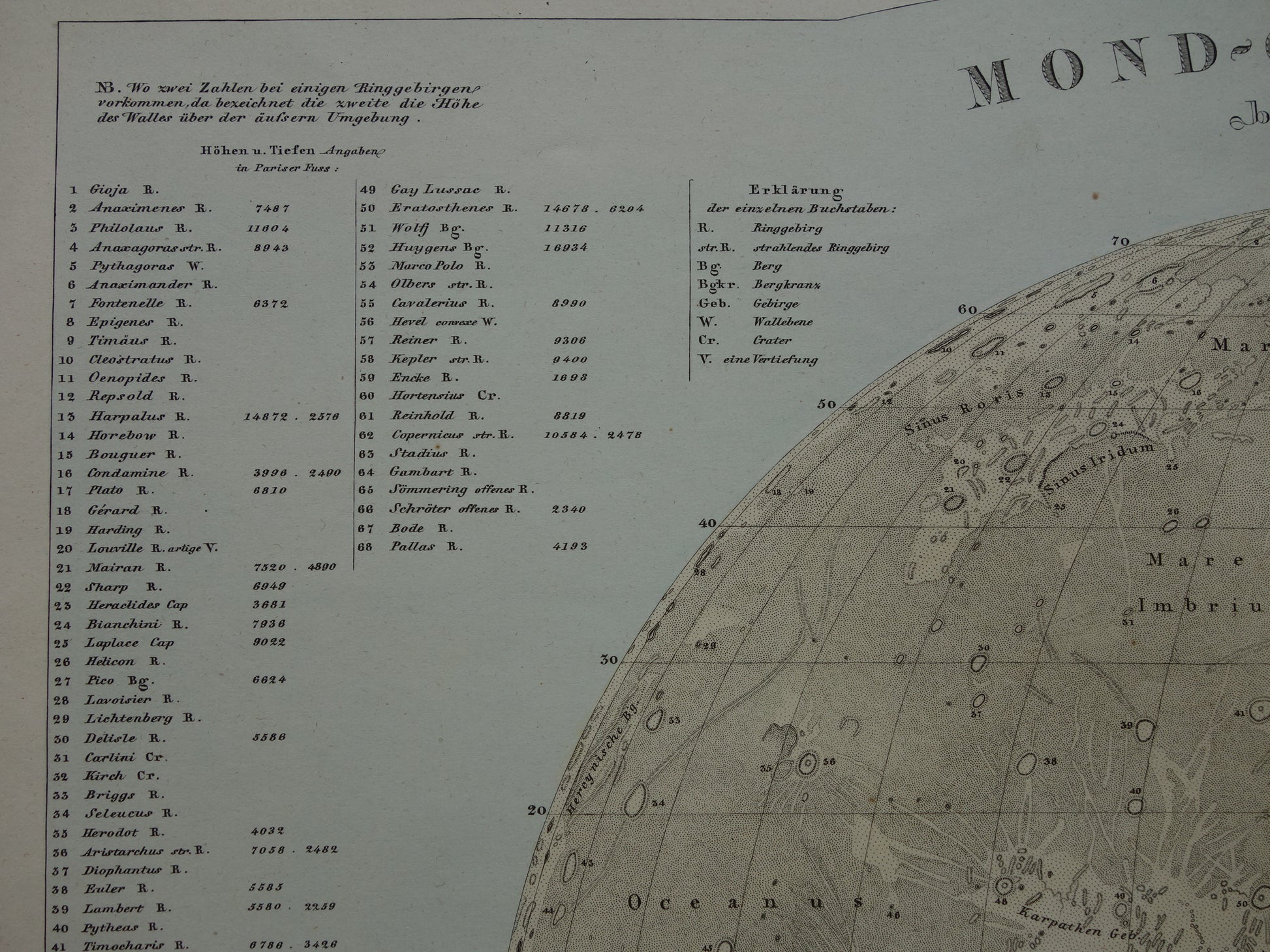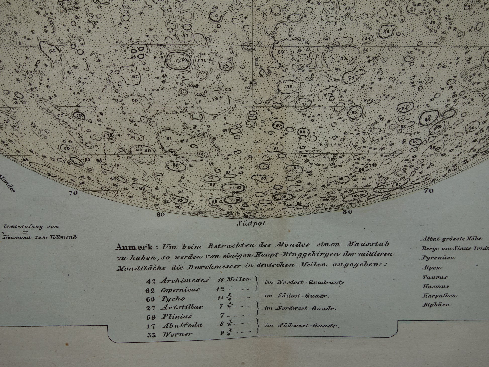 Te koop is een mooie oude kaart van de zichtbare zijde van de maan uit het jaar 1880. Rondom staan per kwadrant de namen van de grootste/bekendste kraters en toppen met de hoogte/diepte. Linksonder staat het jaartal 1880 afgedrukt.