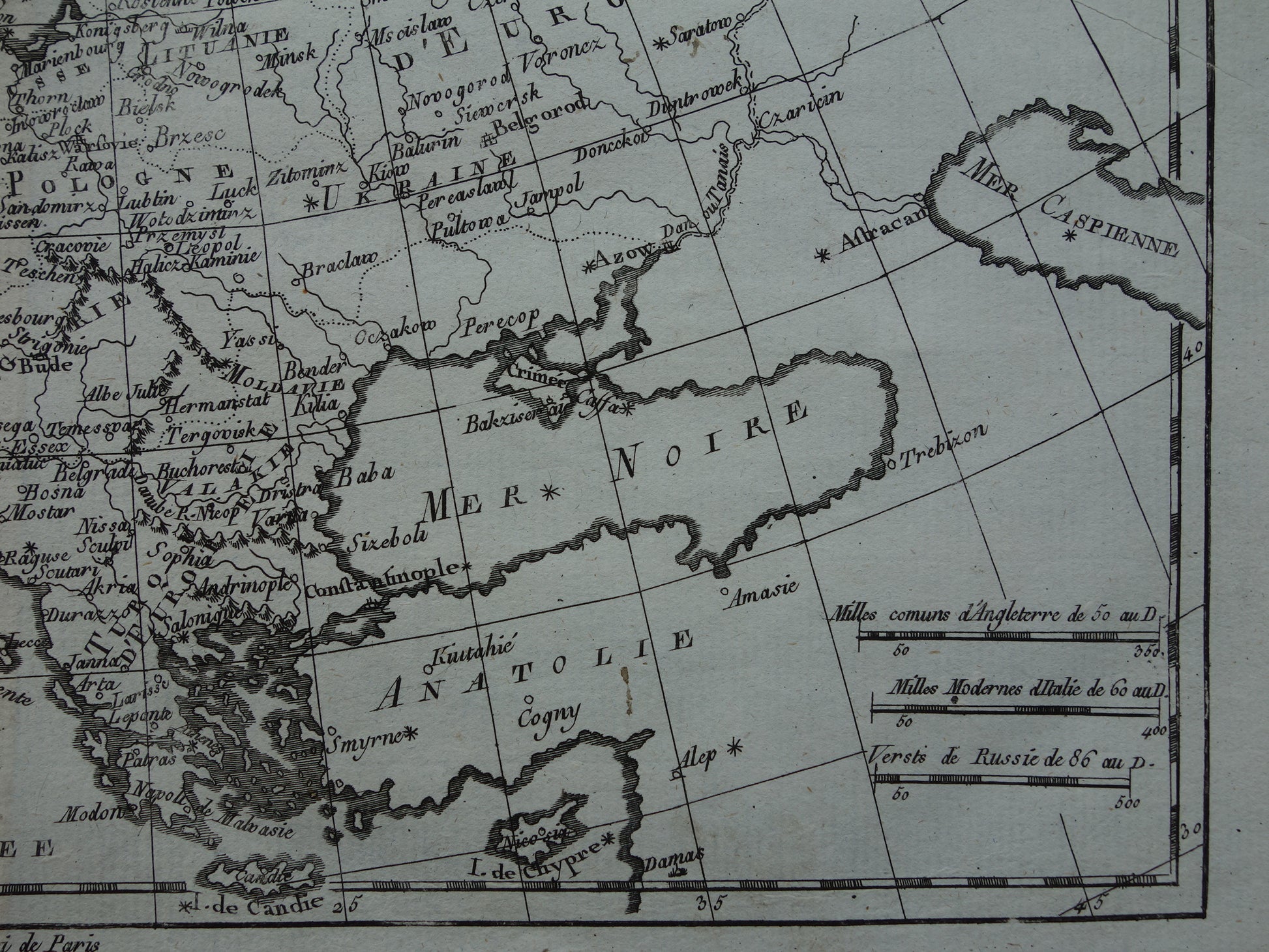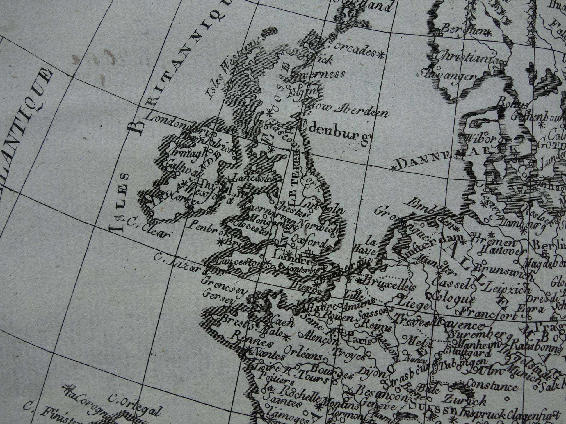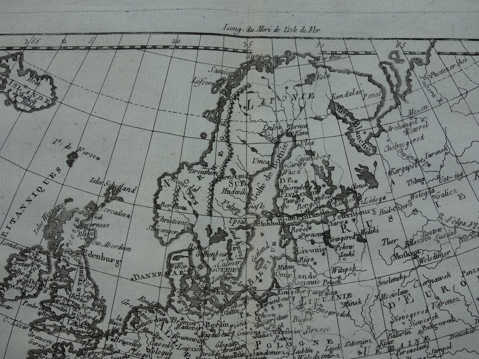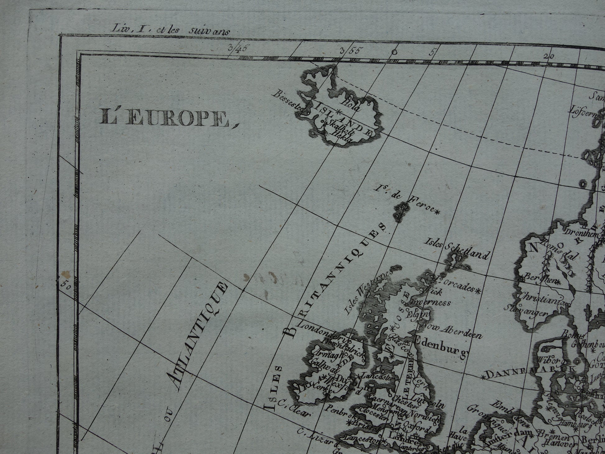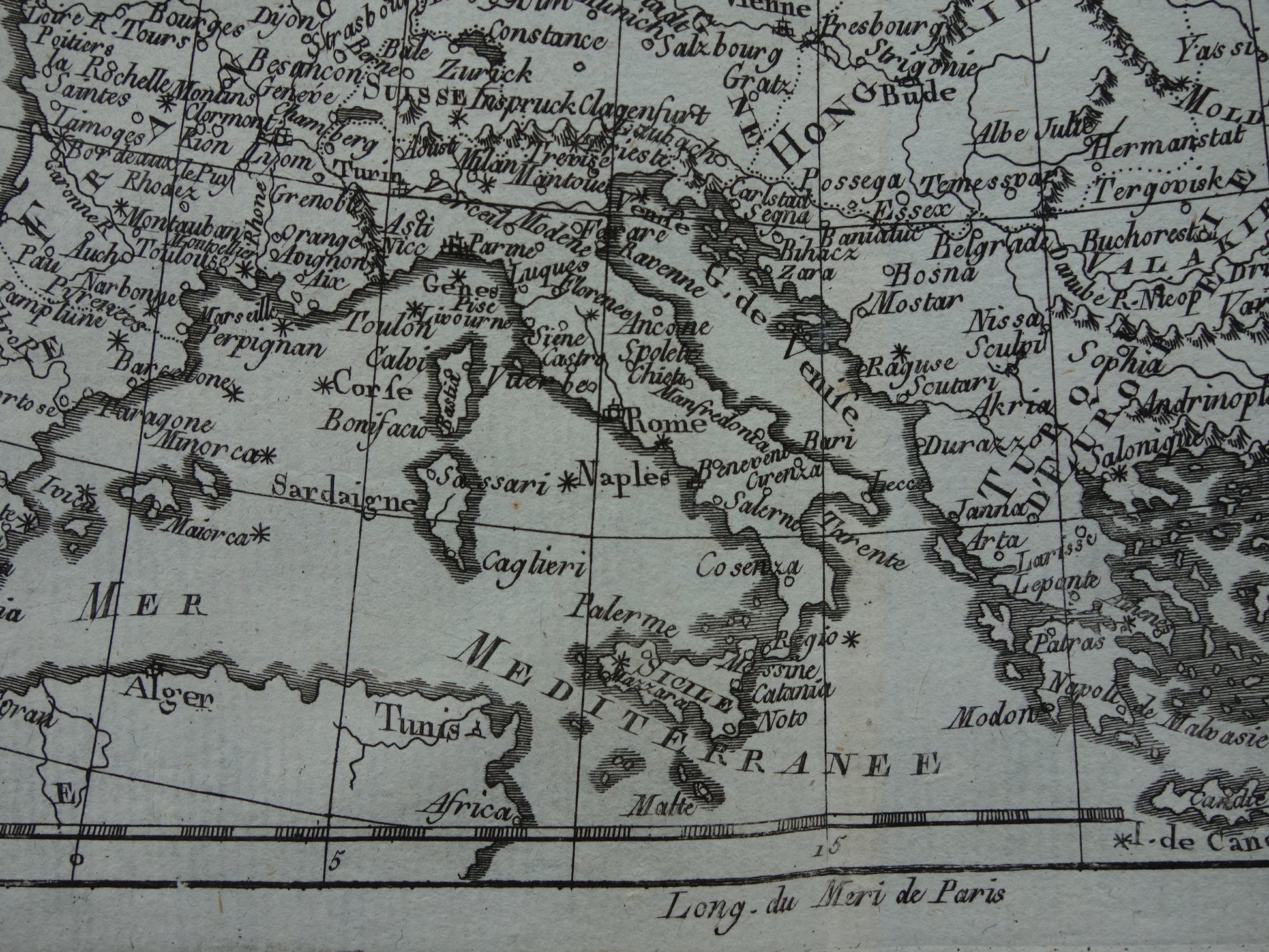 Te koop is een mooie Franse kaart van Europa. Deze 245+ jaar oude kaart is ontworpen door Rigobert Bonne en afkomstig uit de vermaarde atlas behorende bij de derde druk van 'Histoire des deux Indes' van Raynal. De kaart is erg gedetailleerd, zoom de foto's om dat goed te zien. Erg fraai om in te lijsten.