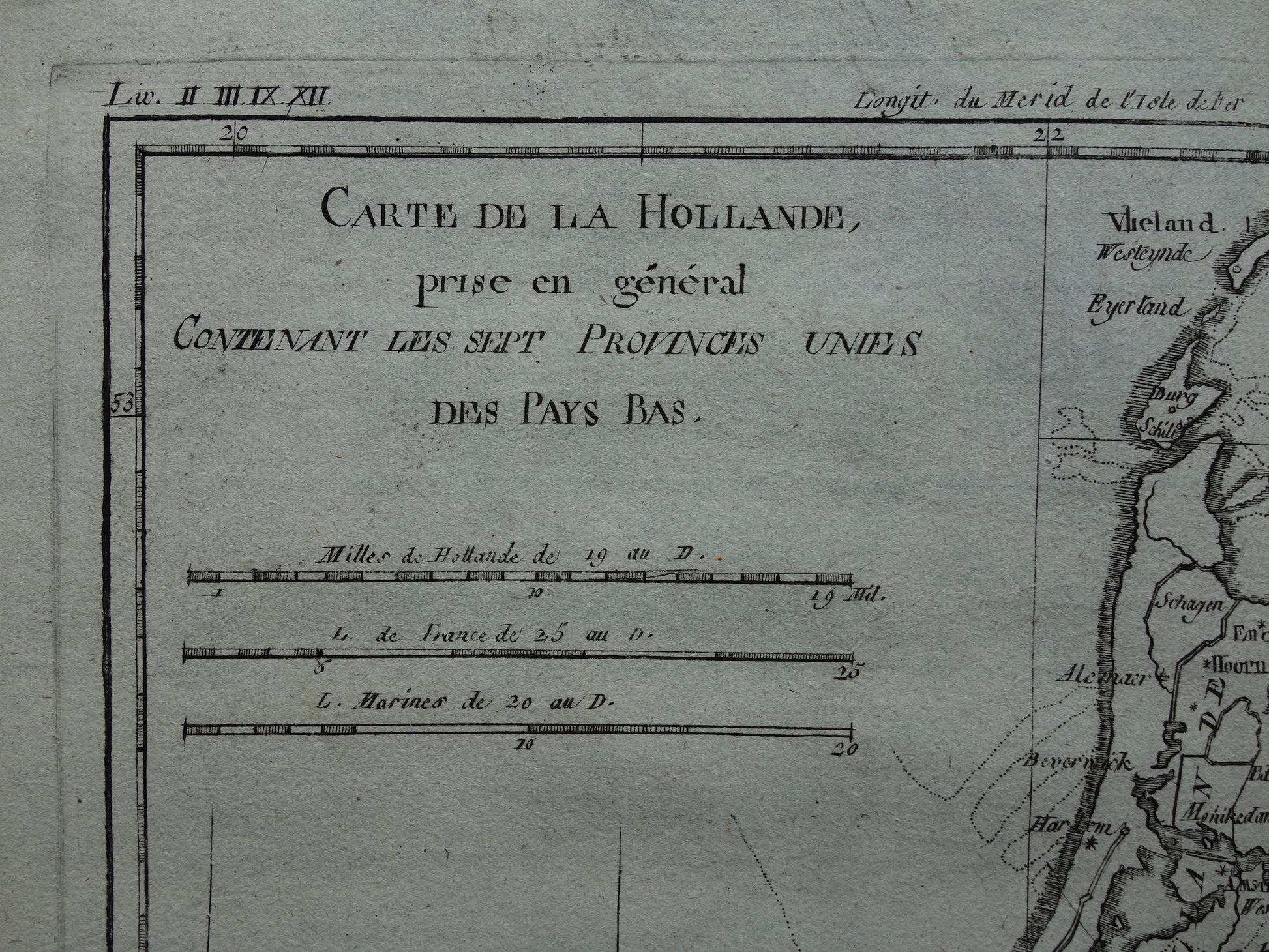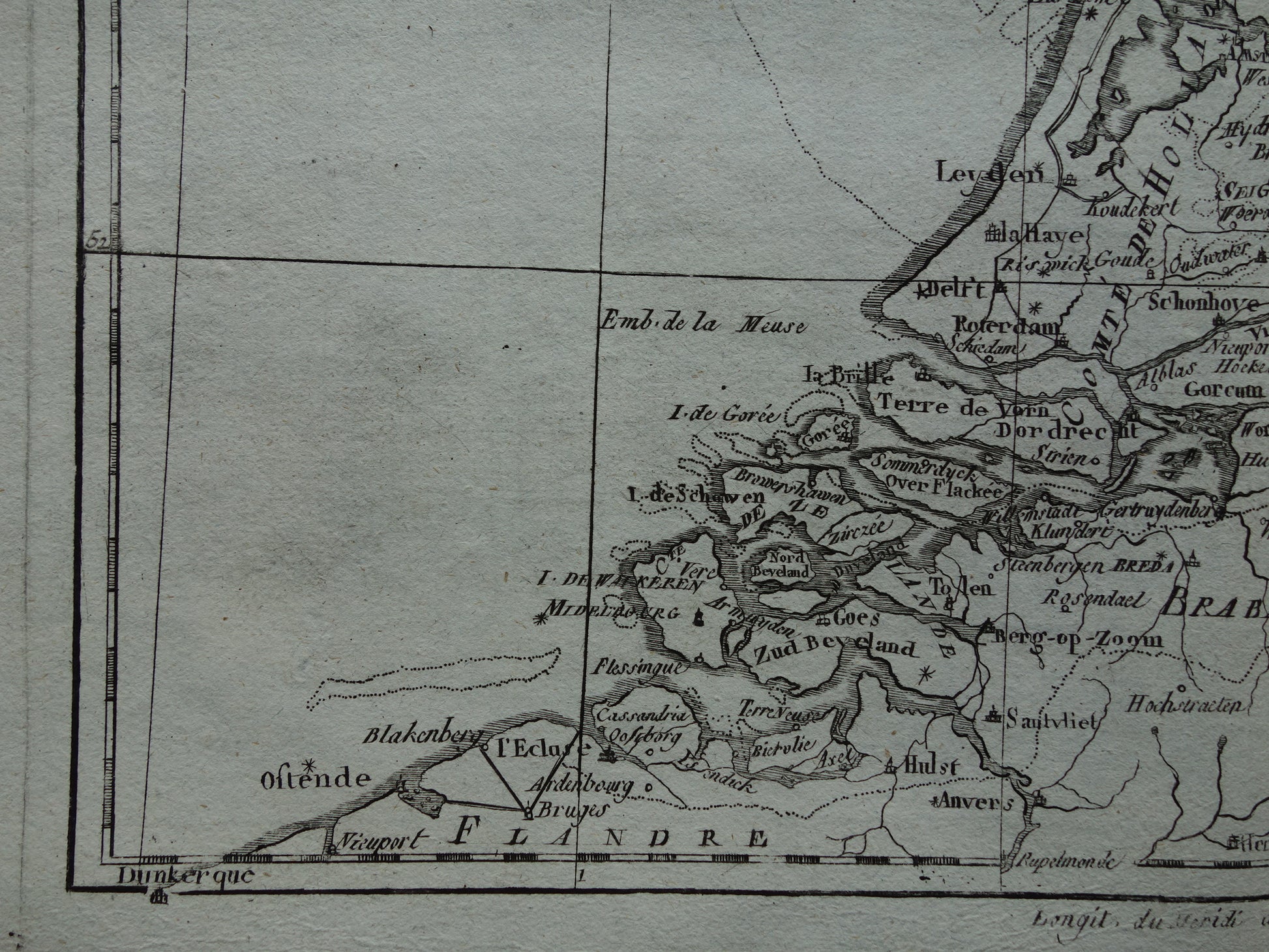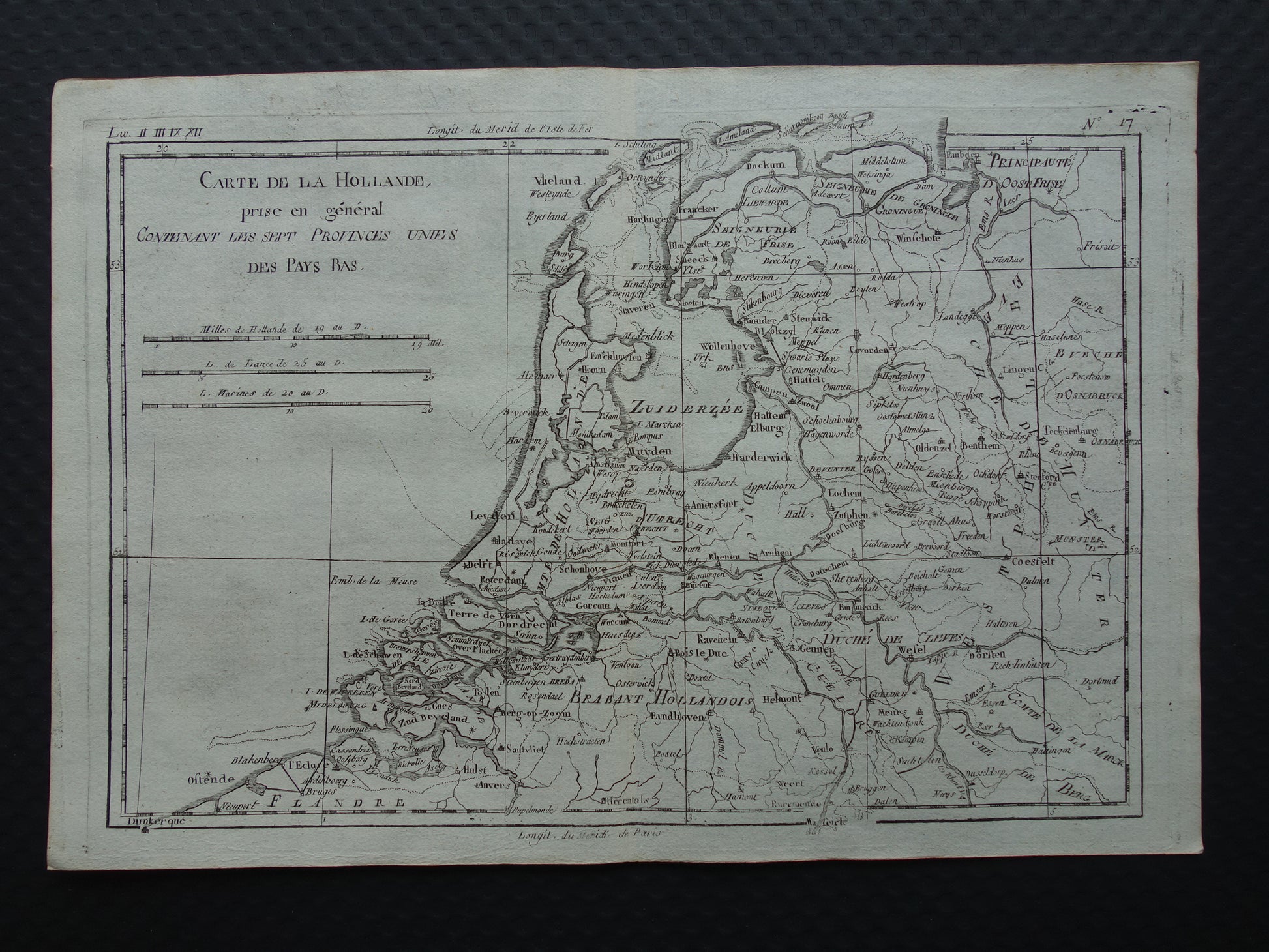 Te koop is een mooie antieke kaart van Nederland. Deze Franse kaart is ontworpen door de bekende cartograaf Rigobert Bonne en afkomstig uit de atlas behorende bij de derde druk van 'Histoire des deux Indes' van Raynal. Erg fraai om in te lijsten.