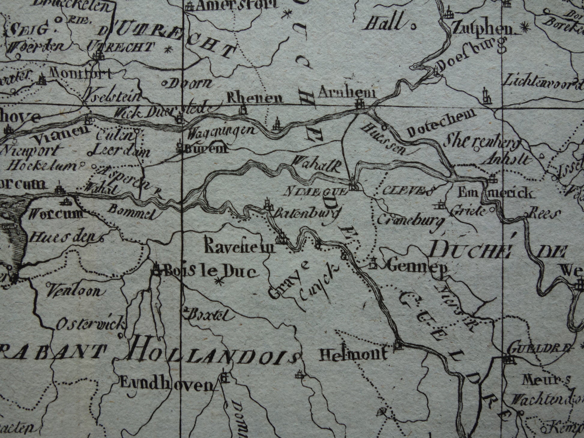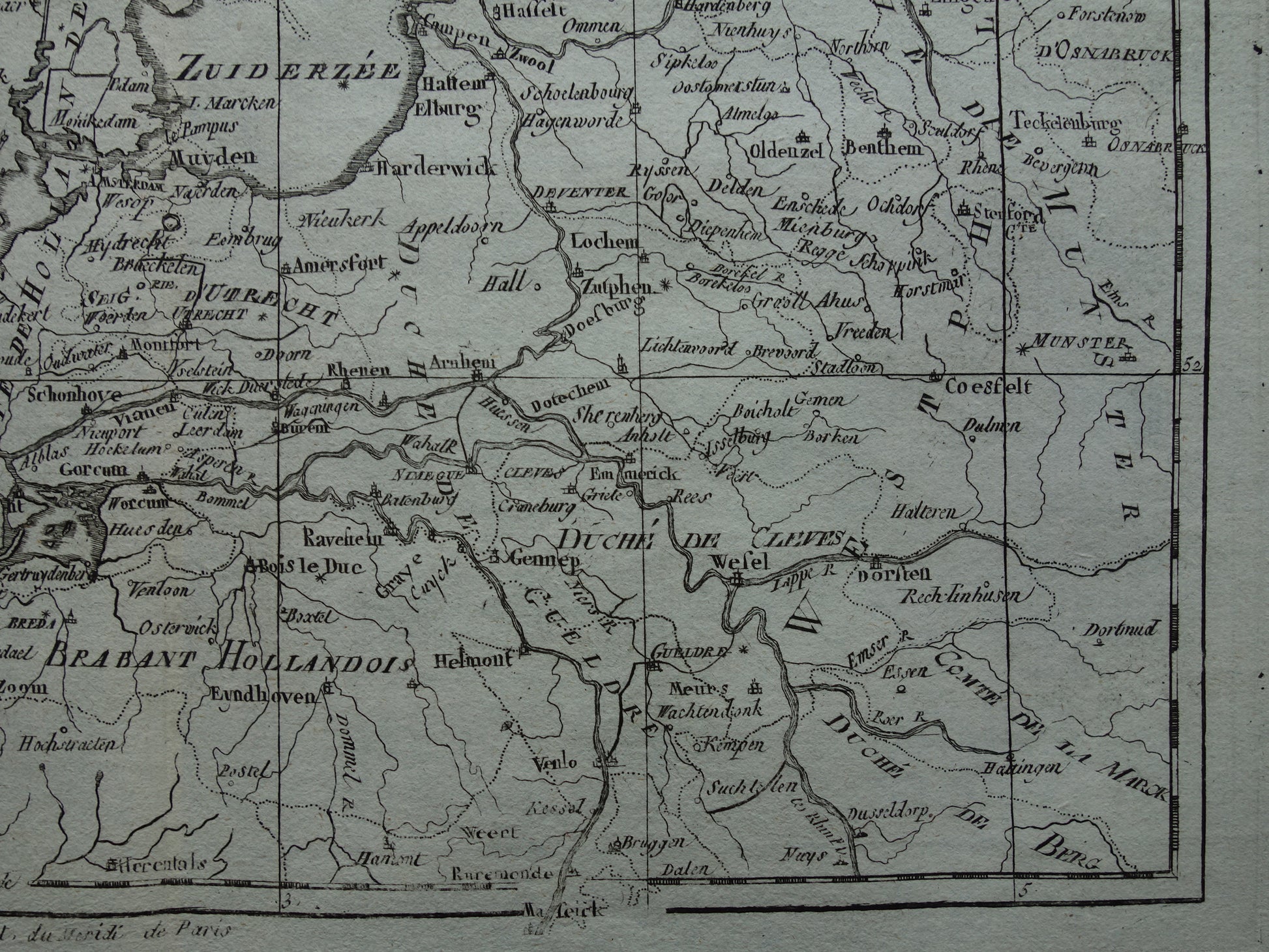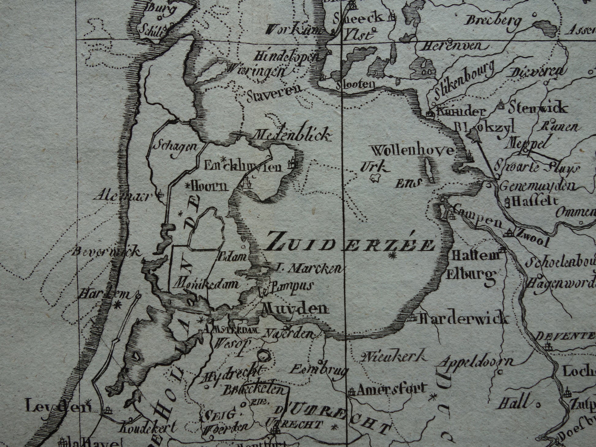Te koop is een mooie antieke kaart van Nederland. Deze Franse kaart is ontworpen door de bekende cartograaf Rigobert Bonne en afkomstig uit de atlas behorende bij de derde druk van 'Histoire des deux Indes' van Raynal. Erg fraai om in te lijsten.