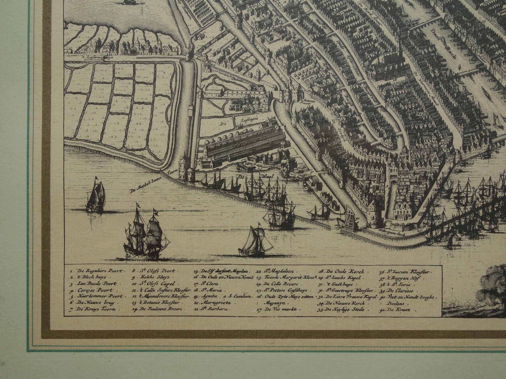 For sale is a framed map of Amsterdam in the year 1500. This map was published by Commelin in 1693 in "Beschryvinge van Amsterdam" (Description of Amsterdam). This copy is a modern reprint of it, dating from the 1670s or 1680s.