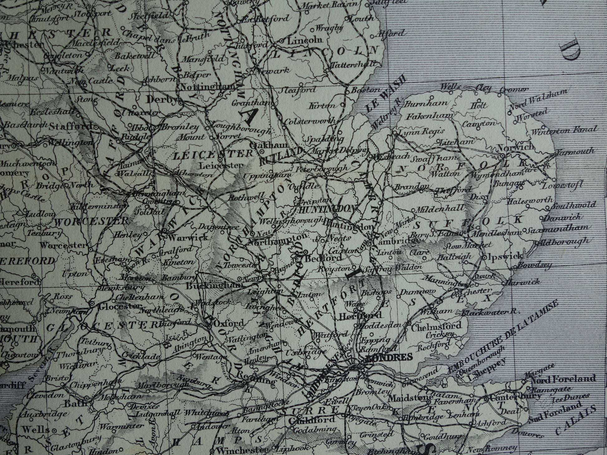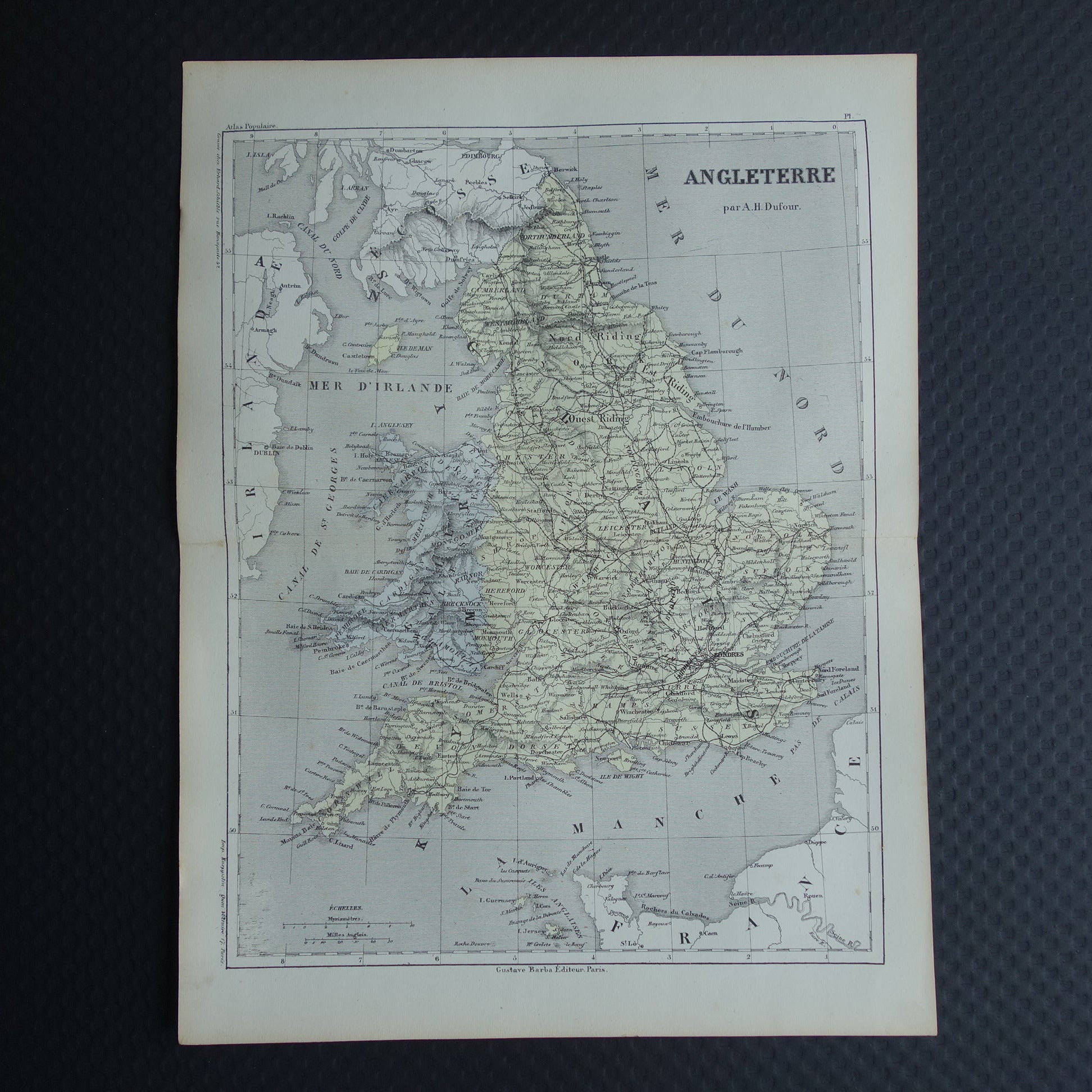 Te koop is een oude Franse landkaart van Engeland en Wales. De kaart is met de hand ingekleurd. Mooie ruime marges rondom en zeer geschikt om in te lijsten.