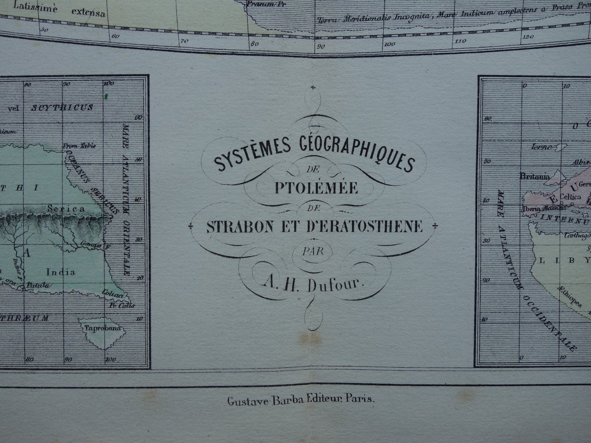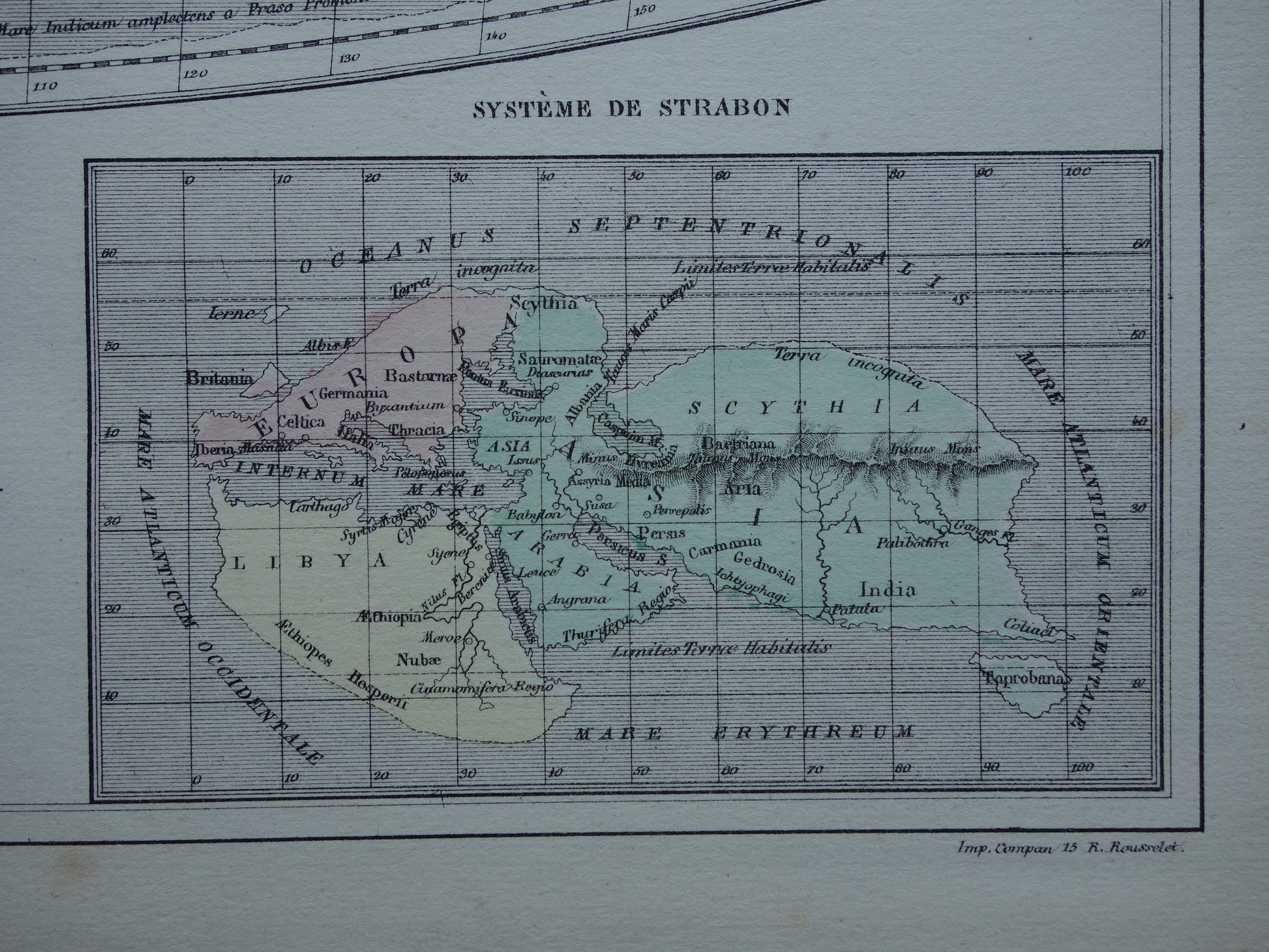 Te koop is een antieke Franse print over de geschiedenis van de cartografie. Er staan wereldkaarten op van Strabo, Ptolemaeus (hoofdkaart) en Eratosthenes. De kaart is met de hand ingekleurd.