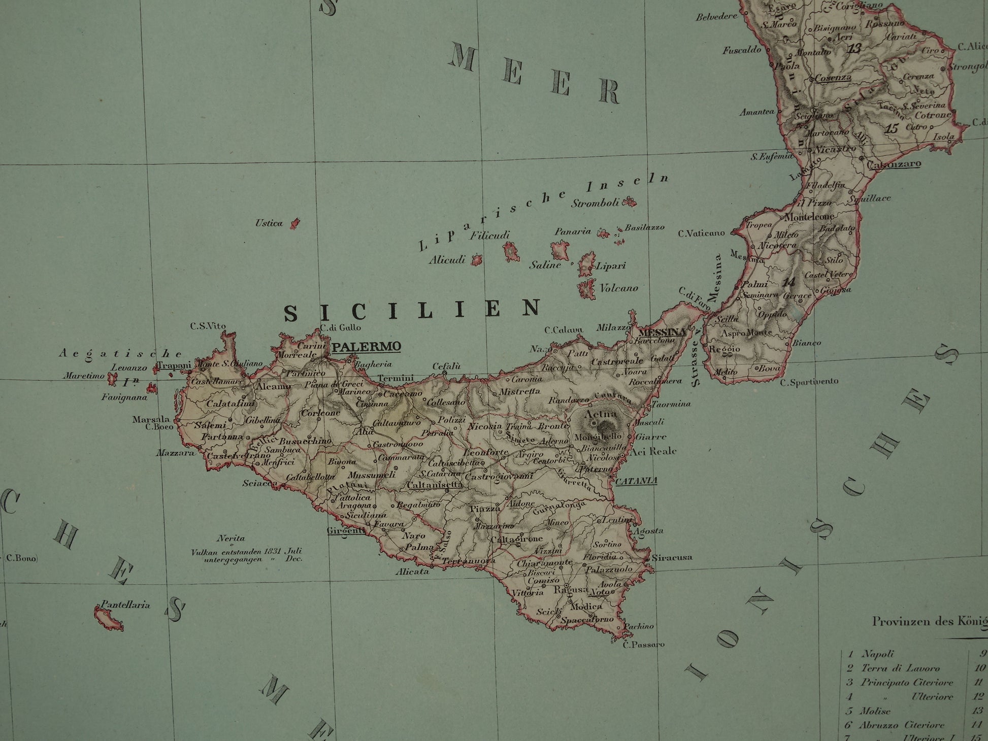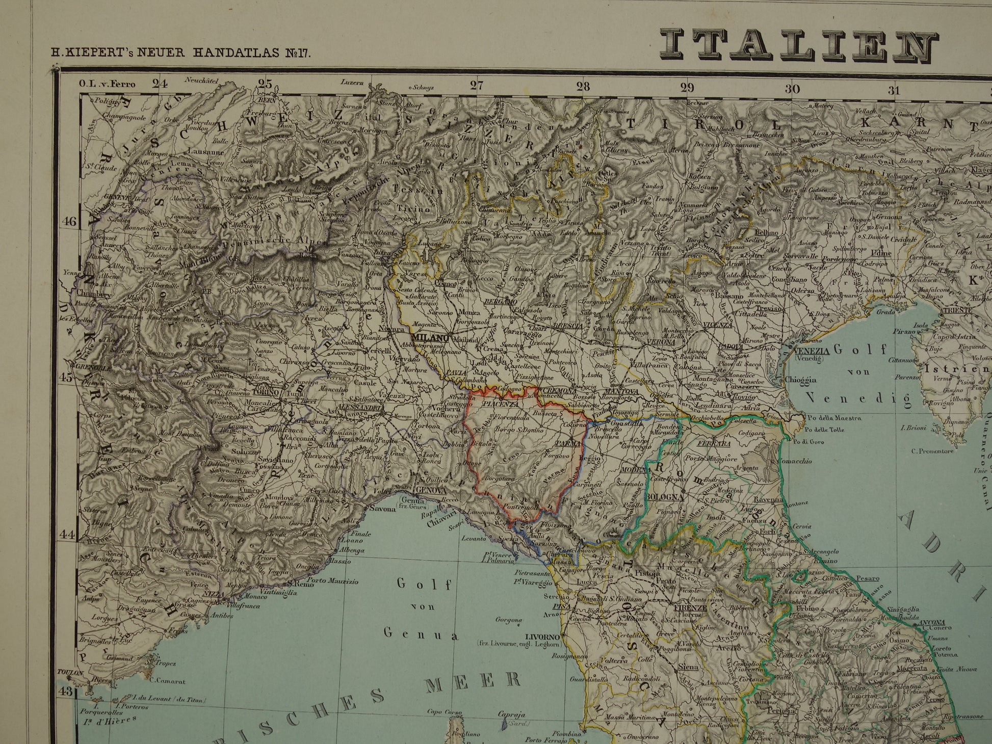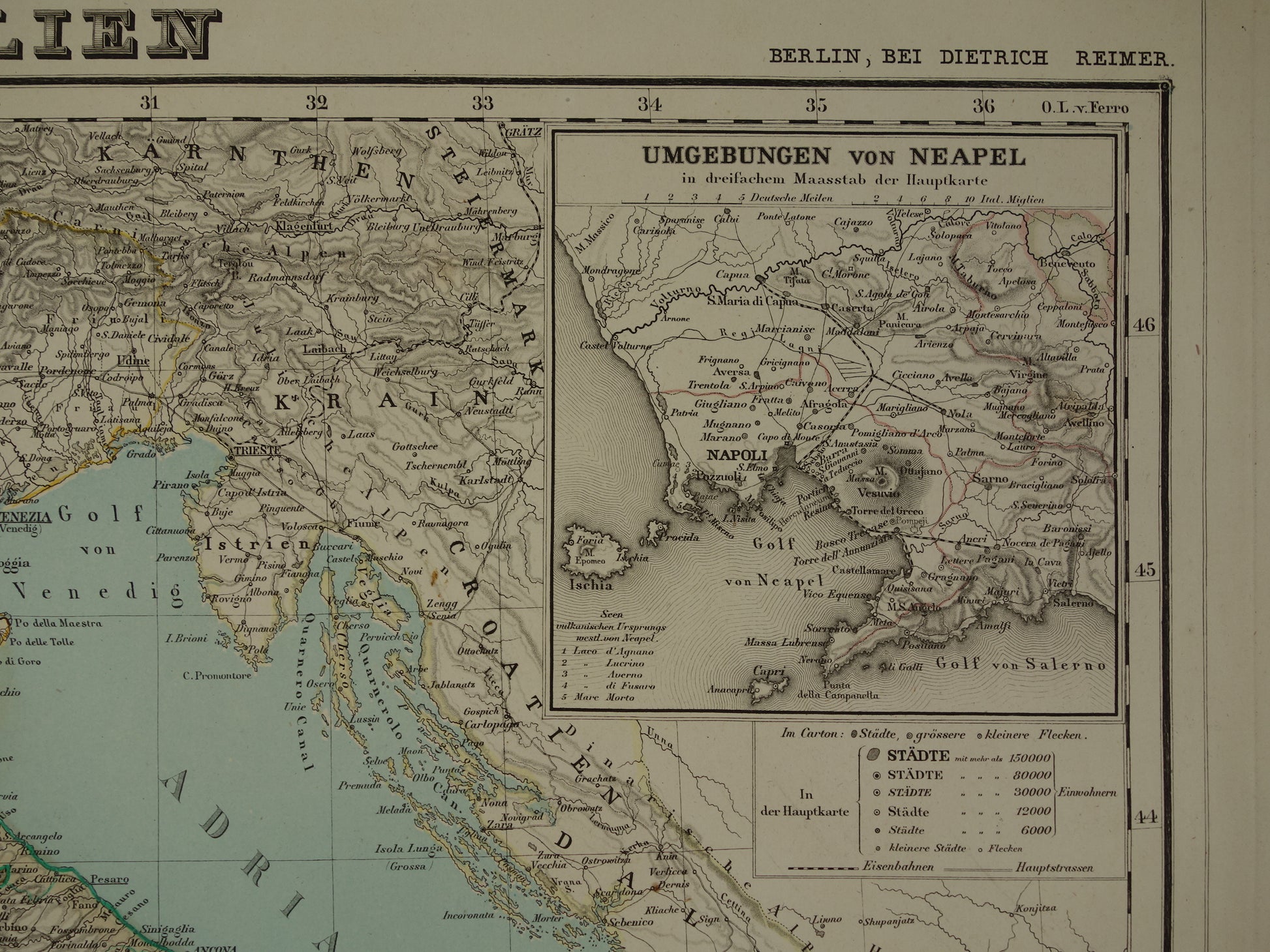 Te koop is een antieke Duitse kaart van Italië in het jaar 1855 (het jaartal 1855 staat klein gedrukt onderaan de kaart). De grenzen zijn met de hand ingekleurd. Mooie ruime marges en zeer geschikt om in te lijsten.