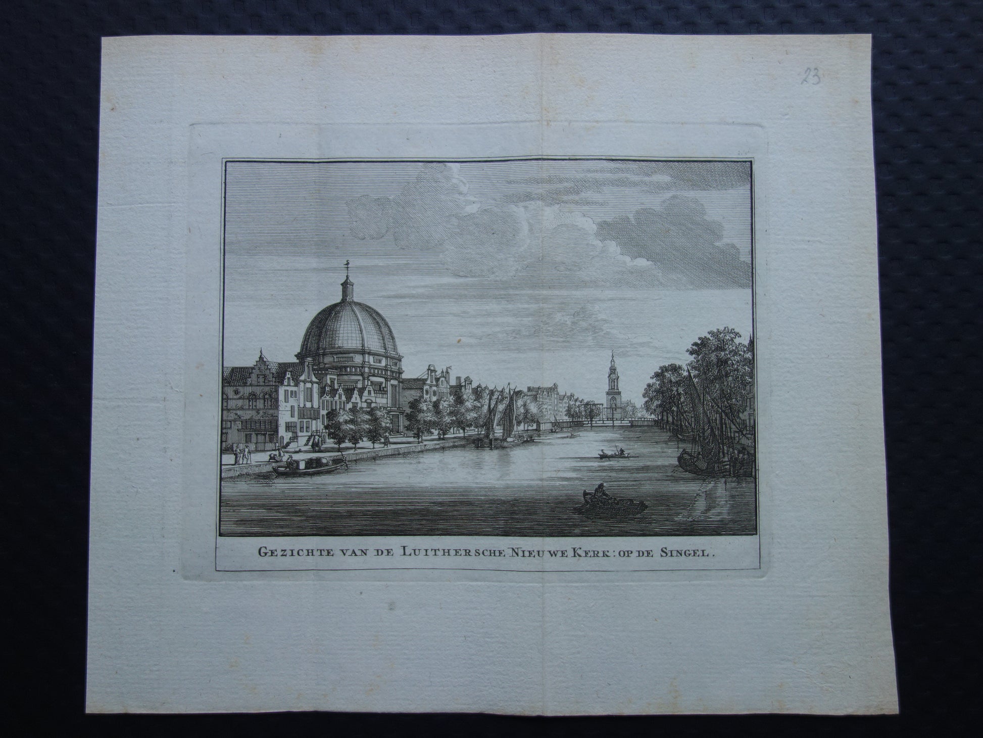 Te koop is een antieke prent van de het Singel in Amsterdam met zicht op de Ronde Lutherse Kerk / Koepelkerk (de kerk is na een vernietigende brand in 1822 in andere stijl herbouwd) en in de verte de Westertoren. De gravure is heel gedetailleerd, zie de foto's.