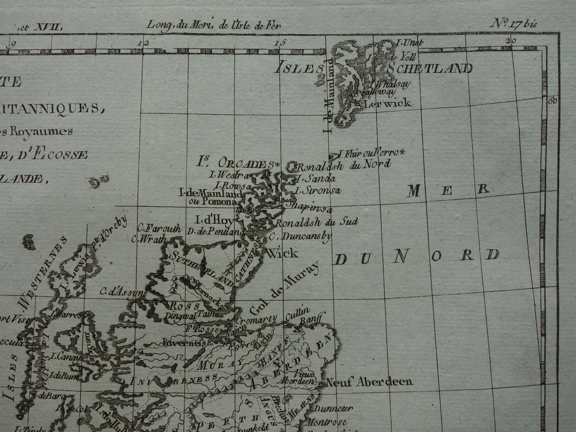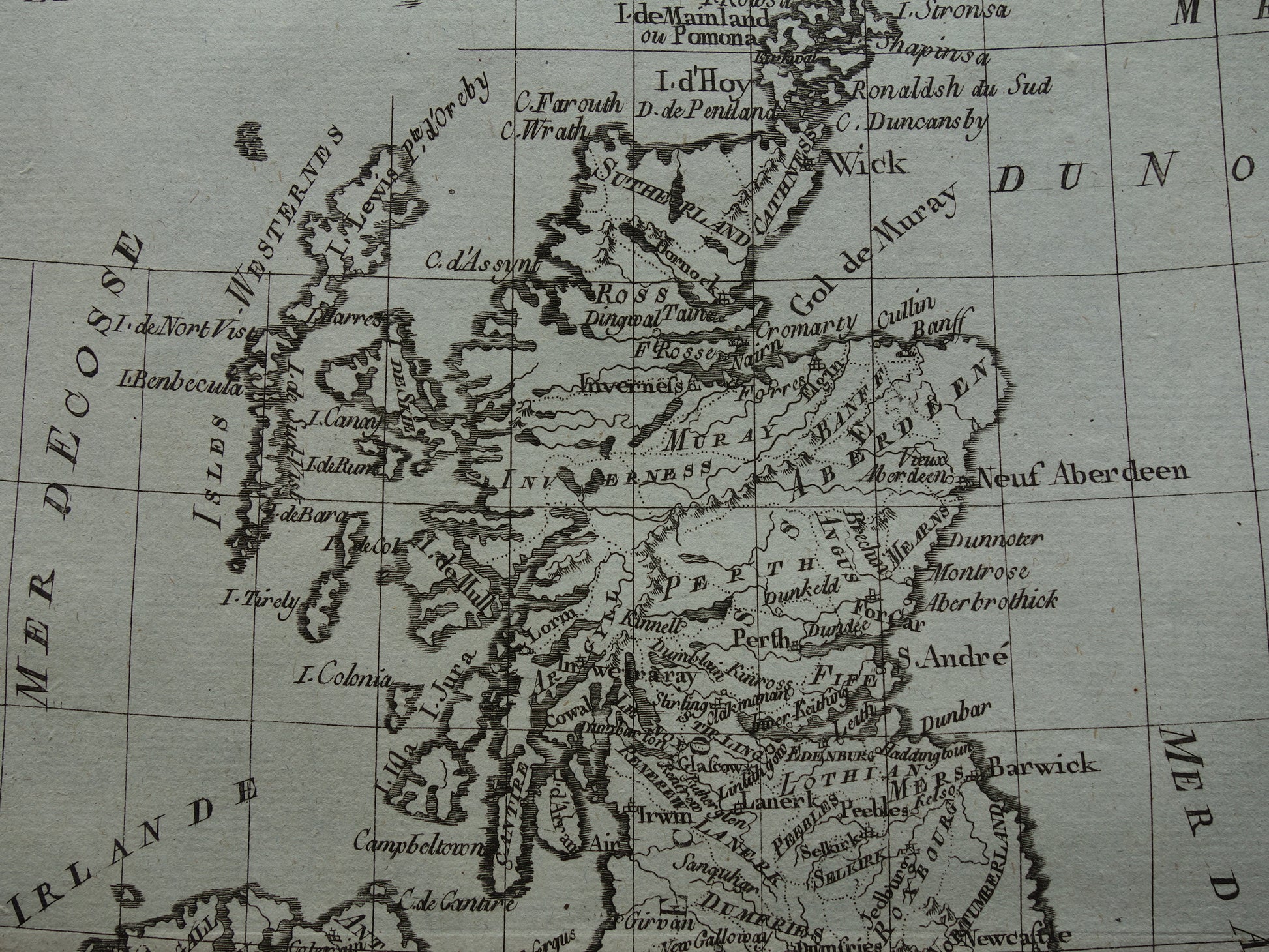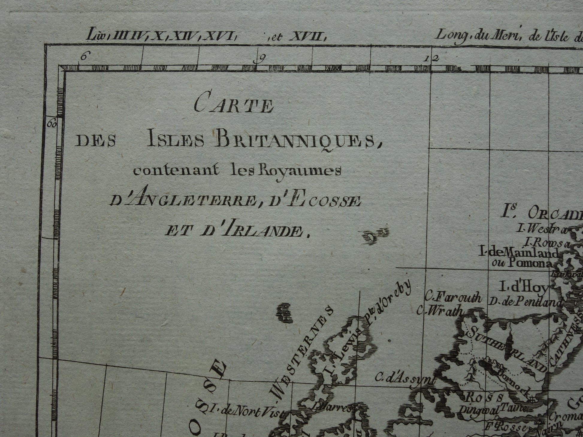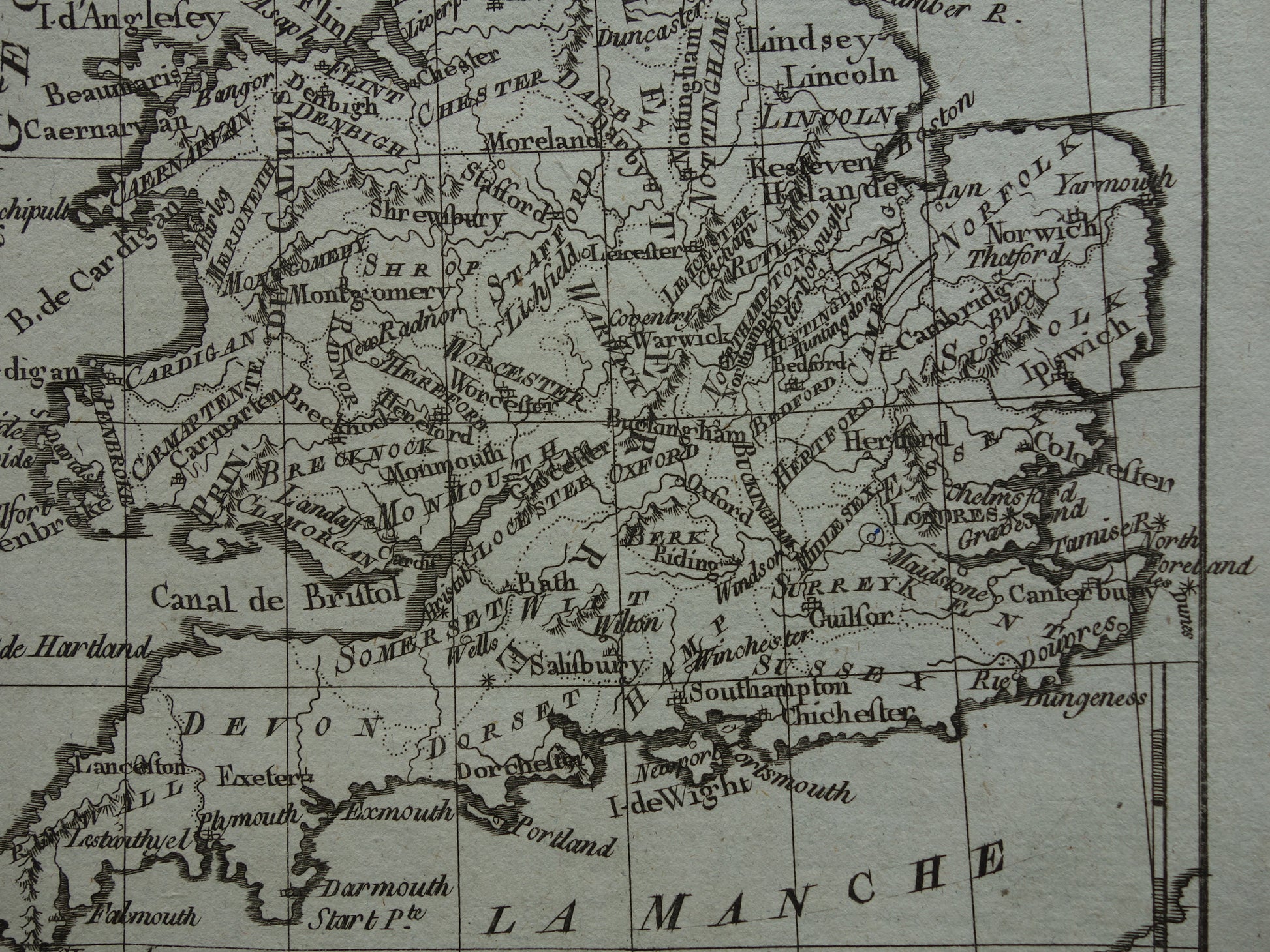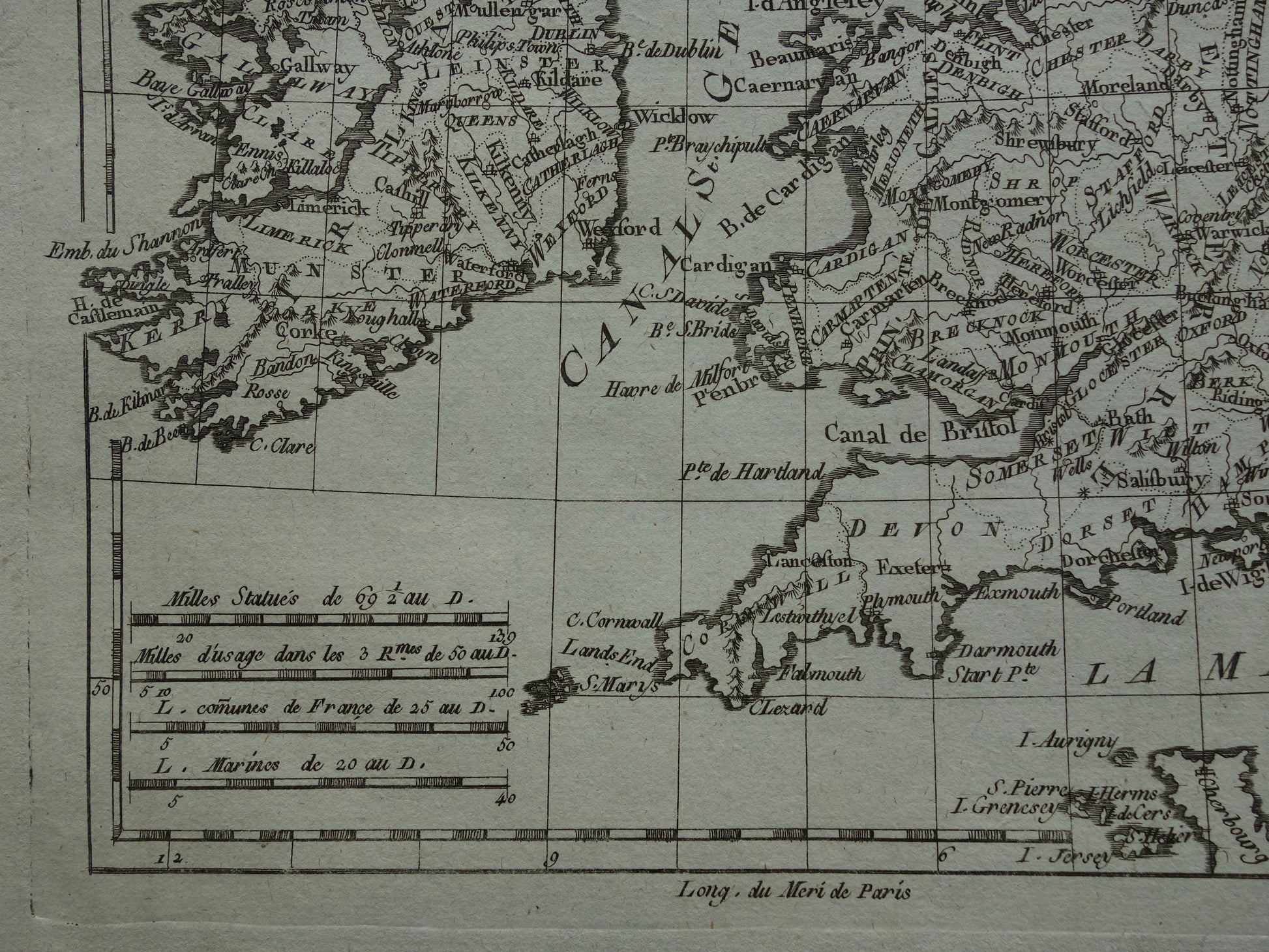 Mooie, ruim 200 jaar oude, antieke kaart van de Britse Eilanden. Het is een kopergravure gedrukt op geschept papier. Deze Franse kaart is ontworpen door de bekende cartograaf Rigobert Bonne.