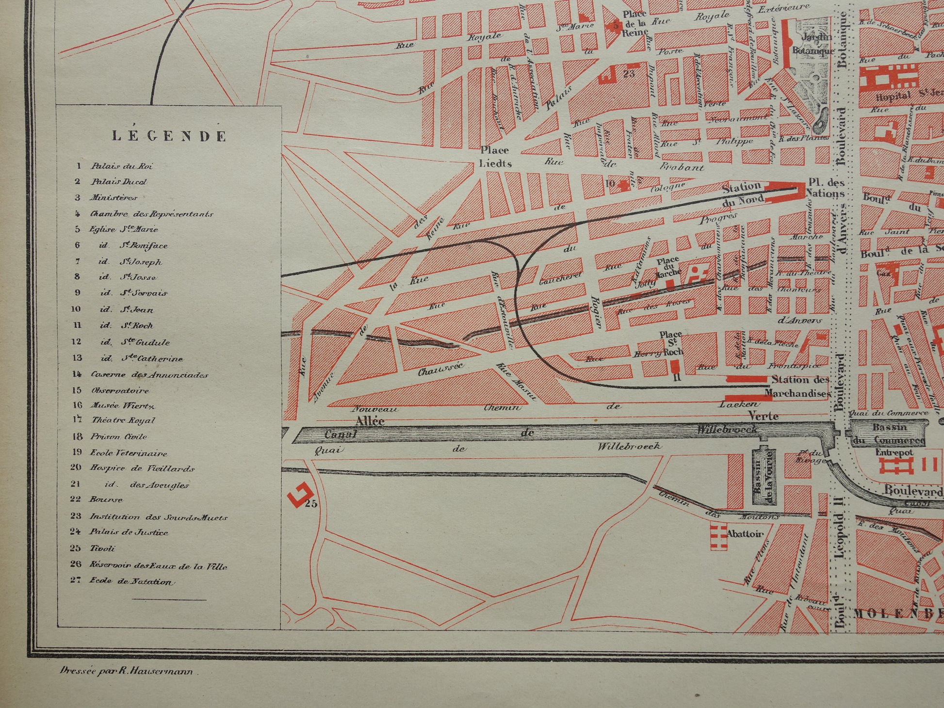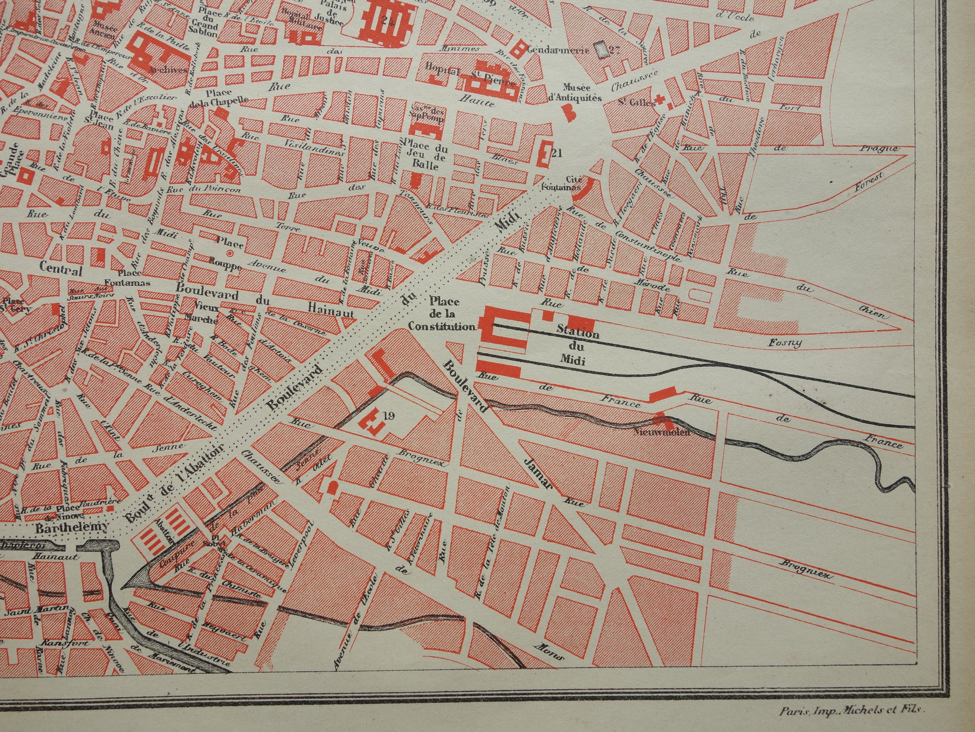 Mooie grote antieke Franse kaart van Brussel uit 1877. Linksonder is een index met 27 belangrijke plekken die op de hoofdkaart met de bijbehorende cijfers zijn aangegeven. De marges rondom maken de kaart zeer geschikt om in te lijsten.