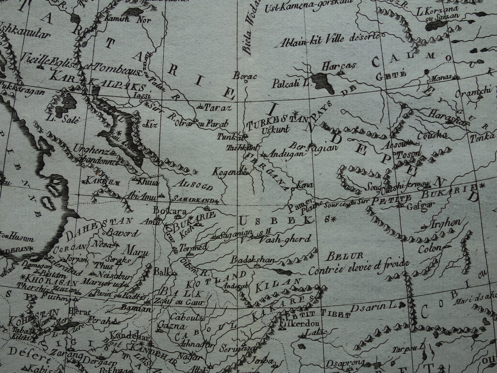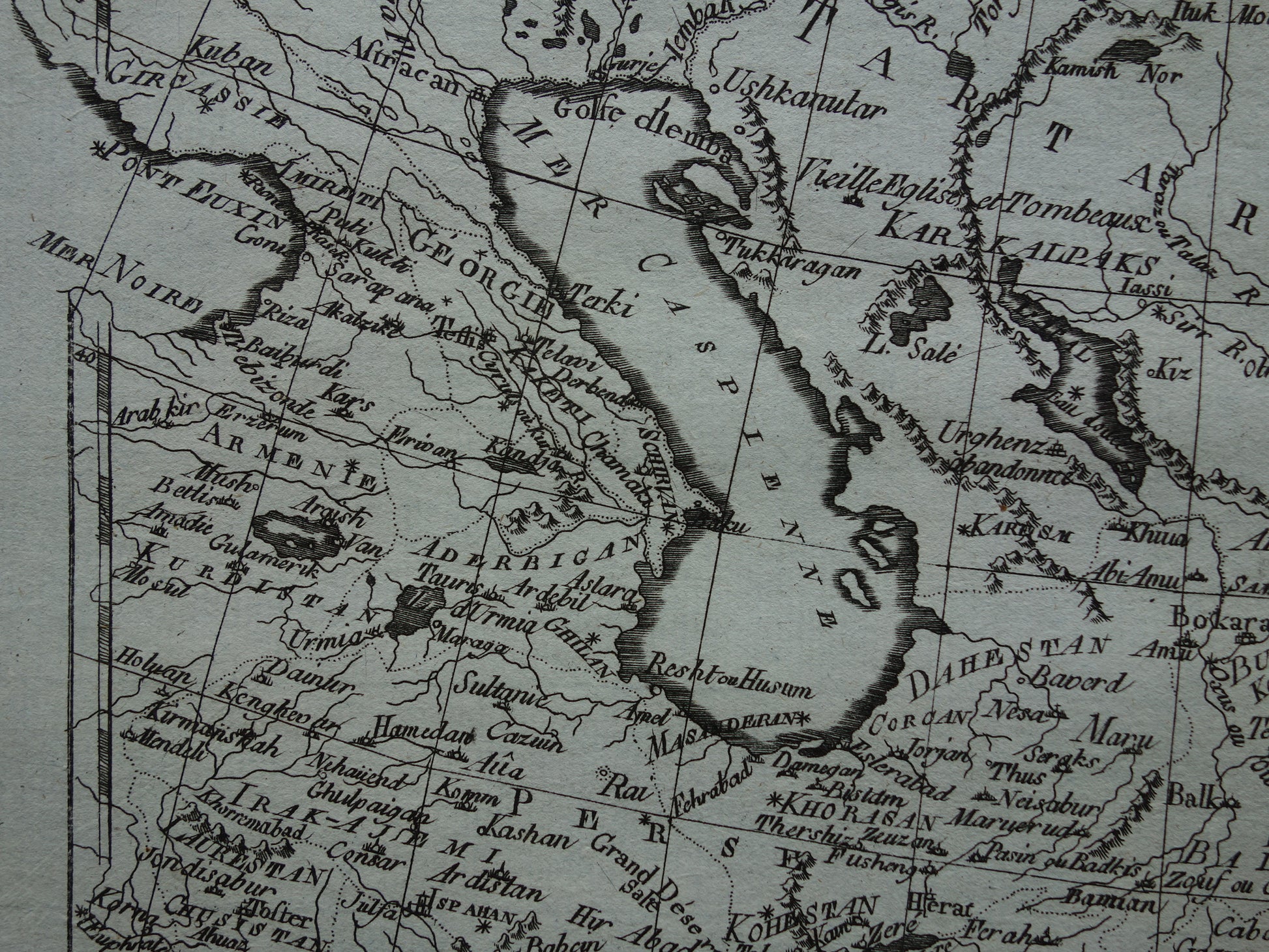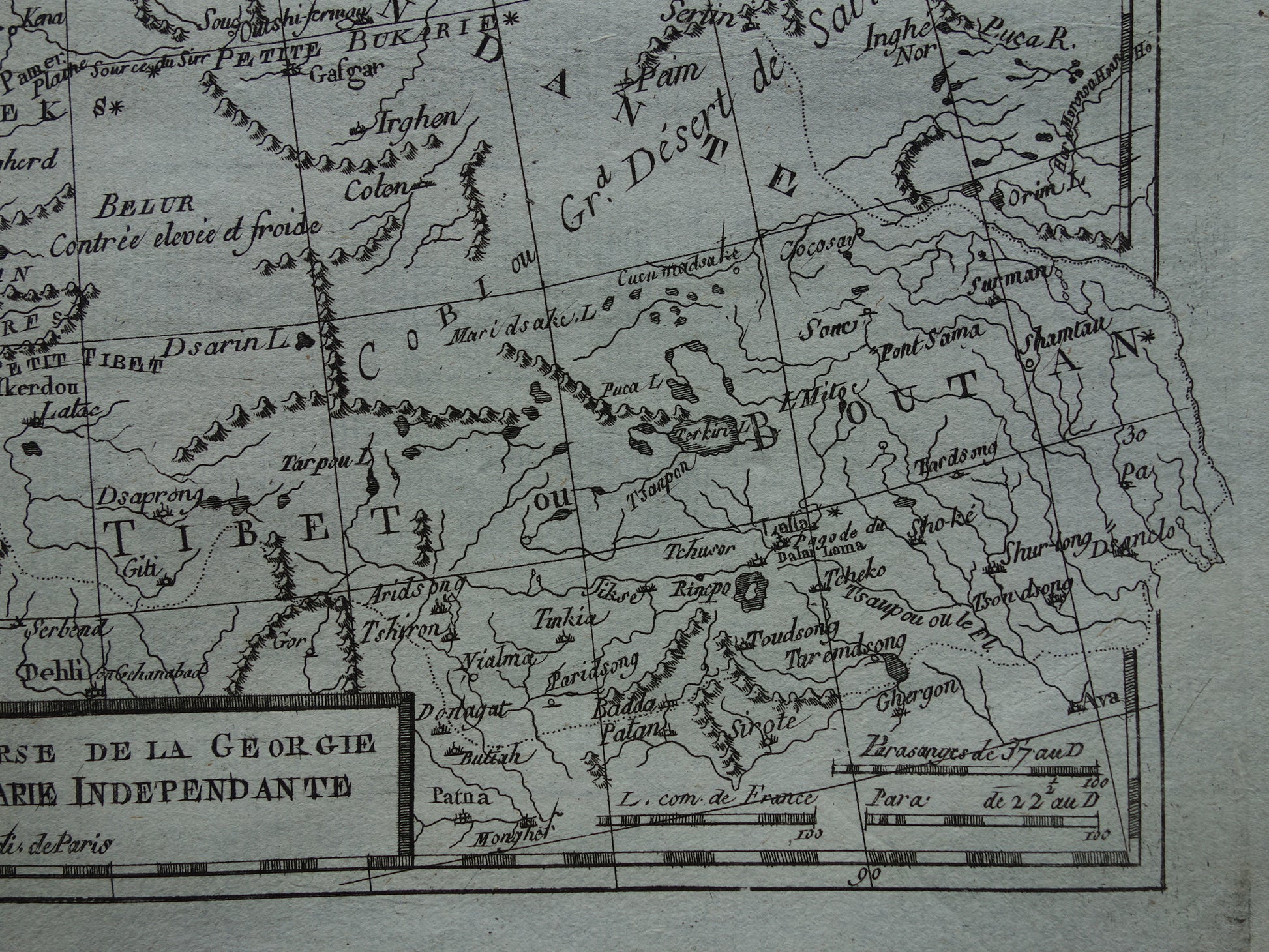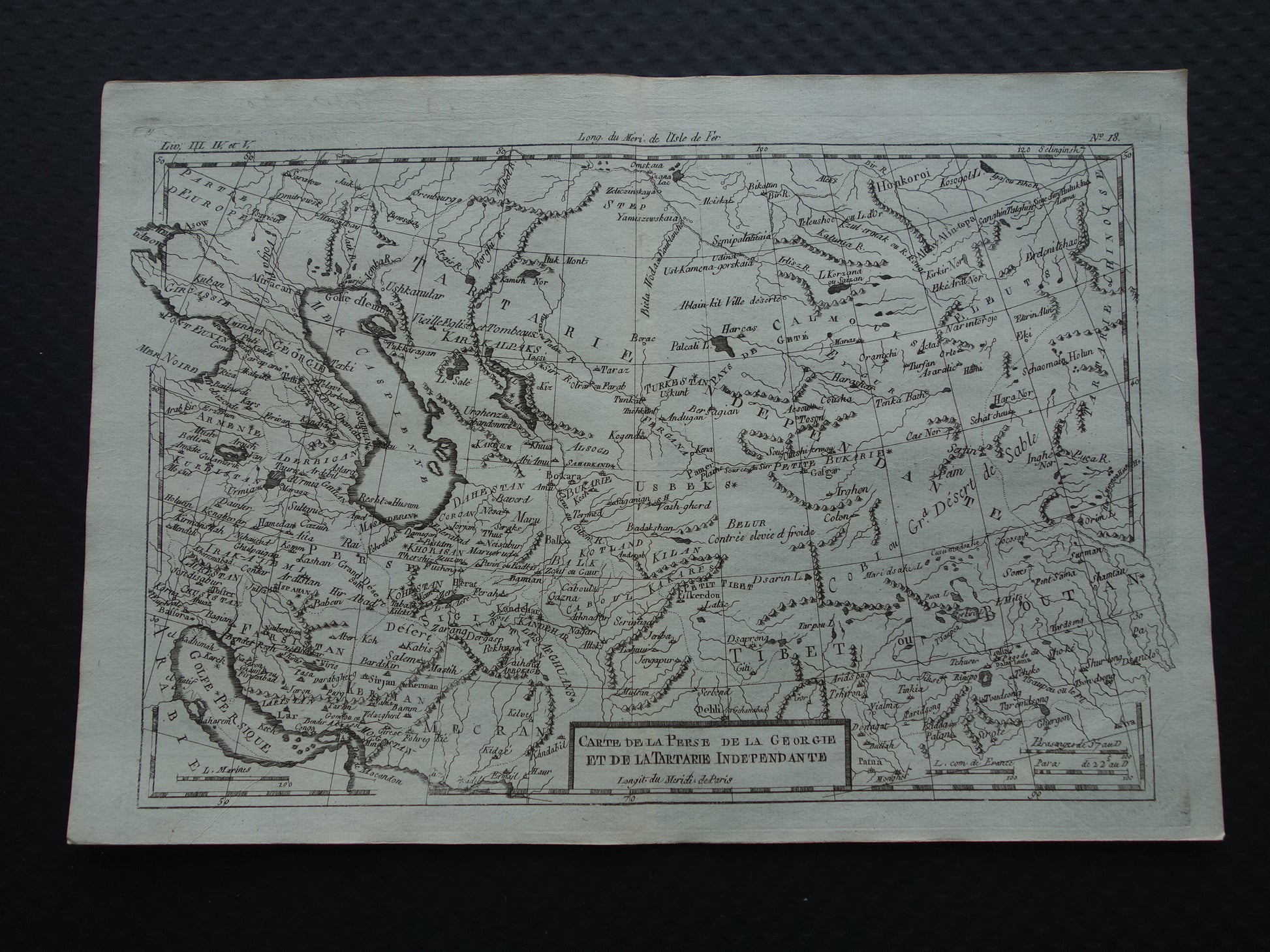 Mooie, ruim 200 jaar oude, antieke kaart van Centraal-Azië van Armenië in het westen tot Tibet en China in het oosten. Met op de kaart genoemd: Usbekistan, Eleuts, Calmouks, Petite Bukarie, Tibet ou Boutan, Meran, Kerman , Laristan, Faristan, Kotland, Khorasan, Irak-ajemi, Kurdistan, Aderbigan, Georgia, Circasssie, Karakalpaks, Step, Belur. Het is een kopergravure gedrukt op geschept papier. Deze Franse kaart is ontworpen door de bekende cartograaf Rigobert Bonne.