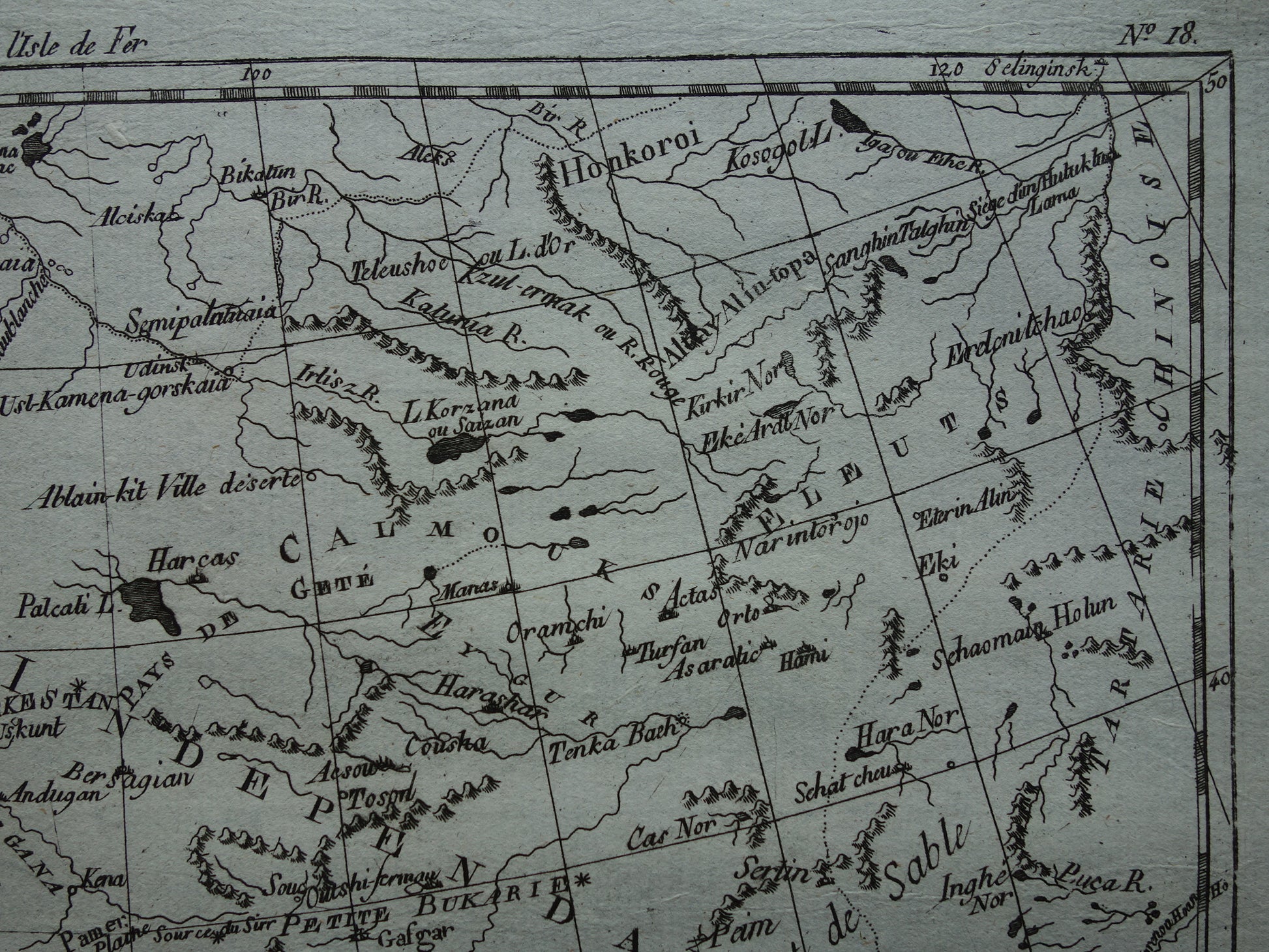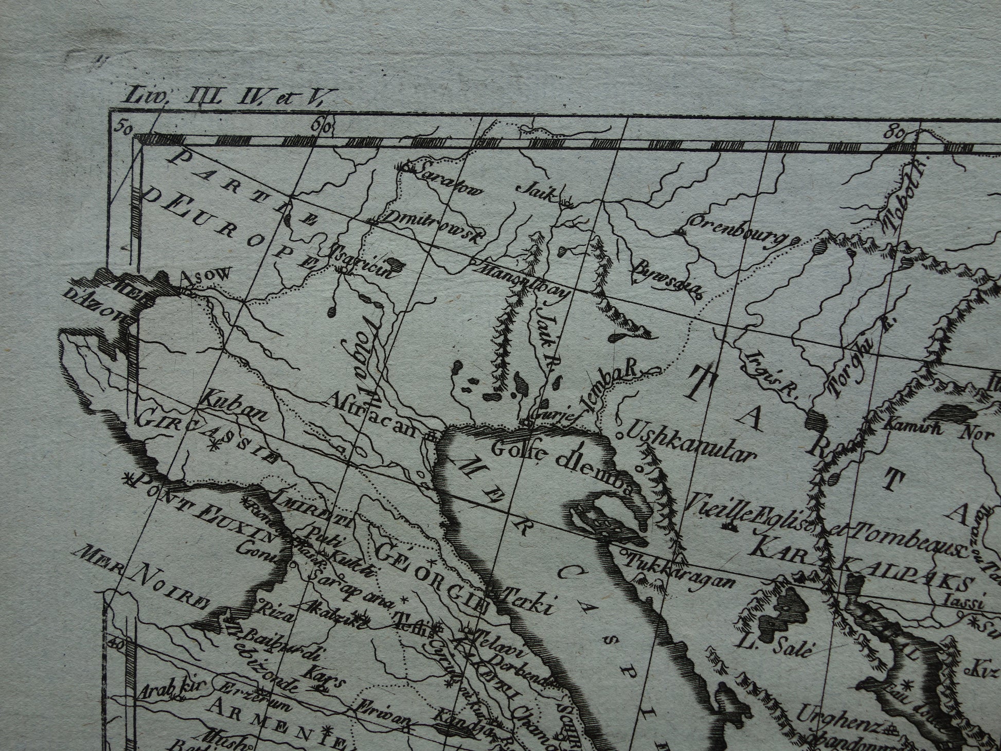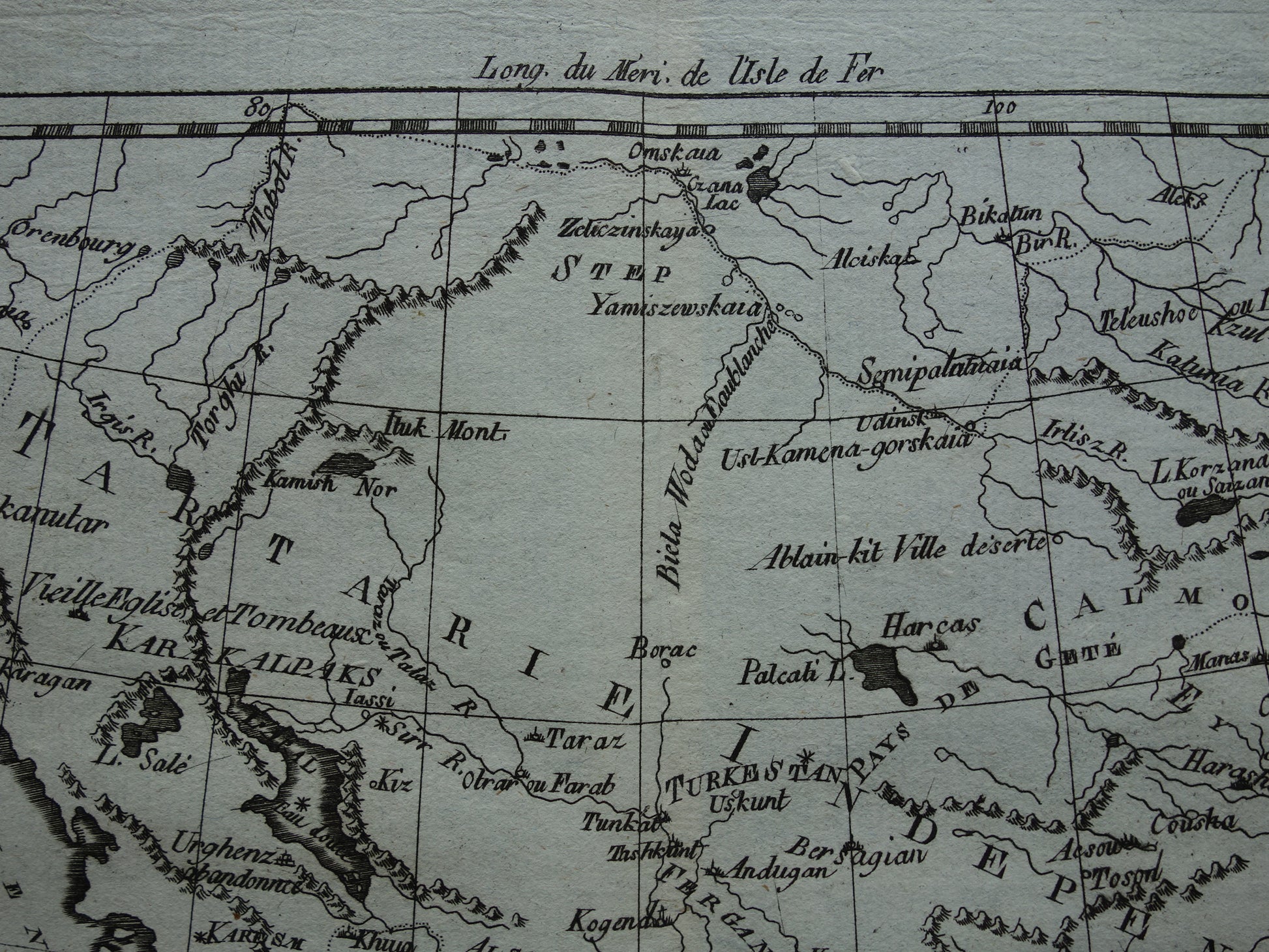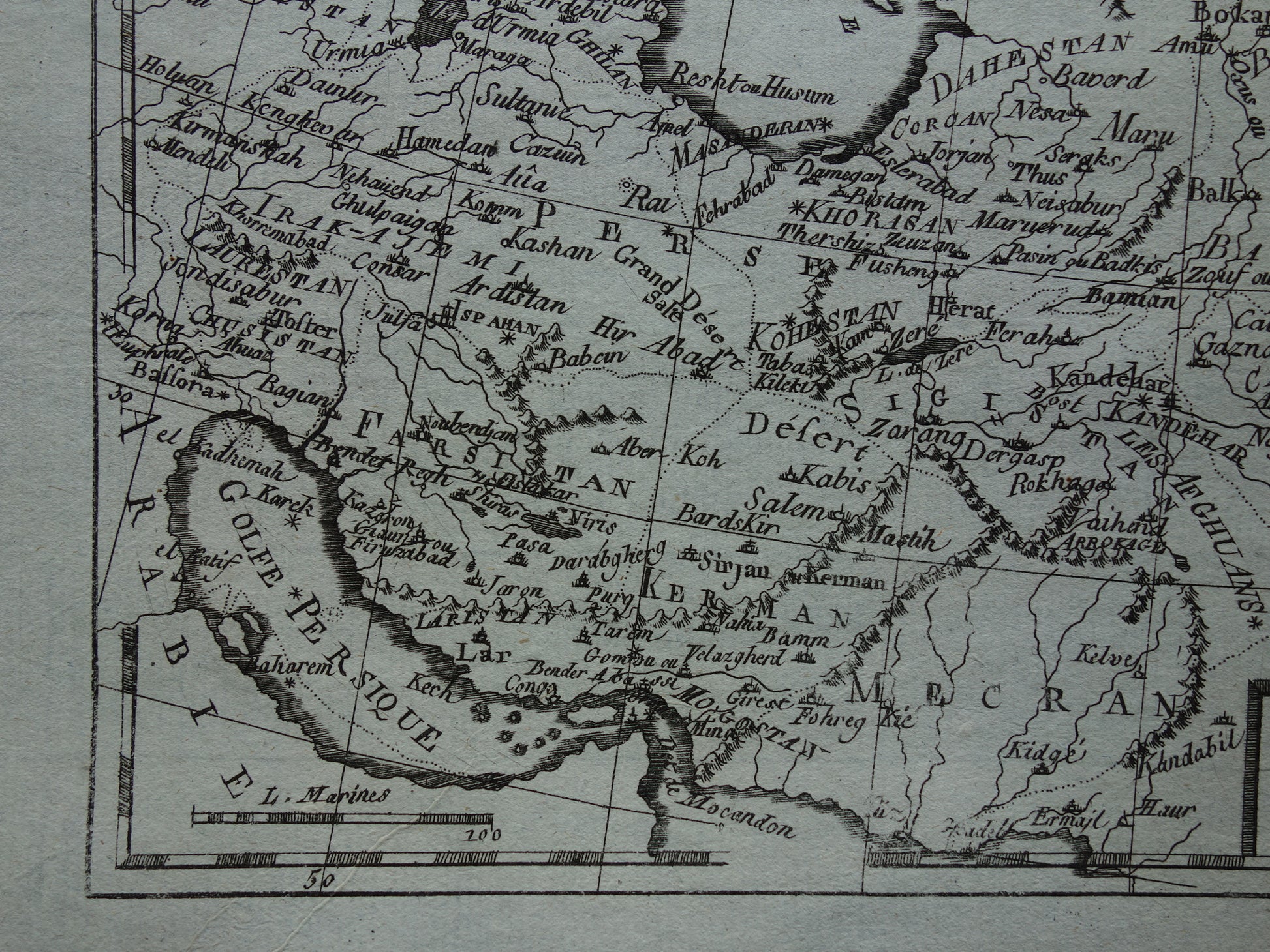 Mooie, ruim 200 jaar oude, antieke kaart van Centraal-Azië van Armenië in het westen tot Tibet en China in het oosten. Met op de kaart genoemd: Usbekistan, Eleuts, Calmouks, Petite Bukarie, Tibet ou Boutan, Meran, Kerman , Laristan, Faristan, Kotland, Khorasan, Irak-ajemi, Kurdistan, Aderbigan, Georgia, Circasssie, Karakalpaks, Step, Belur. Het is een kopergravure gedrukt op geschept papier. Deze Franse kaart is ontworpen door de bekende cartograaf Rigobert Bonne.