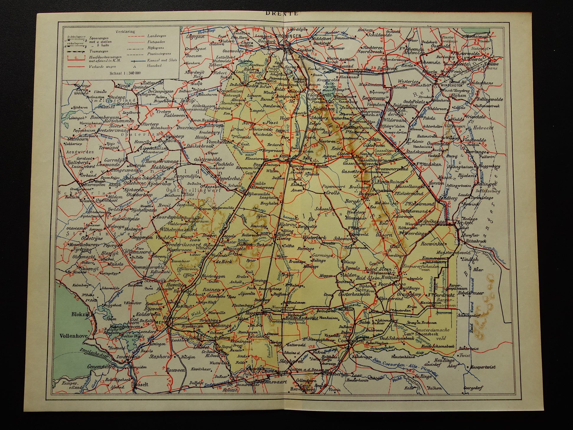 Te koop is een oude Nederlandse landkaart van de provincie Drenthe (toen nog geschreven als Drente zonder h). De kaart laat o.a. de belangrijkste wegen, tramwegen, spoorwegen, fietspaden en kanalen zien.