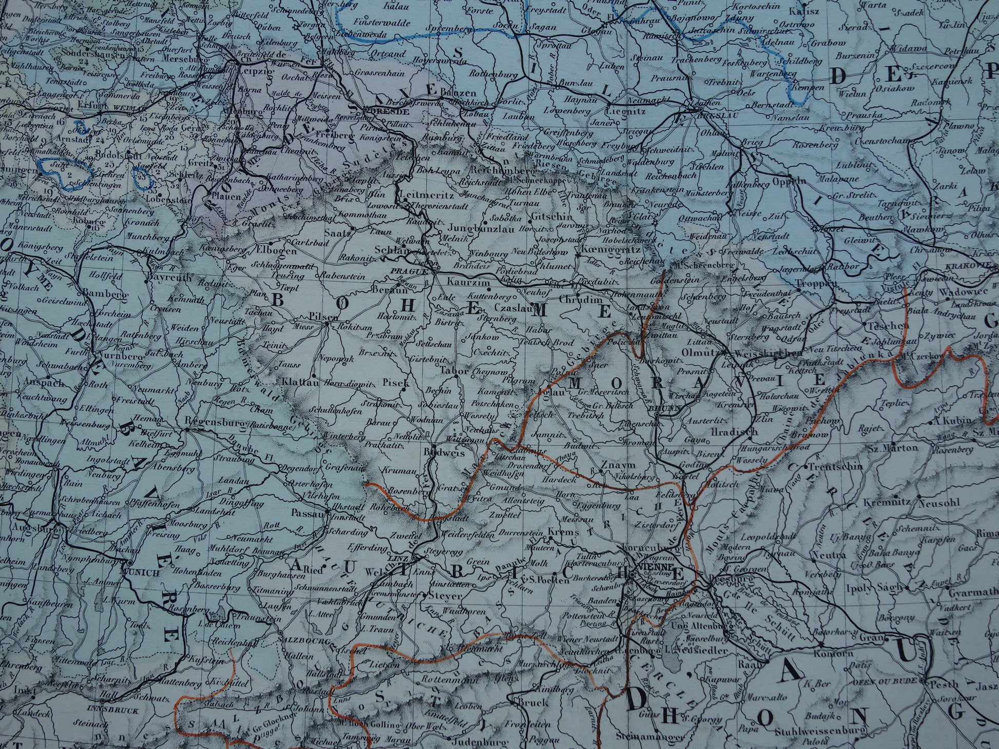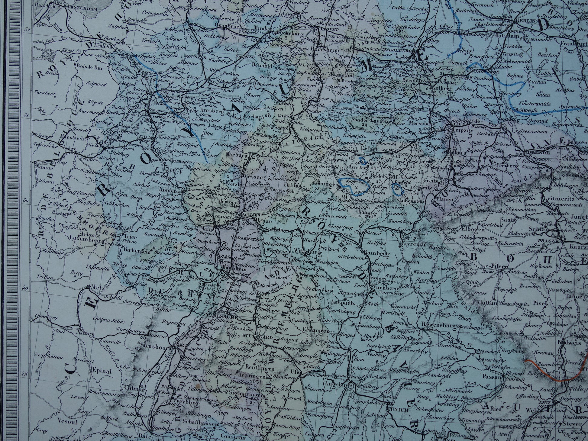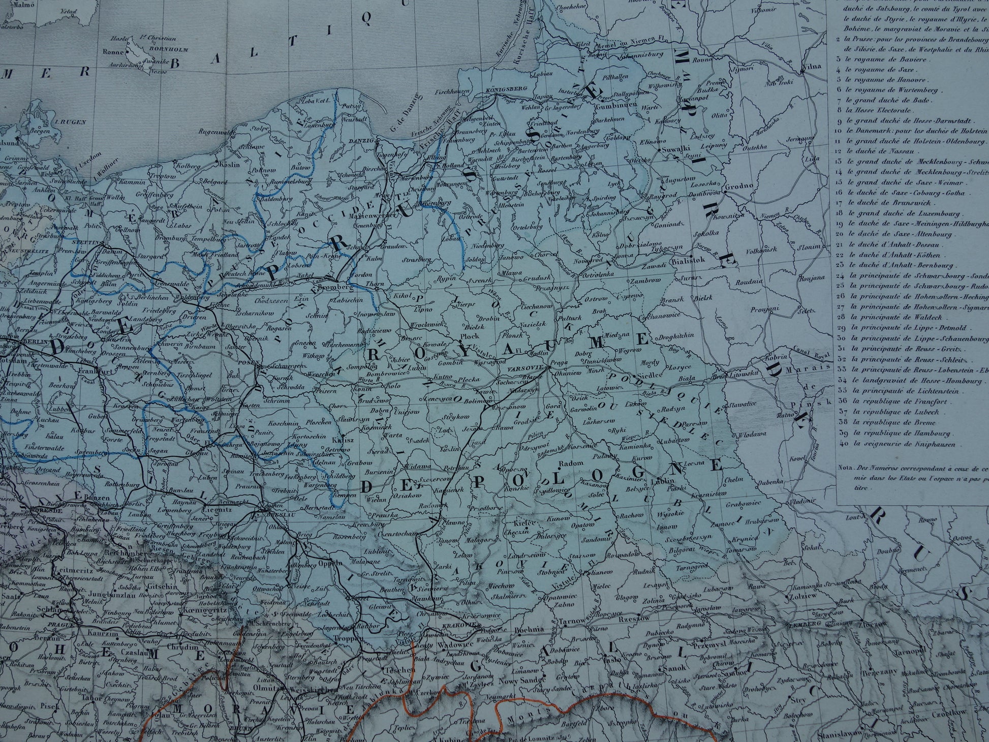 Grote antieke Franse kaart van centraal Europa uit het jaar 1858 met onder andere Duitsland, Polen en Oostenrijk-Hongarije. De kaart is erg gedetailleerd, zoom de foto's om dit goed te zien. Fraaie pastelkleuren die met de hand zijn ingekleurd. Rechtsboven een index van alle staten van de Duitse Bond.