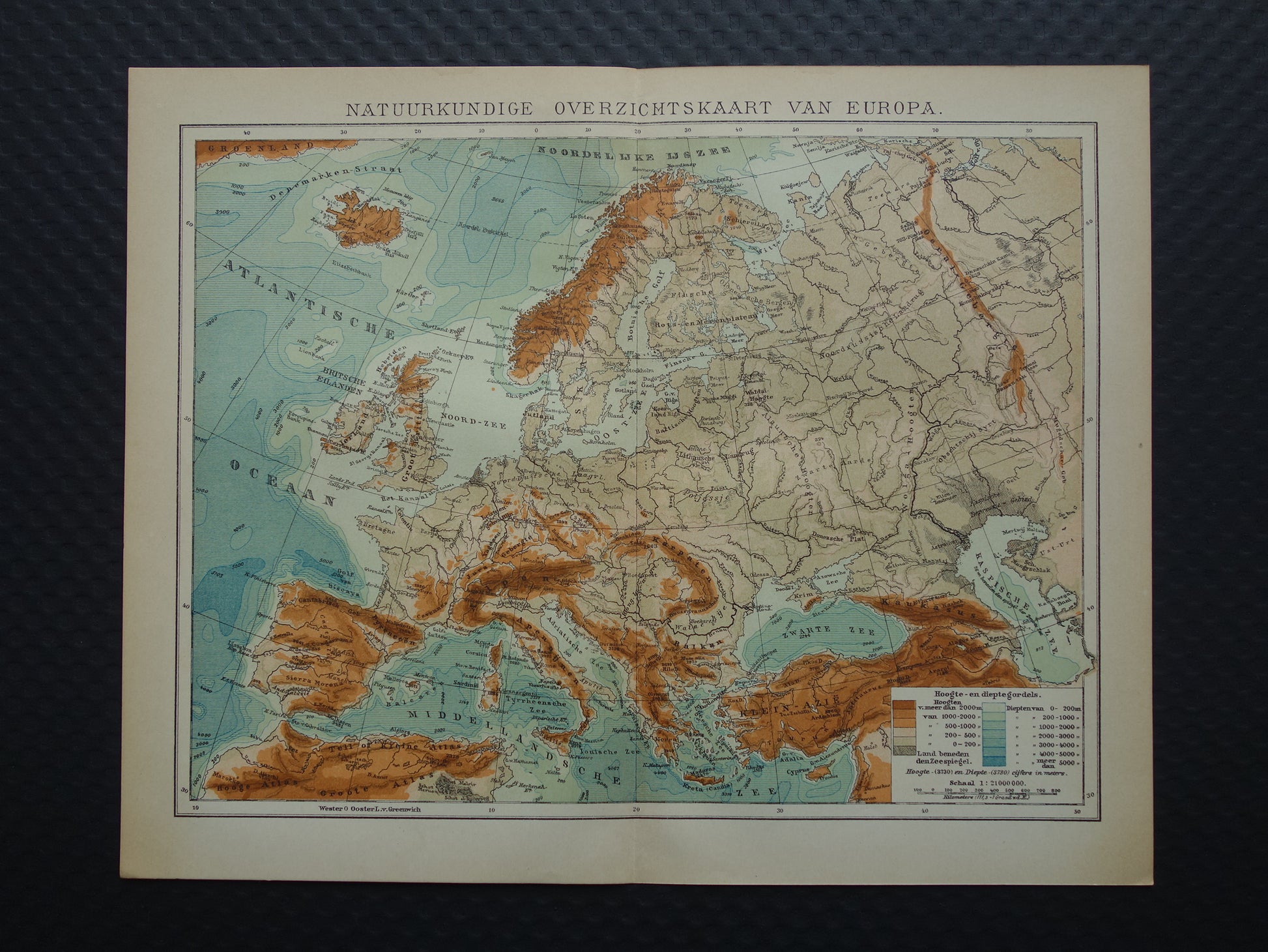 Te koop is een oude Nederlandse hoogtekaart van Europa. De verschillende kleuren geven hoogte en diepte aan. Ruime marges rondom en heel geschikt om in te lijsten.