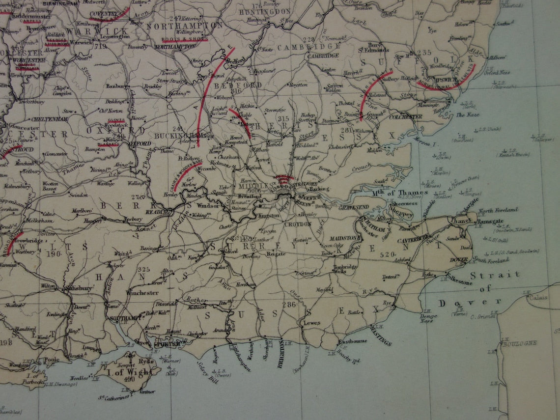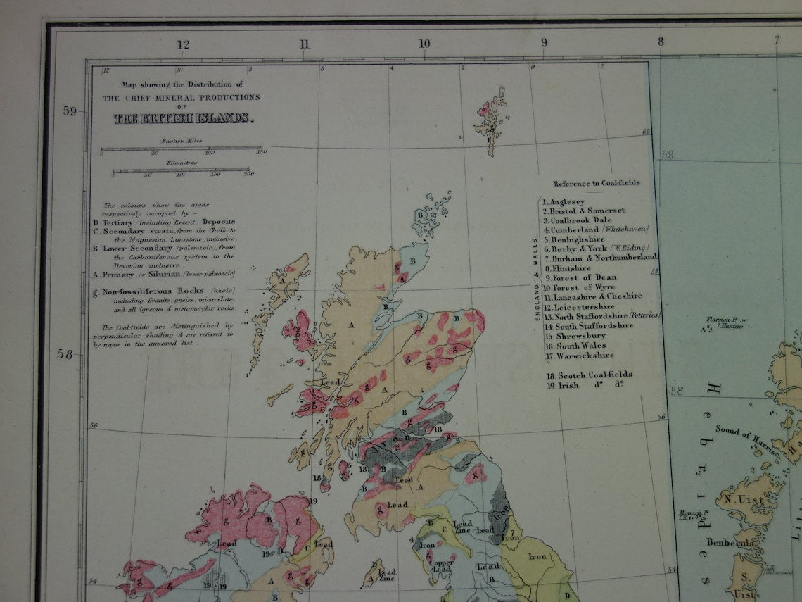 Te koop is een grote vintage landkaart van Groot-Brittanië en Ierland uit 1875. Deze grote Engelse kaart is een industriële kaart en toont de spoorwegen, kanalen en bevaarbare rivieren, het aantal inwoners van elk graafschap (per vierkante mijl volgens de volkstelling van 1871), alle steden met meer dan 2000 inwoners, lichtschepen en vuurtorens en ook de belangrijkste regionale producten (bijvoorbeeld laarzen en schoenen in Northampton en handschoenen in Yeovil). Linksboven is een inzetkaart van de belangrijkste mijnbouwproductie in elk gebied en de kaart rechtsboven toont de vergelijkende bevolkingsdichtheid.