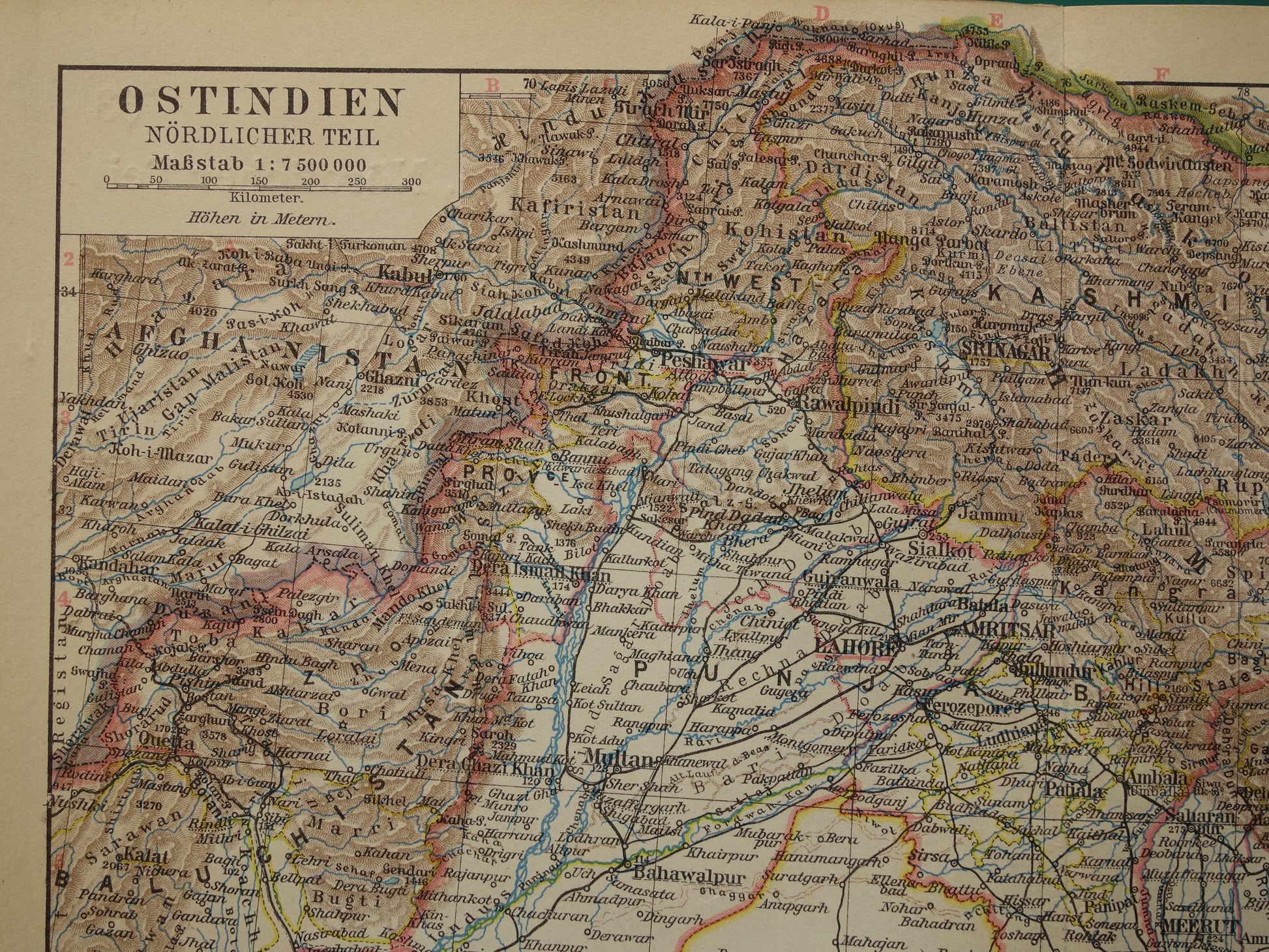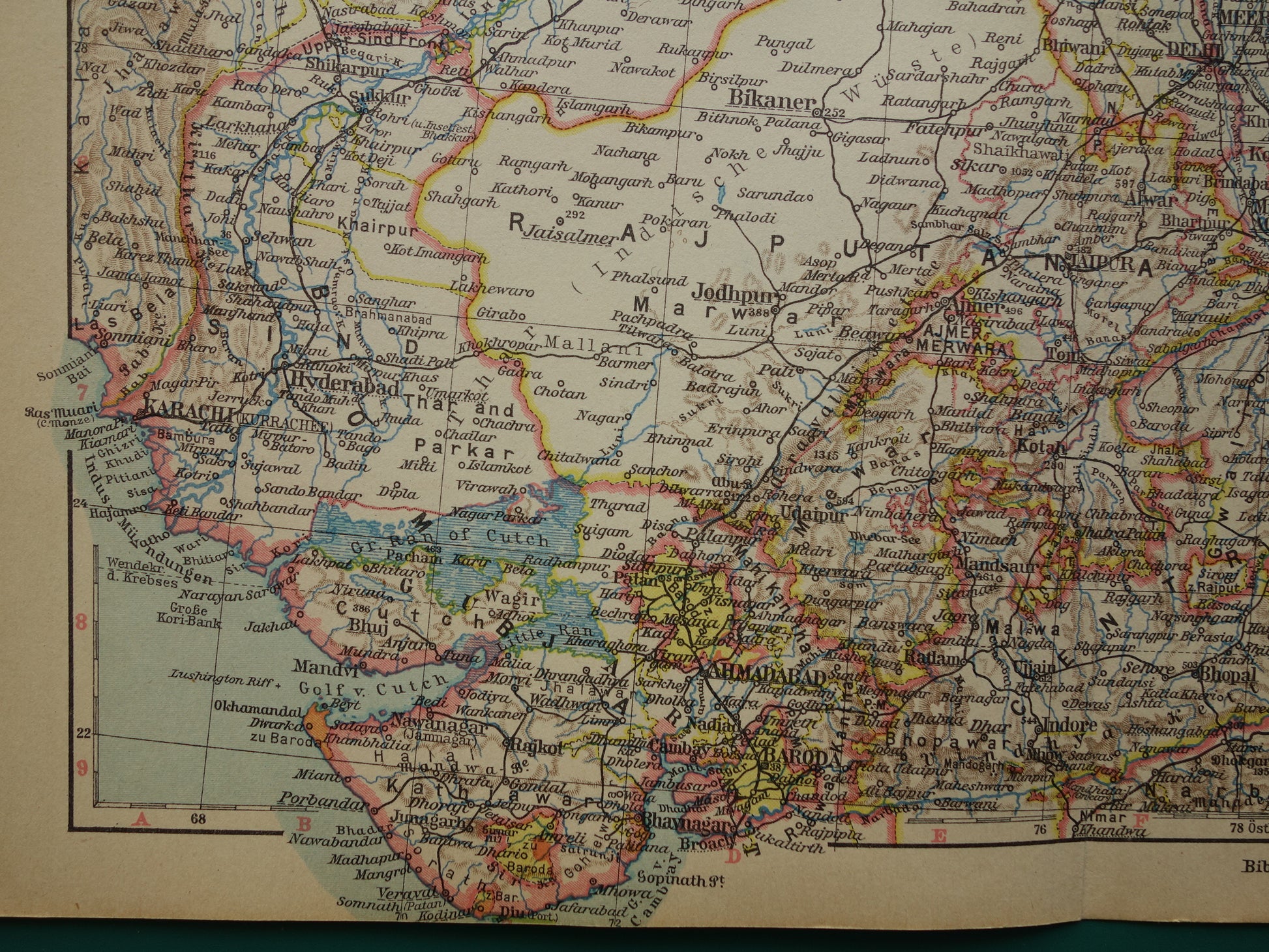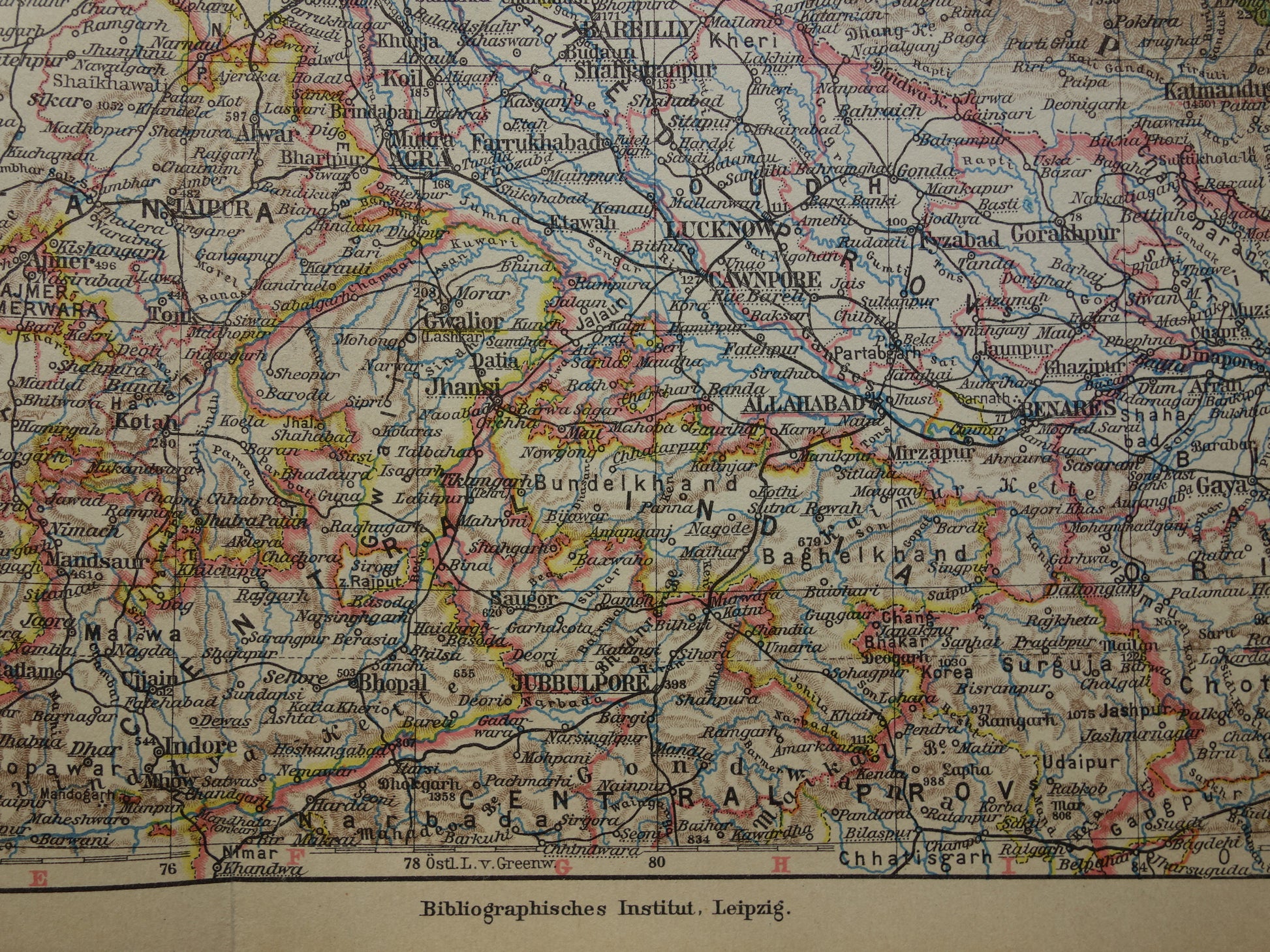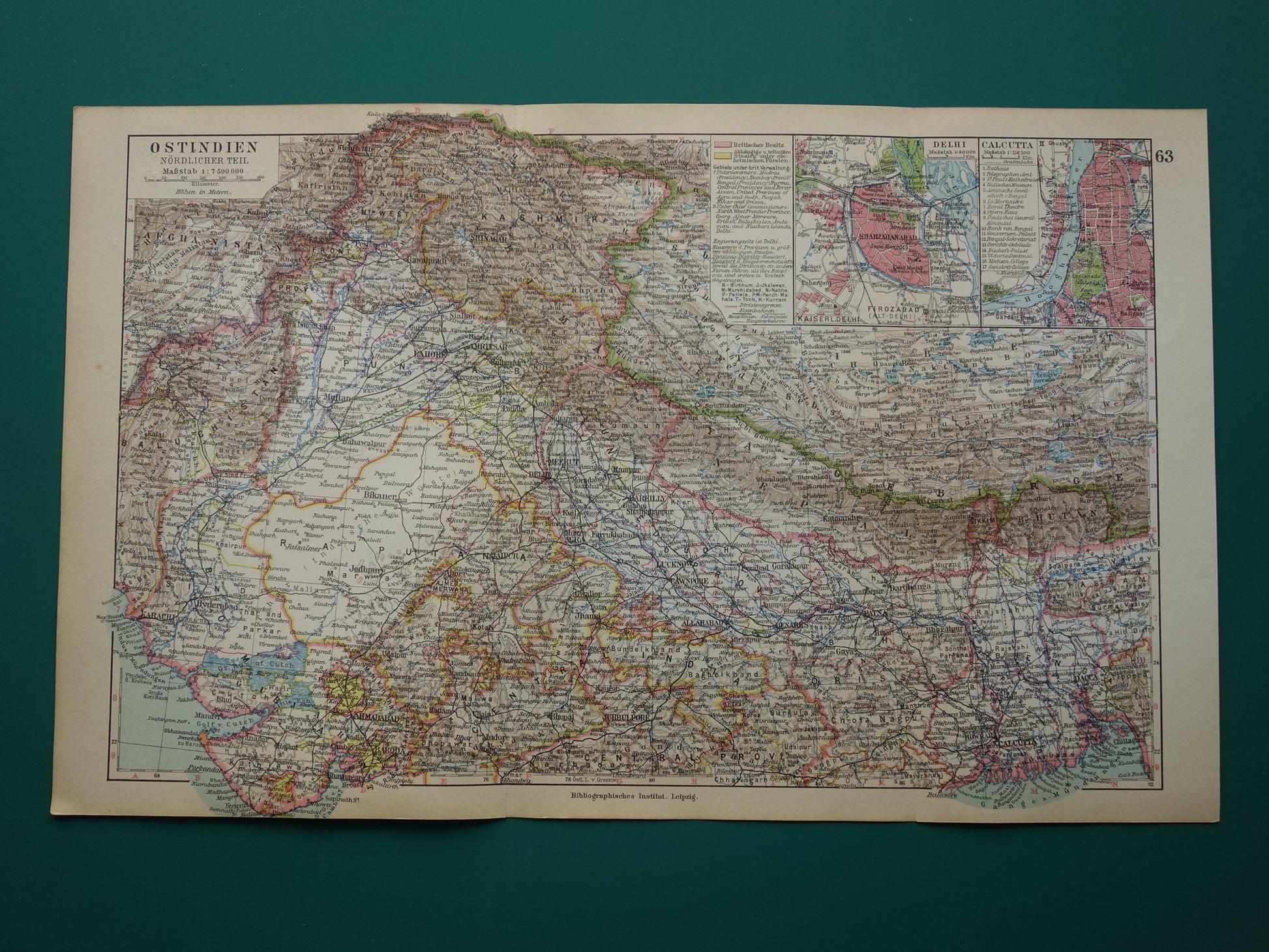 Te koop is een mooie, kleurrijke oude landkaart van het noorden van India met ook Nepal, Bhutan en een gedeelte van Pakistan. Rechtsboven staan inzetkaartjes van Delhi en Kolkata / Calcutta (beide staan vanzelfsprekend ook op de hoofdkaart). Deze Duitse kaart uit de jaren '20 van de vorige eeuw is zeer gedetailleerd, zoom de foto's om dat goed te zien.