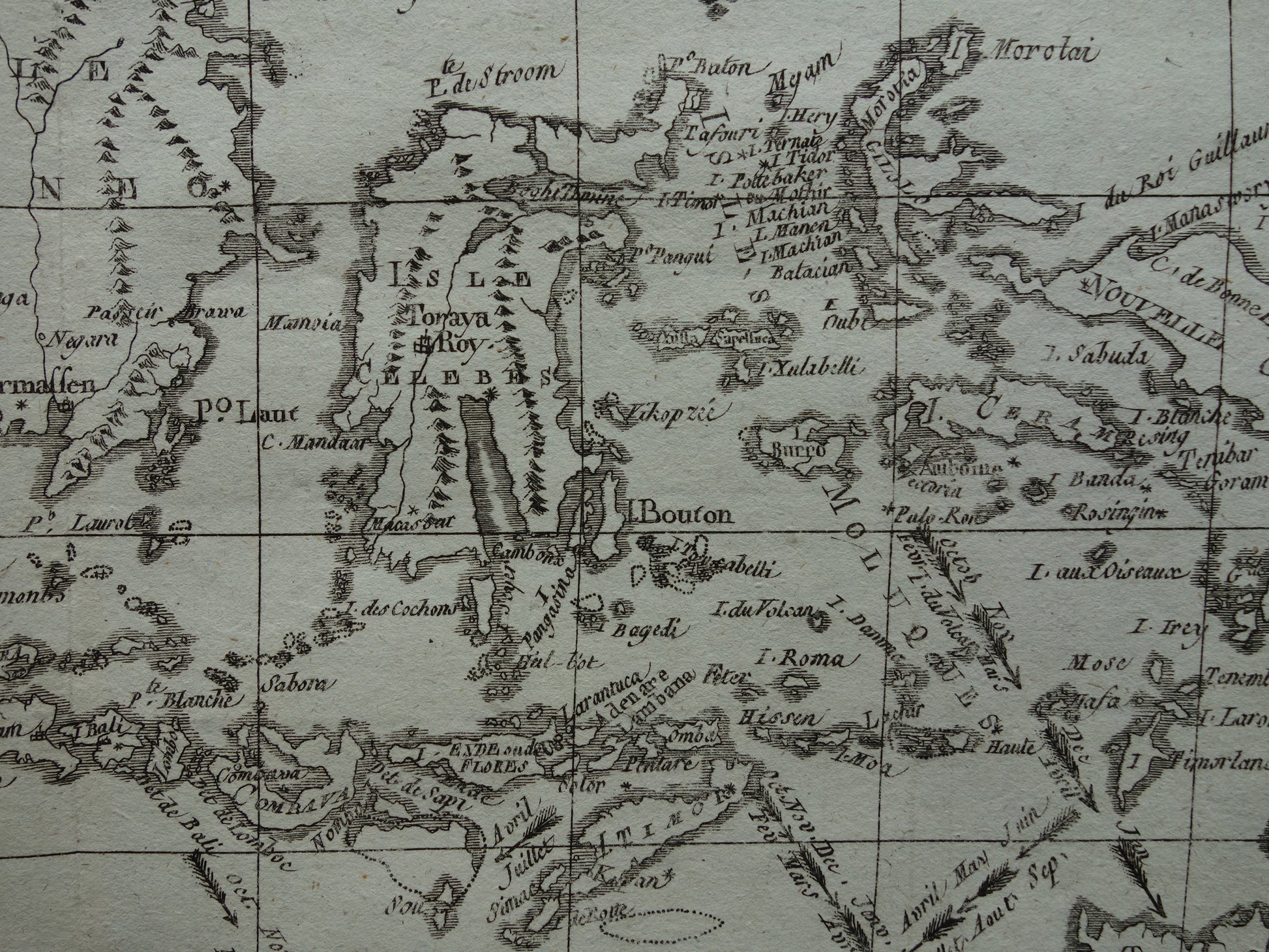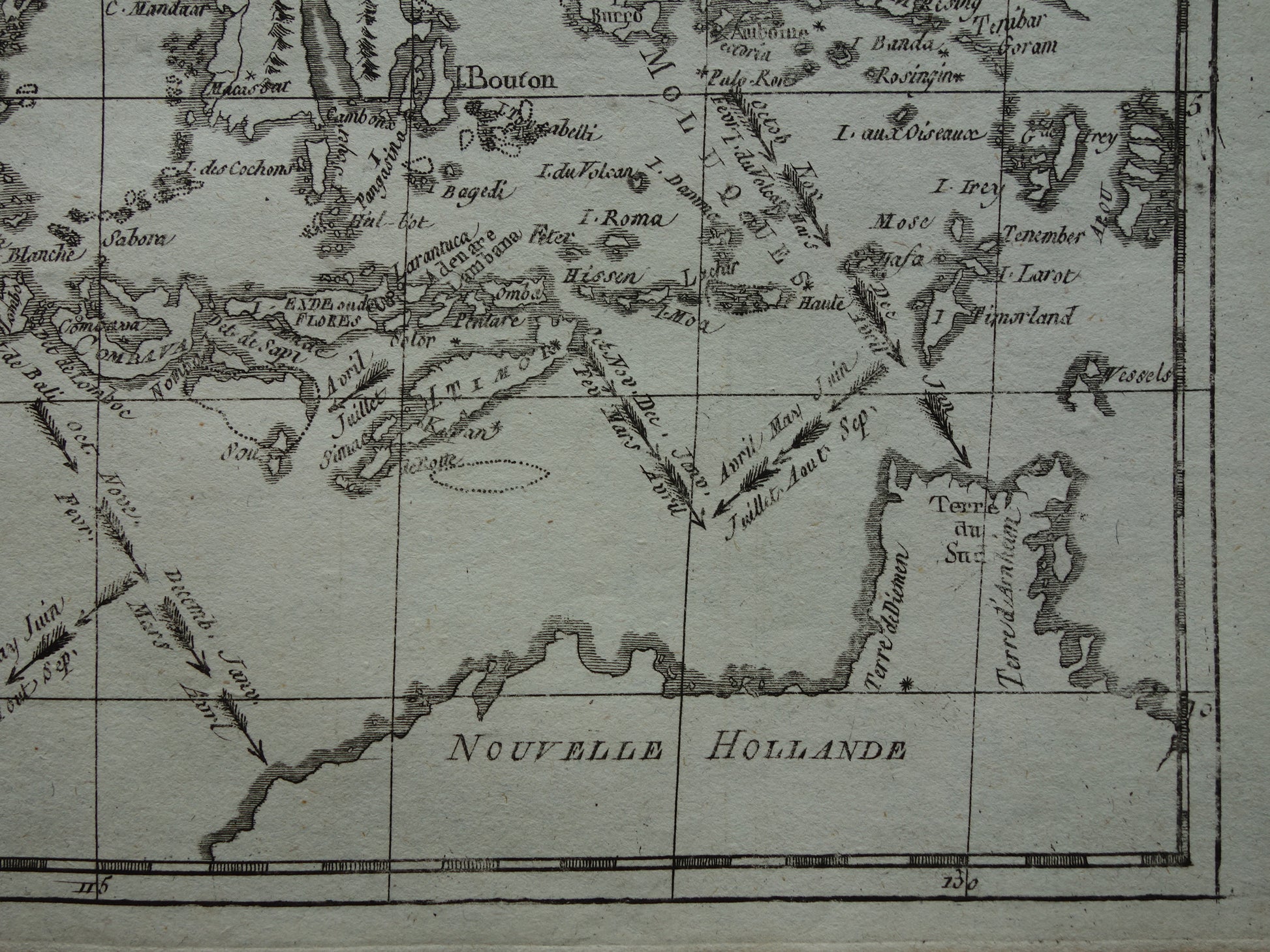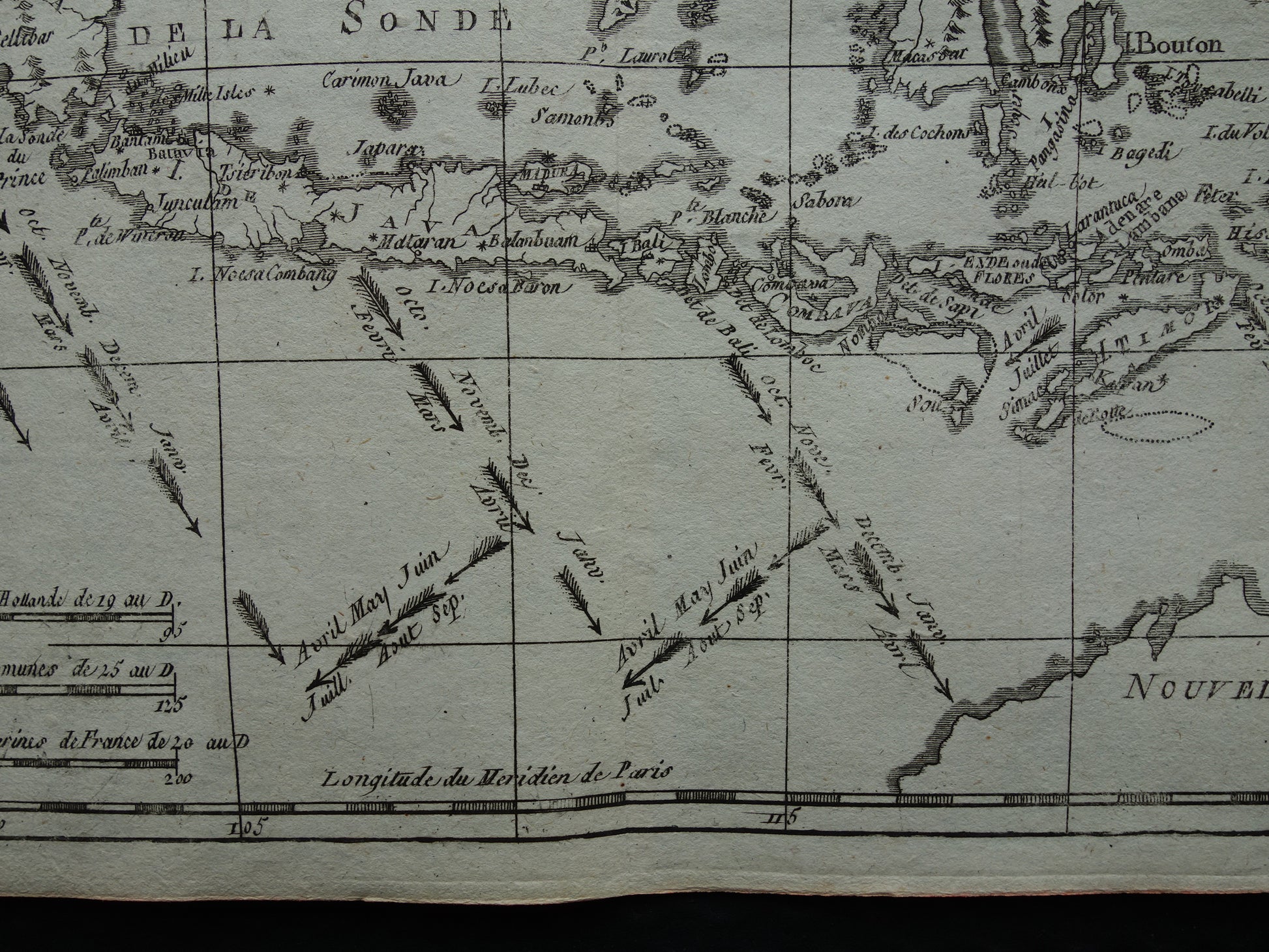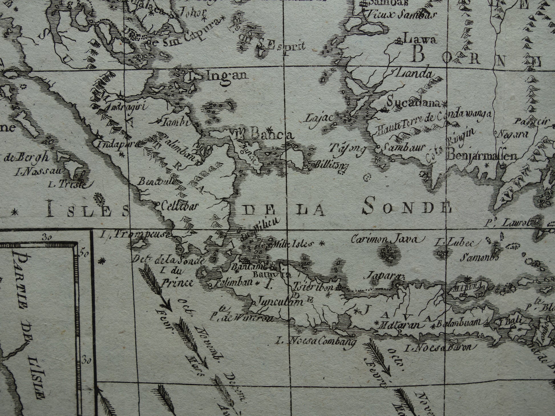 Te koop is een mooie antieke kaart van Indonesië. Het is een gedetailleerde kopergravure gedrukt op geschept papier. Deze Franse kaart is ontworpen door de bekende cartograaf Rigobert Bonne. Erg fraai om in te lijsten.