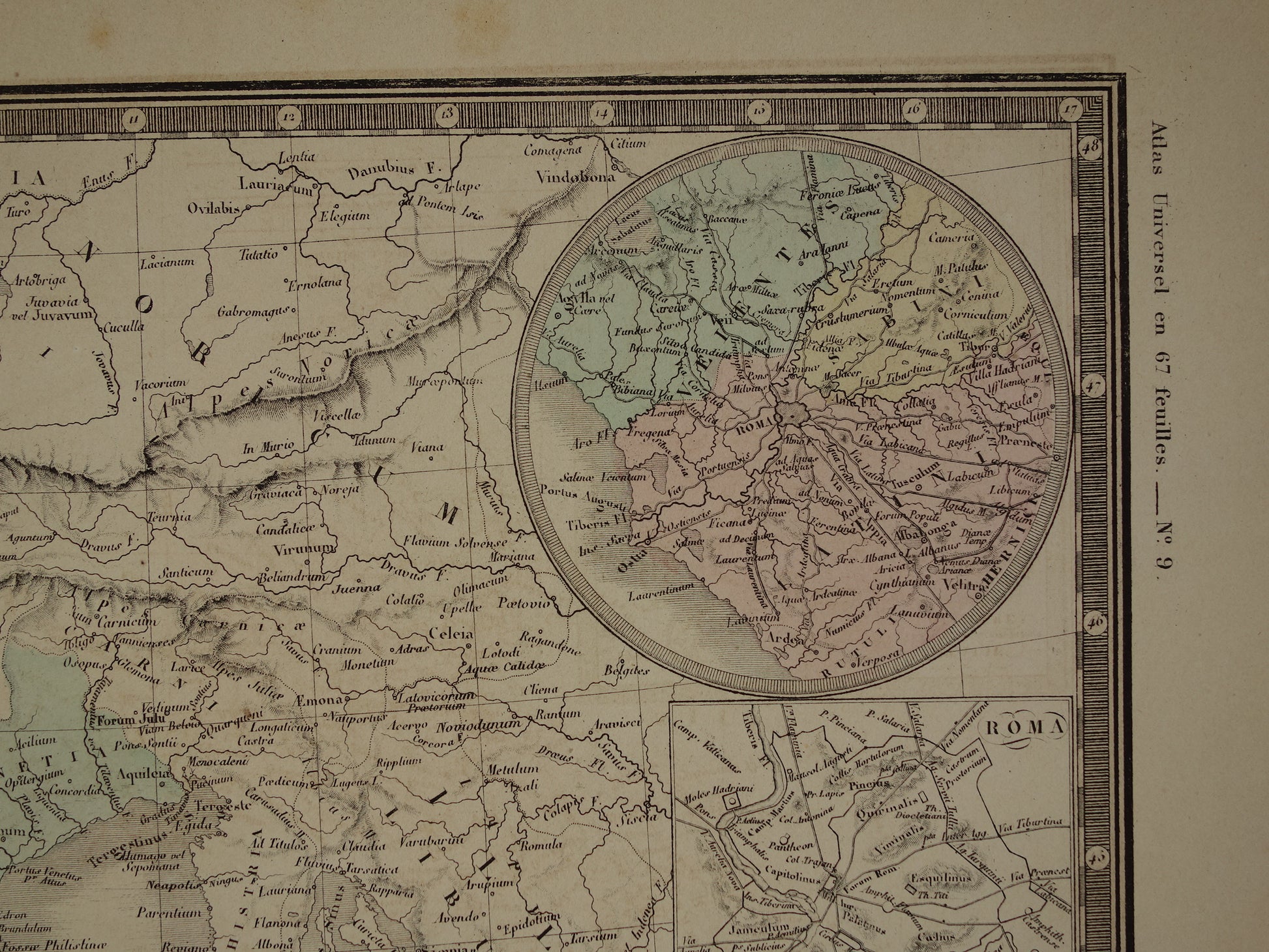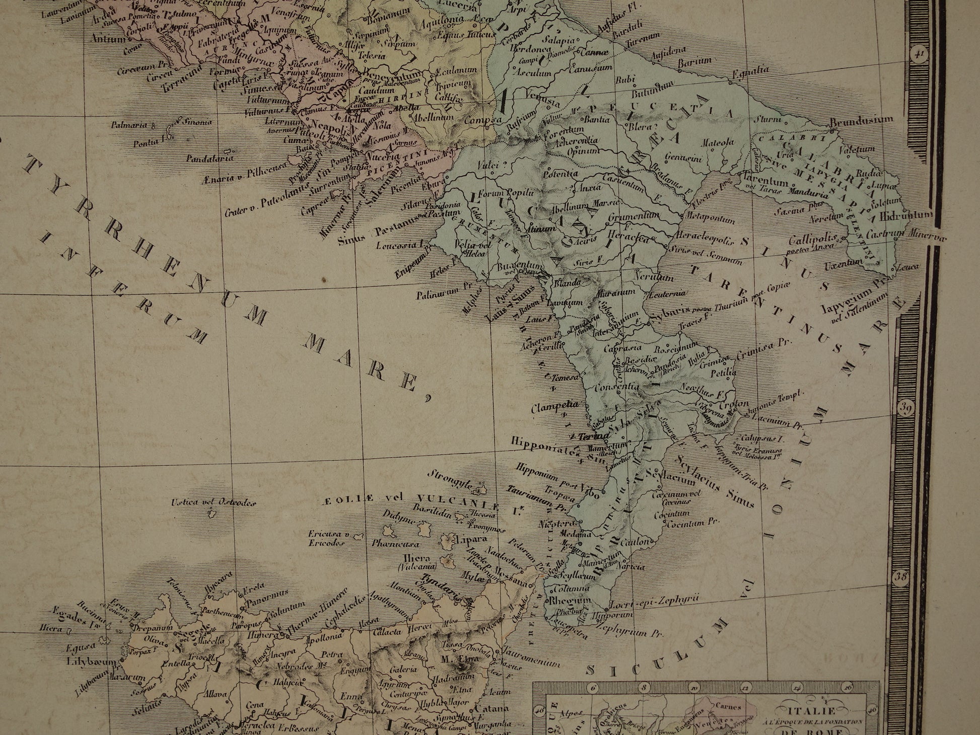 Mooie, grote handgekleurde Franse kaart van Italië in de klassieke oudheid. Met de volgende inzetkaarten: Rome (rechtsboven) - Rome en omgeving (rechtsboven) - Veroveringen tot aan 2e Punische oorlog in 219 v. Chr. (linksonder) - Italië ten tijde stichting Rome in 755 v. Chr (beneden rechts). Ruime marges en zeer geschikt om in te lijsten.