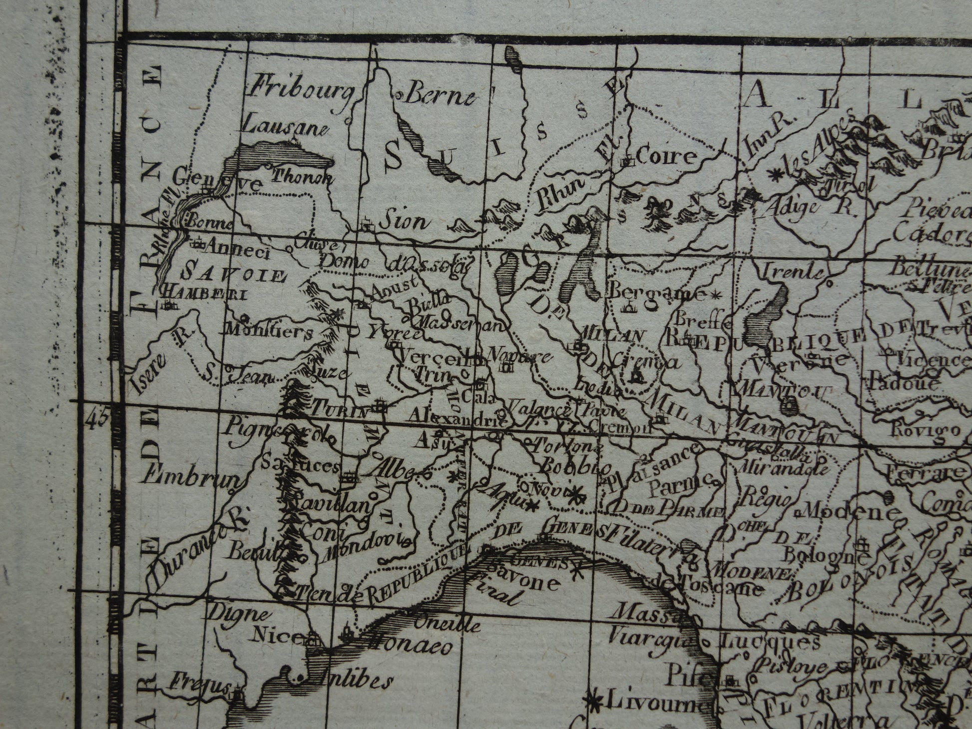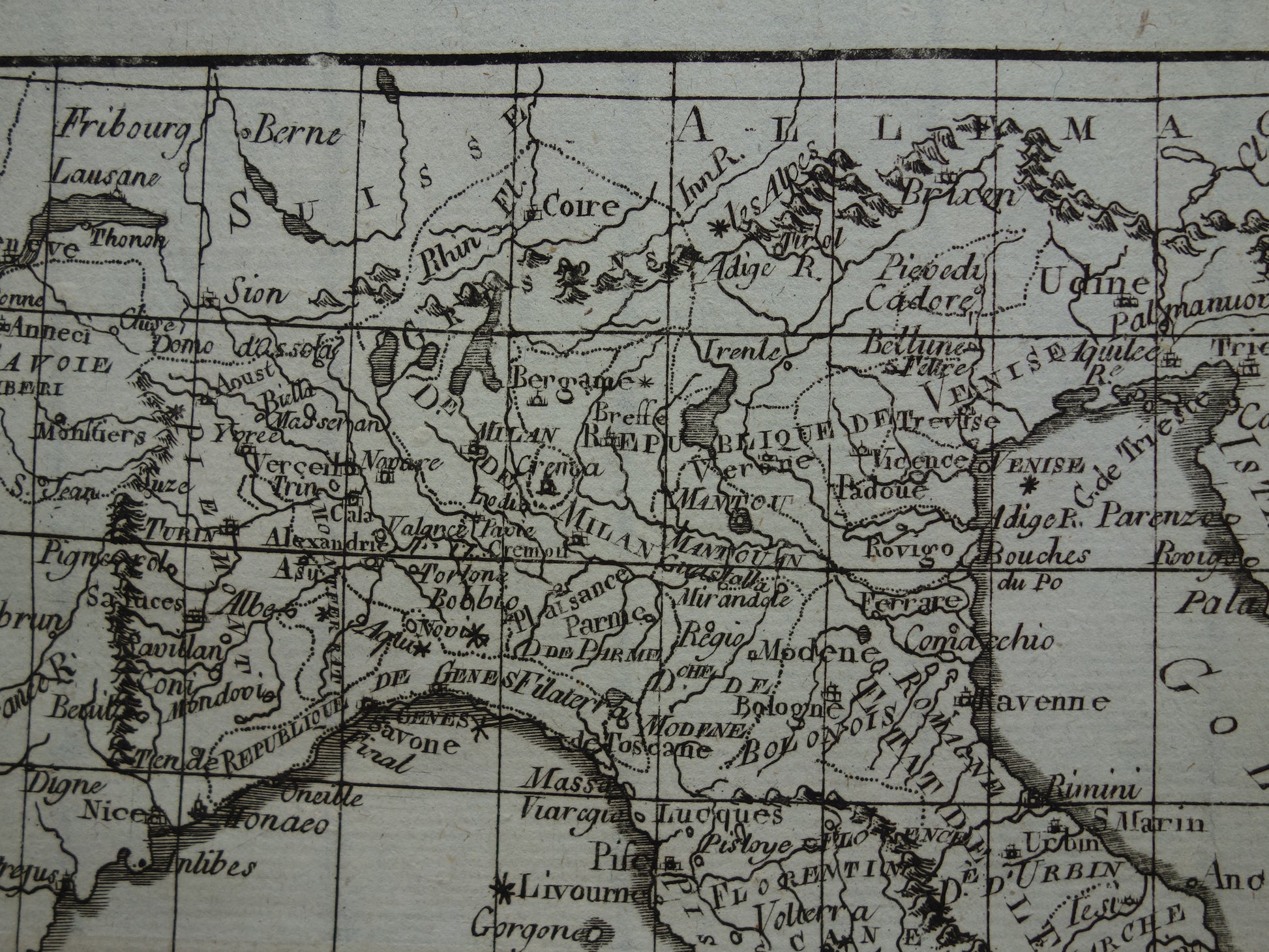 Mooie, ruim 200 jaar oude, antieke kaart van Italië. Het is een gedetailleerde kopergravure gedrukt op geschept papier. Deze Franse kaart is ontworpen door de bekende cartograaf Rigobert Bonne.