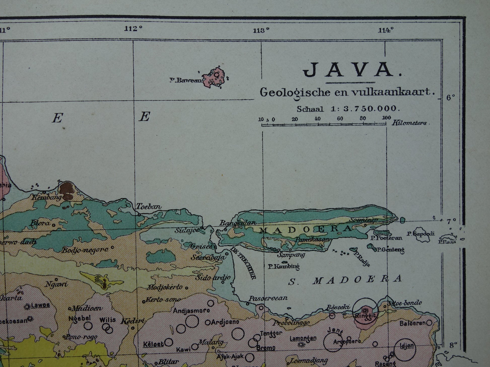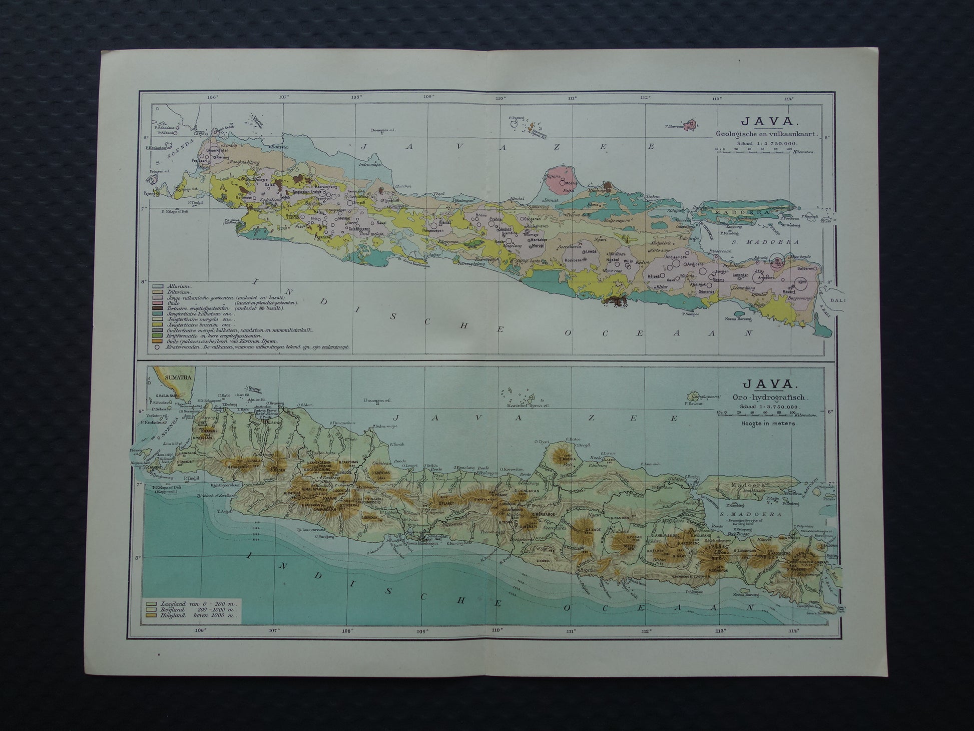 Te koop is een oude Nederlandse kaart van Java. Bovenaan een geologische kaart met daarop ook vulkanen. Onderaan een hoogtekaart. Met ruime marges en heel geschikt om in te lijsten.