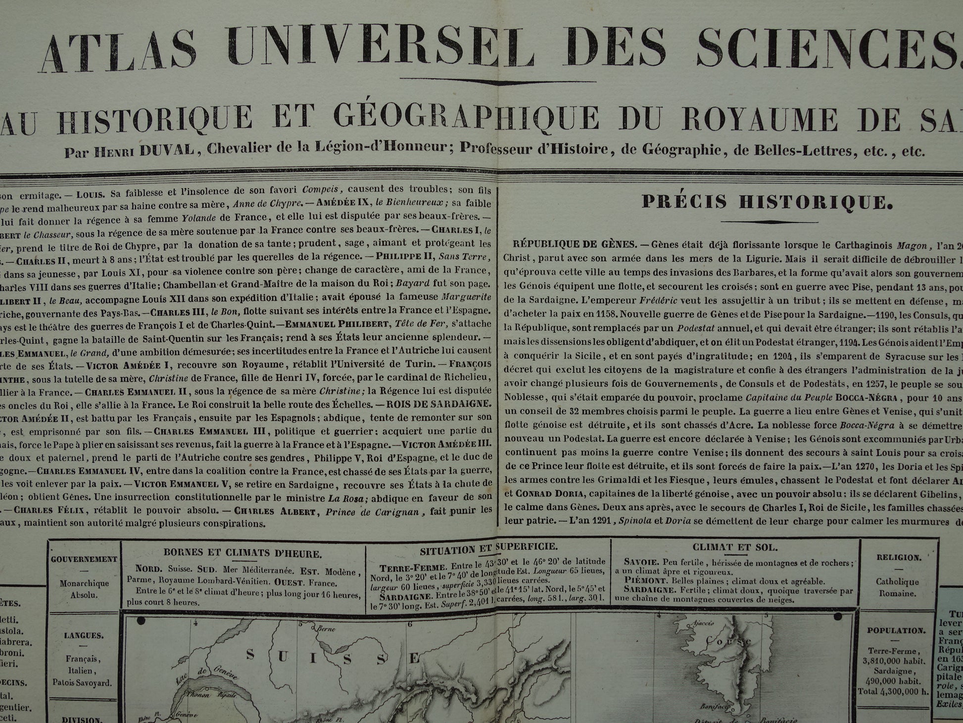 Koninkrijk Sardinië Oude kaart Italië 1837 grote antieke gravure over geschiedenis van Koninkrijk Sardinië met vintage landkaart