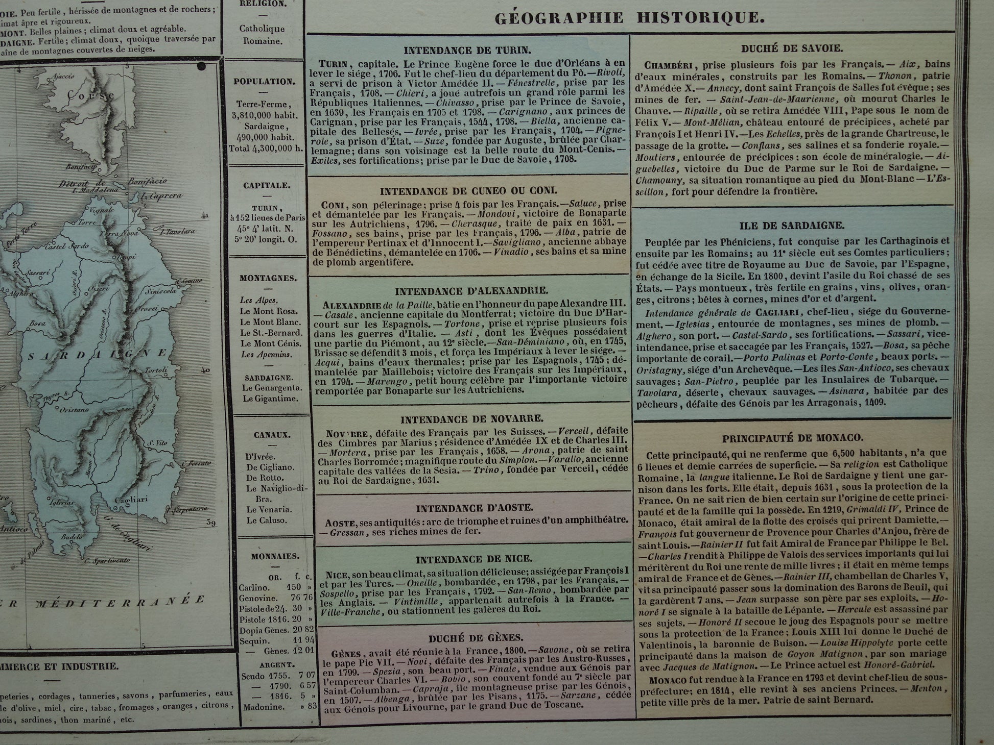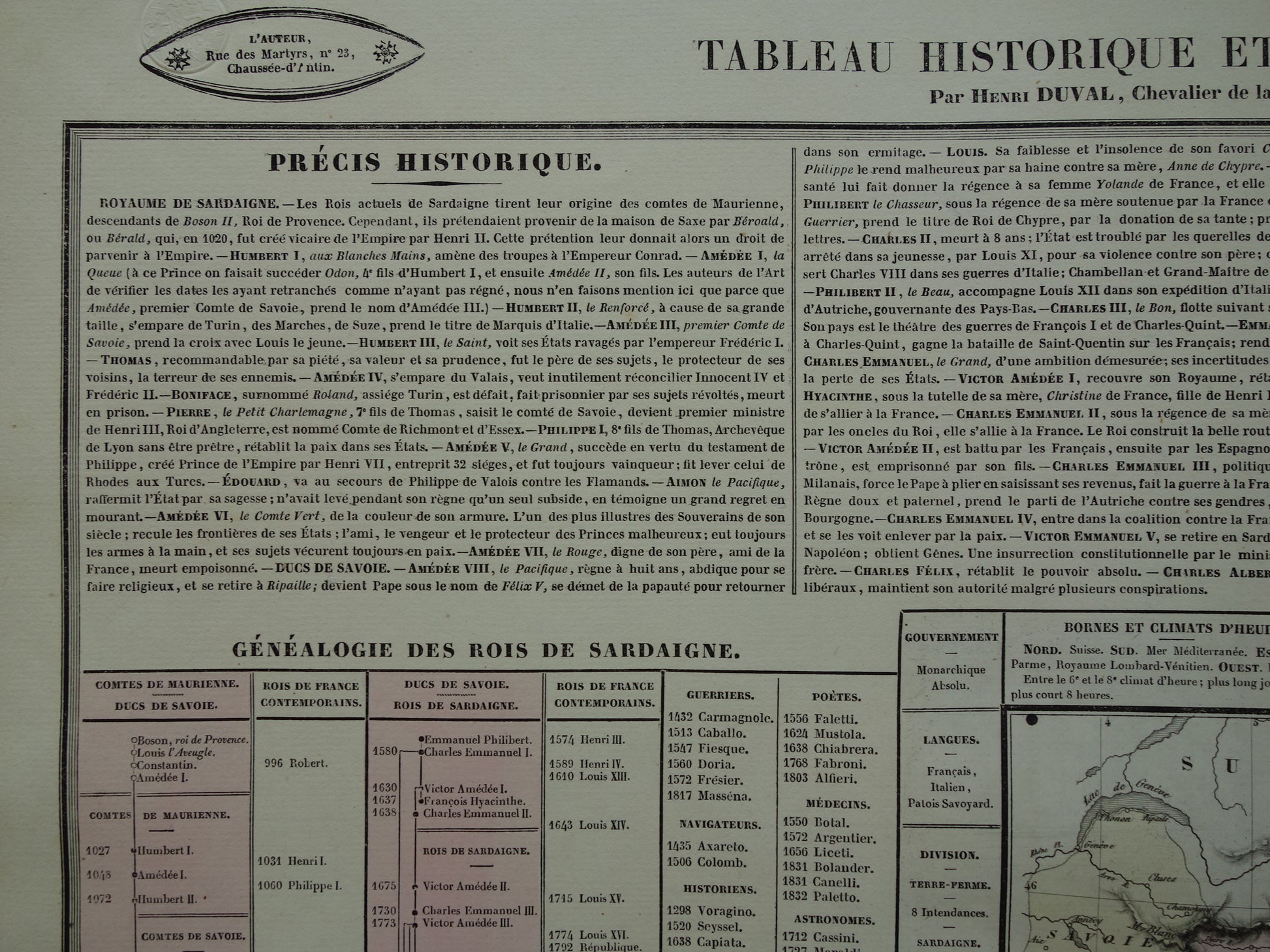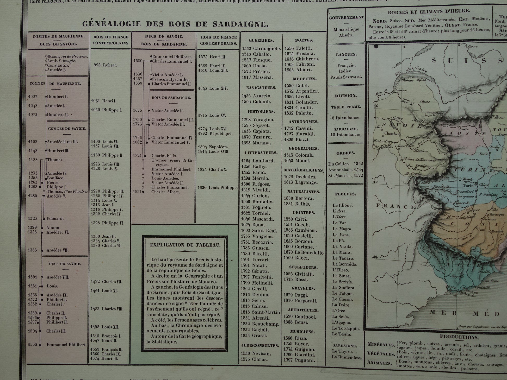 Te koop is een mooie Franse gravure over de geschiedenis van het Koninkrijk Sardinië. De gravure is erg mooi ingekleurd (met originele handkleuring) en gedecoreerd met een kaart van het gebied. Daarnaast bevat deze gravure een schat van informatie over de geschiedenis. Zoom de foto's om dit goed te zien. Een aantal voorbeelden: