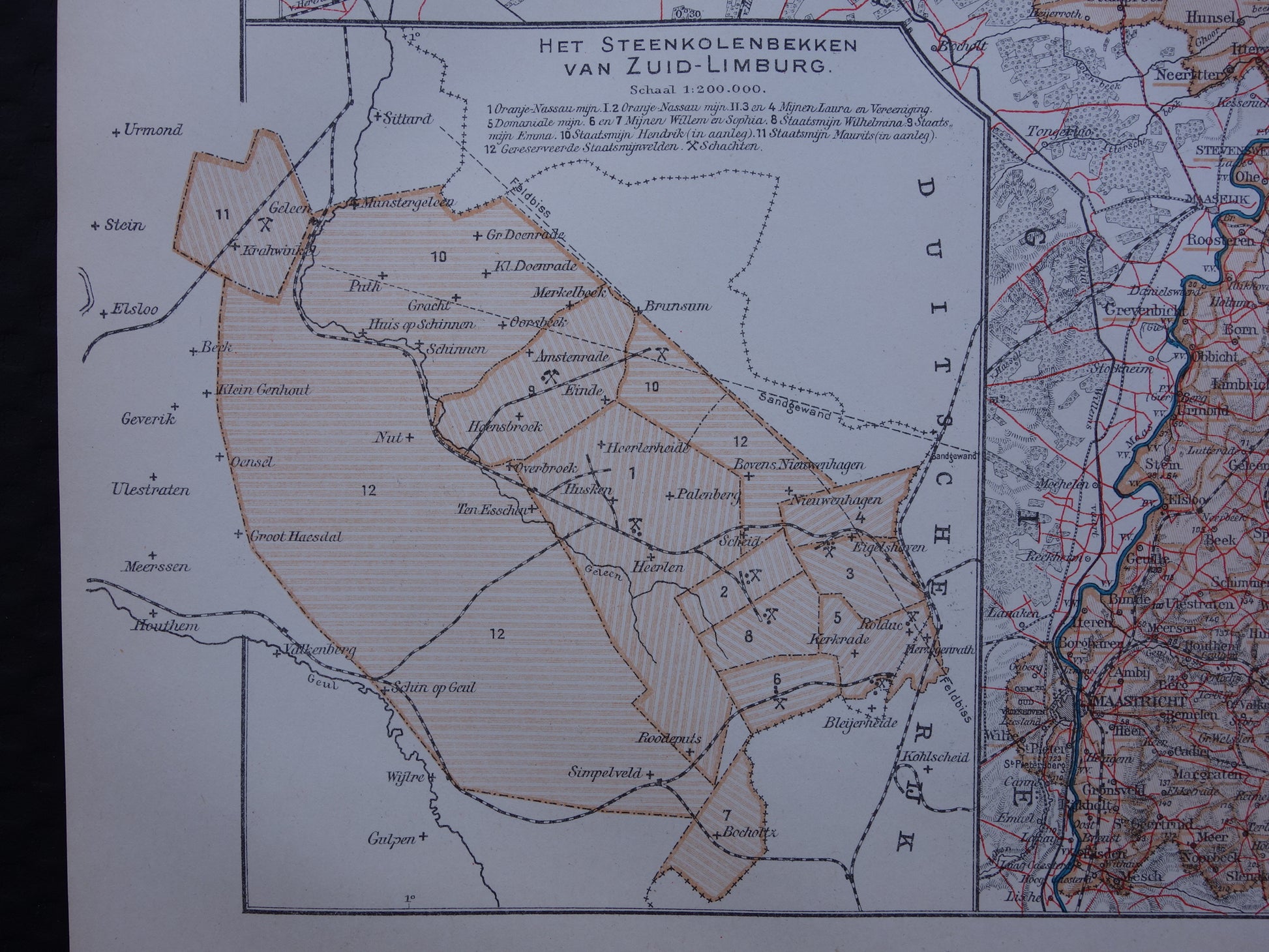 Te koop is een oude Nederlandse landkaart van de provincie Limburg. Onderaan een kaart van het steenkolenbekken van Limburg.