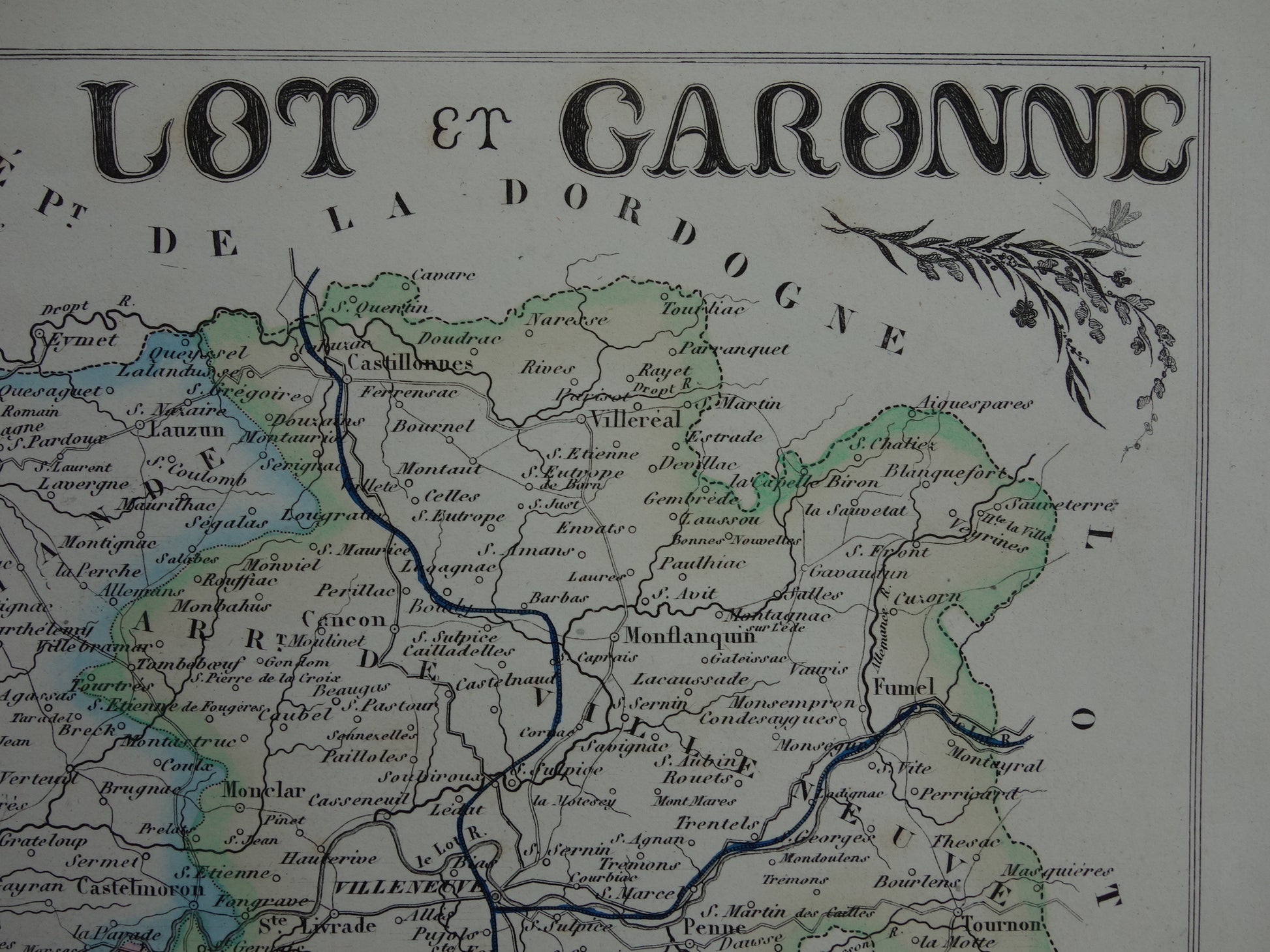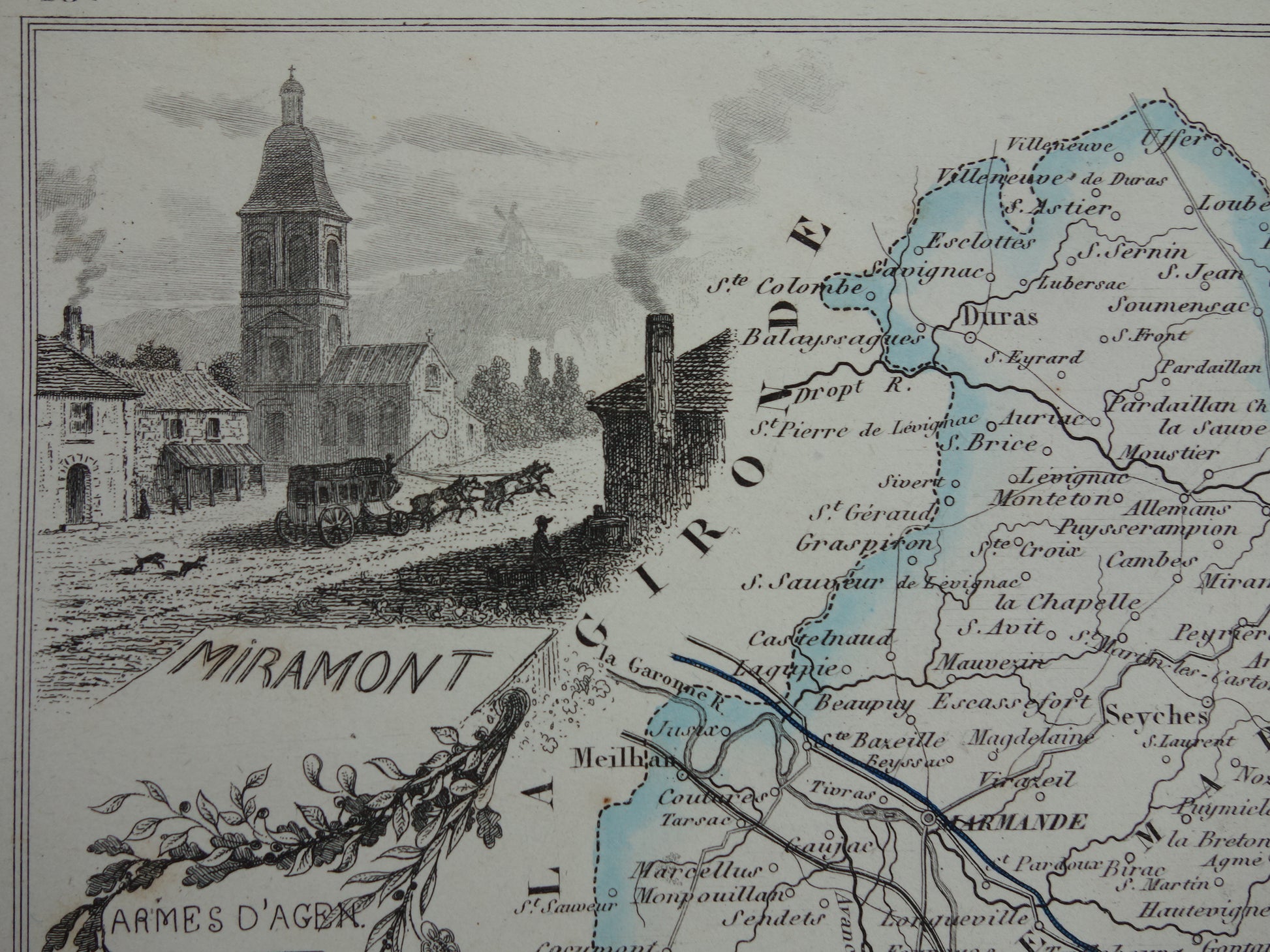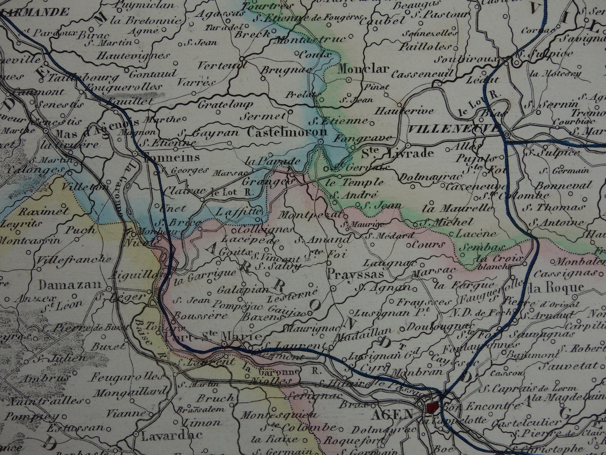 Lot-et-Garonne Frankrijk oude kaart uit 1856 originele antieke handgekleurde landkaart departement Miramont Agen