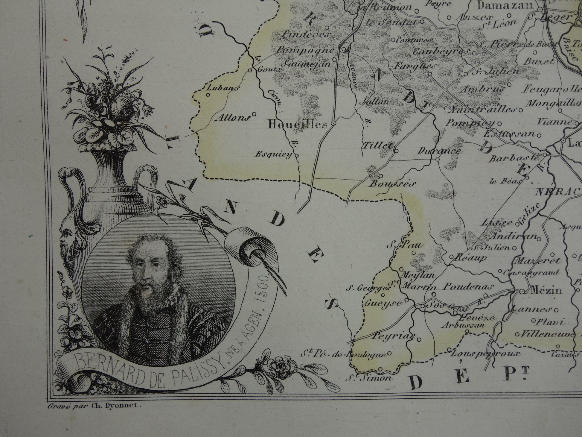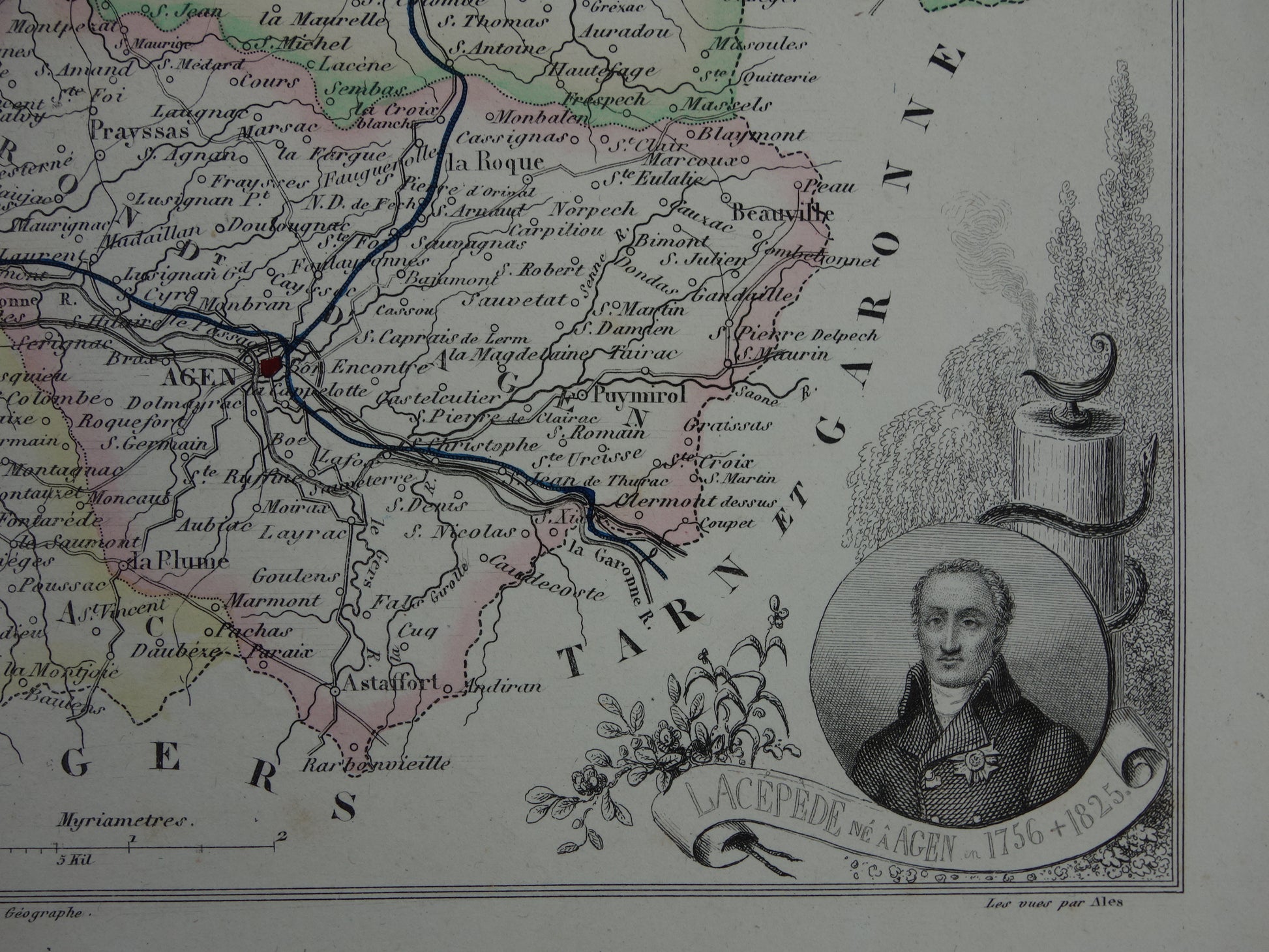 Te koop is een mooie antieke Franse kaart van het departement Lot-et-Garonne uit het jaar 1856. De kaart heeft een afbeelding van Miramont, het wapen van Agen en portretten van bekende Fransen die geboren zijn in het departement. De kaart is handgekleurd. Een erg mooie kaart met mooie ruime marges.