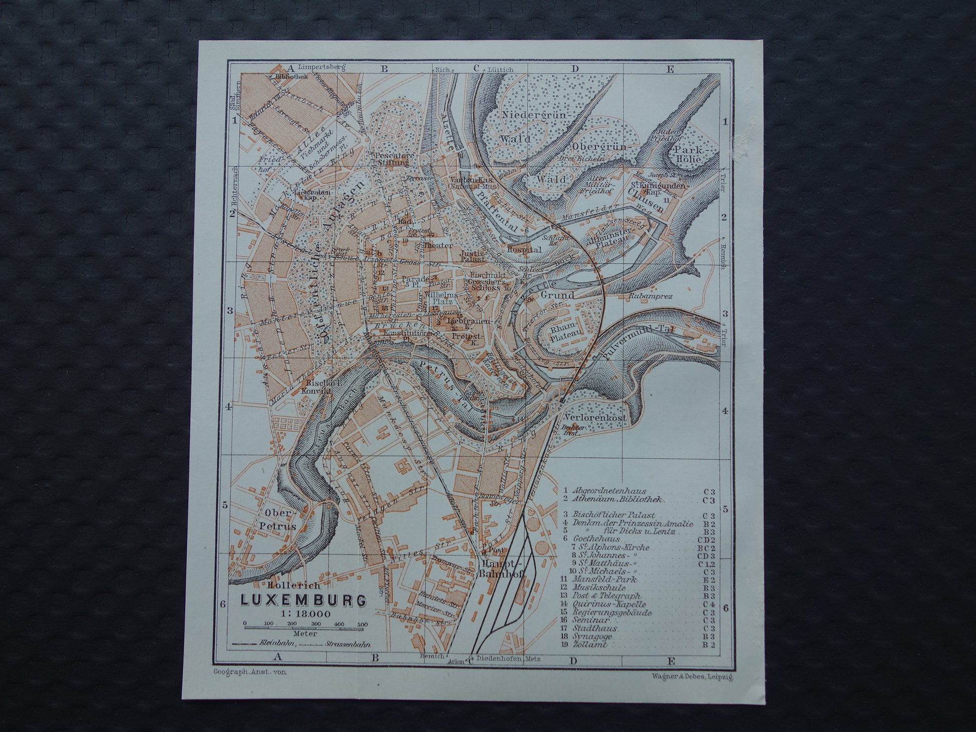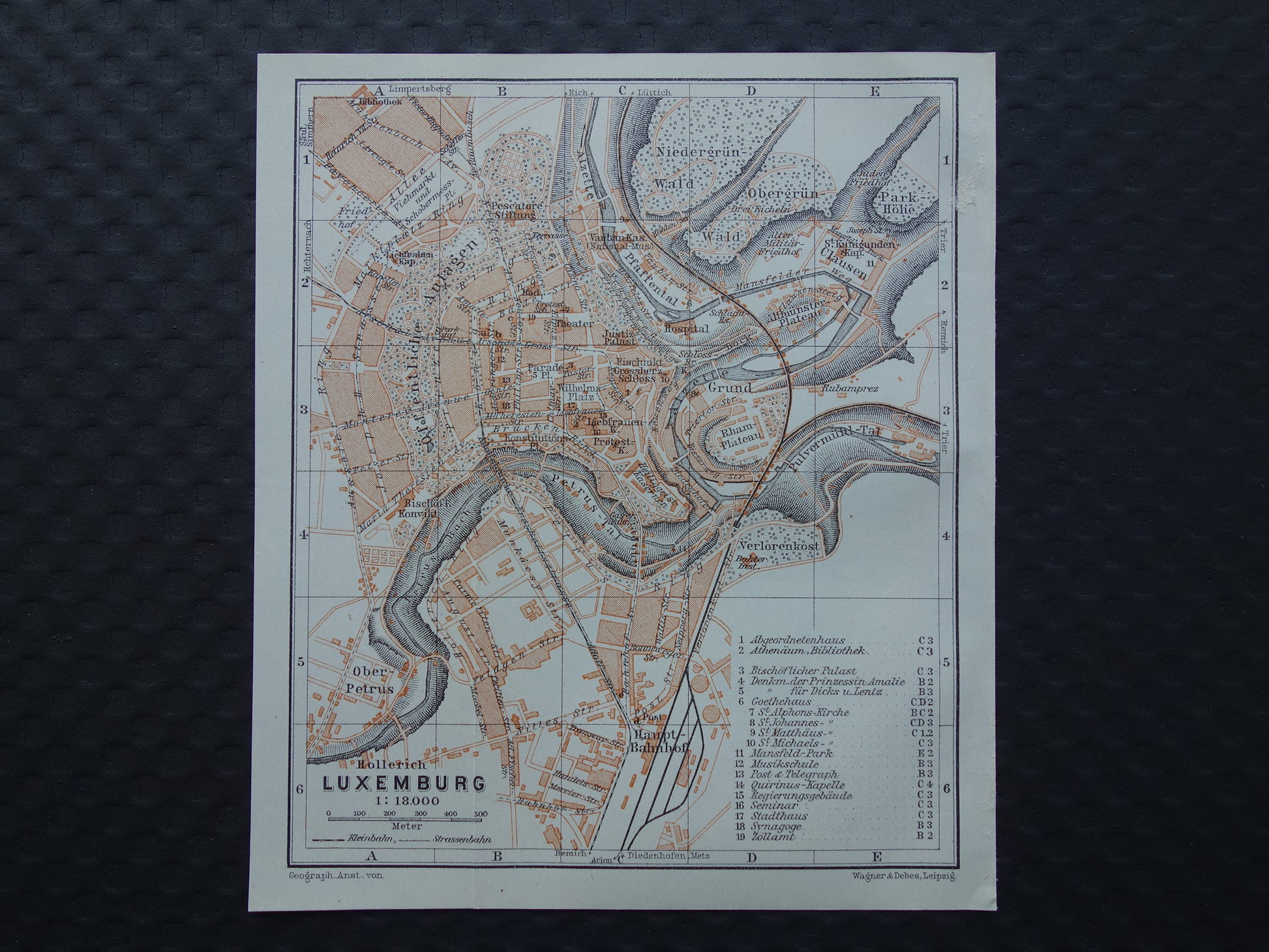 Te koop is een kleine oude kaart / plattegrond van Luxemburg uit het jaar 1904. Het is een klein kaartje, maar is toch zeer gedetailleerd. Zoom de foto's om dat goed te zien.