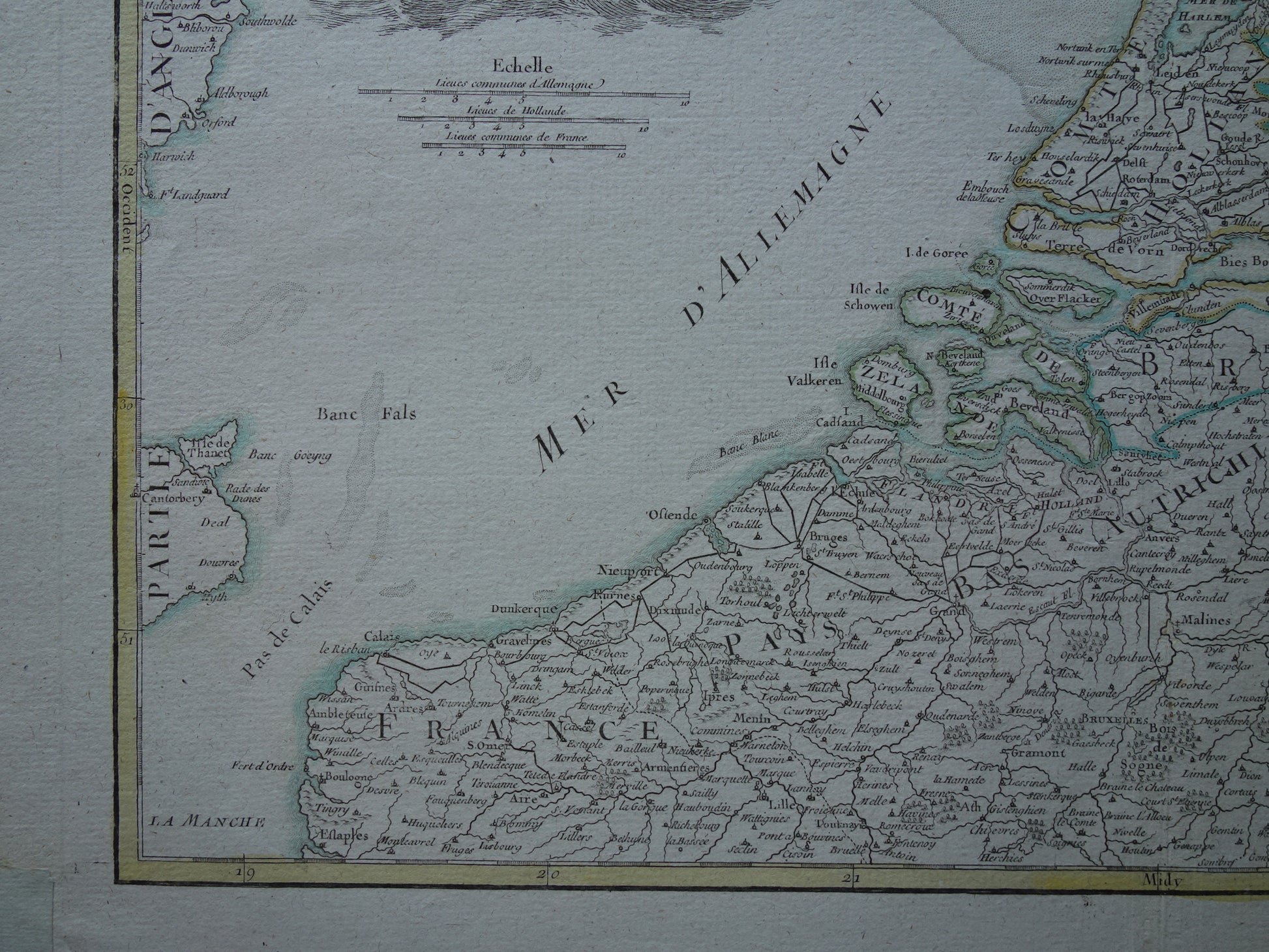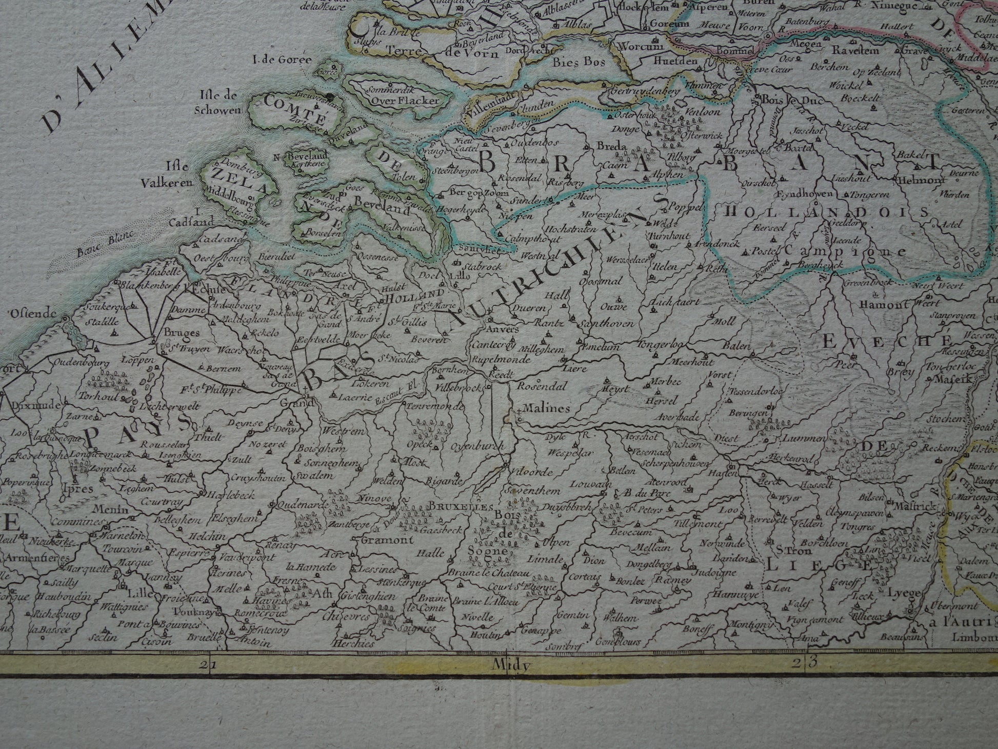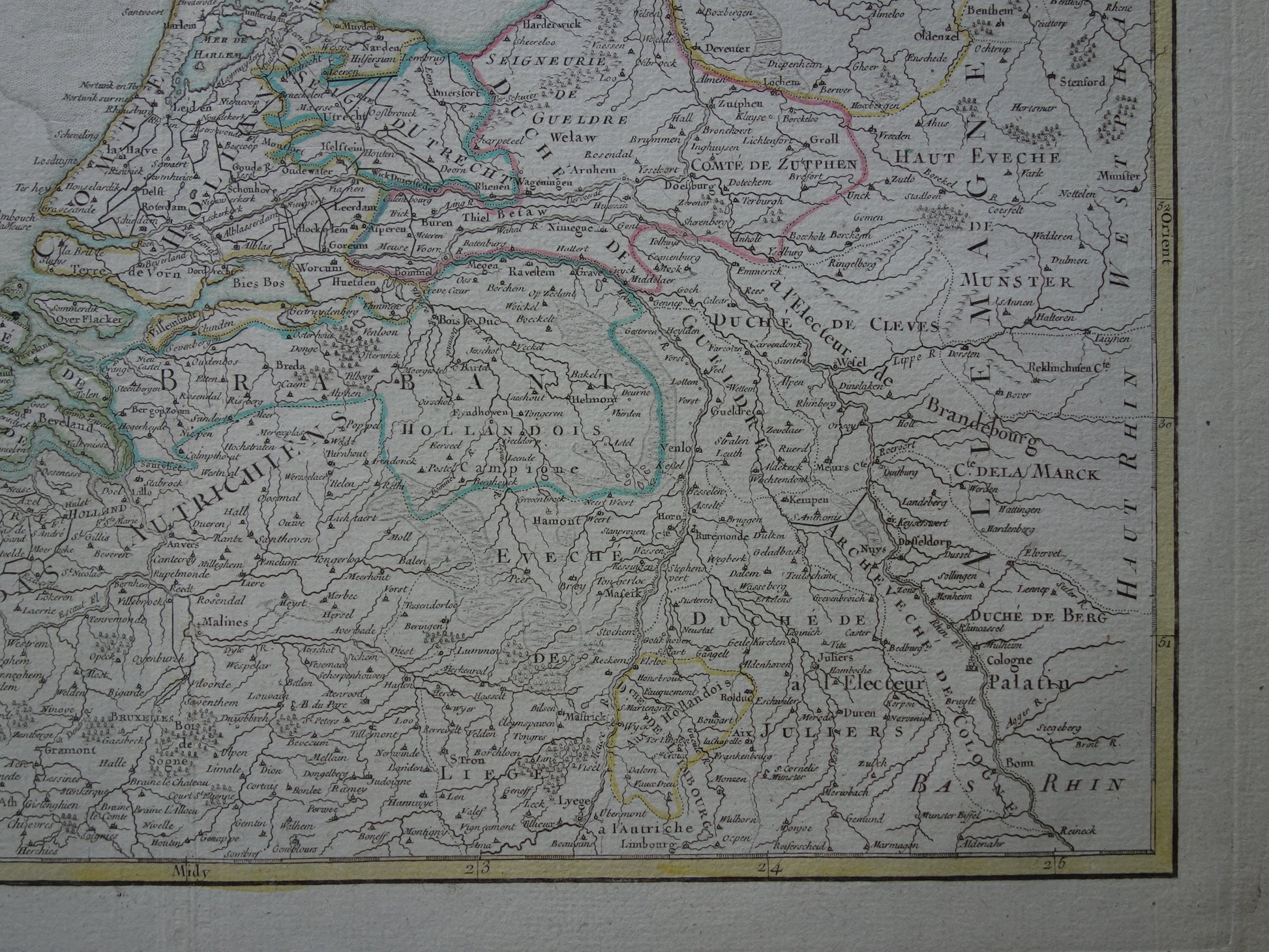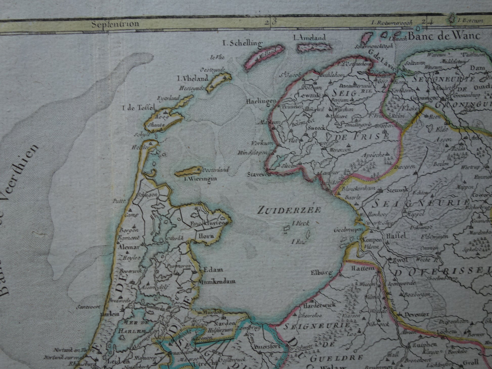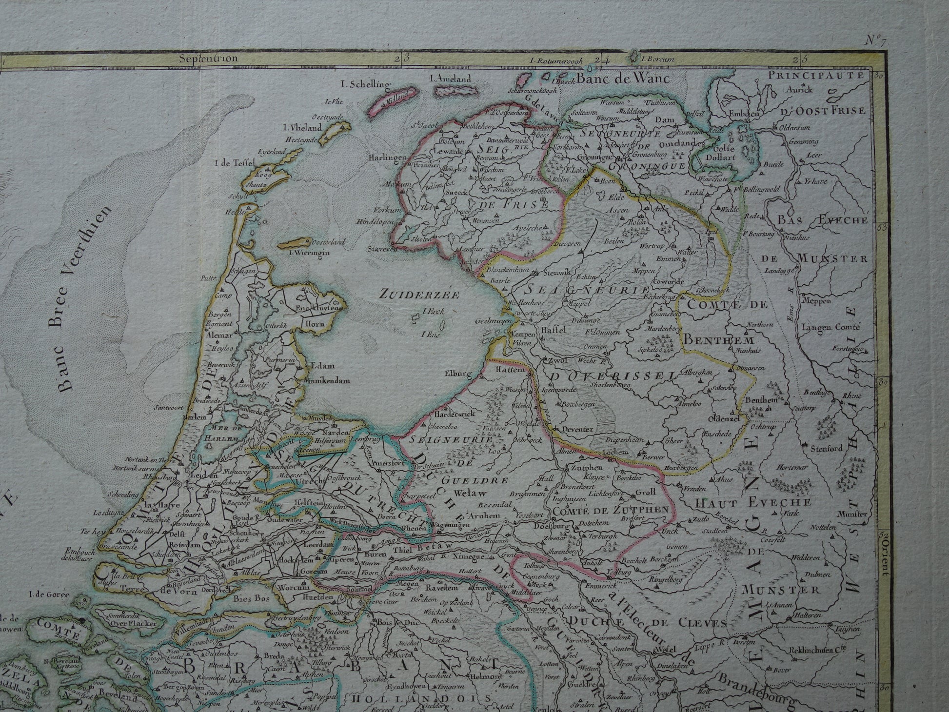 Fraaie oude kaart van Nederland uit het jaar 1770. Het is een gedetailleerde handgekleurde kopergravure. Zoom de foto's om alle details goed te zien. De Franse kaart heeft een mooie decoratieve titel "Partie septentrionale des Pays Bas comprenant les etats generaux des provinces unies". Ruime marges rondom en heel geschikt om in te lijsten.