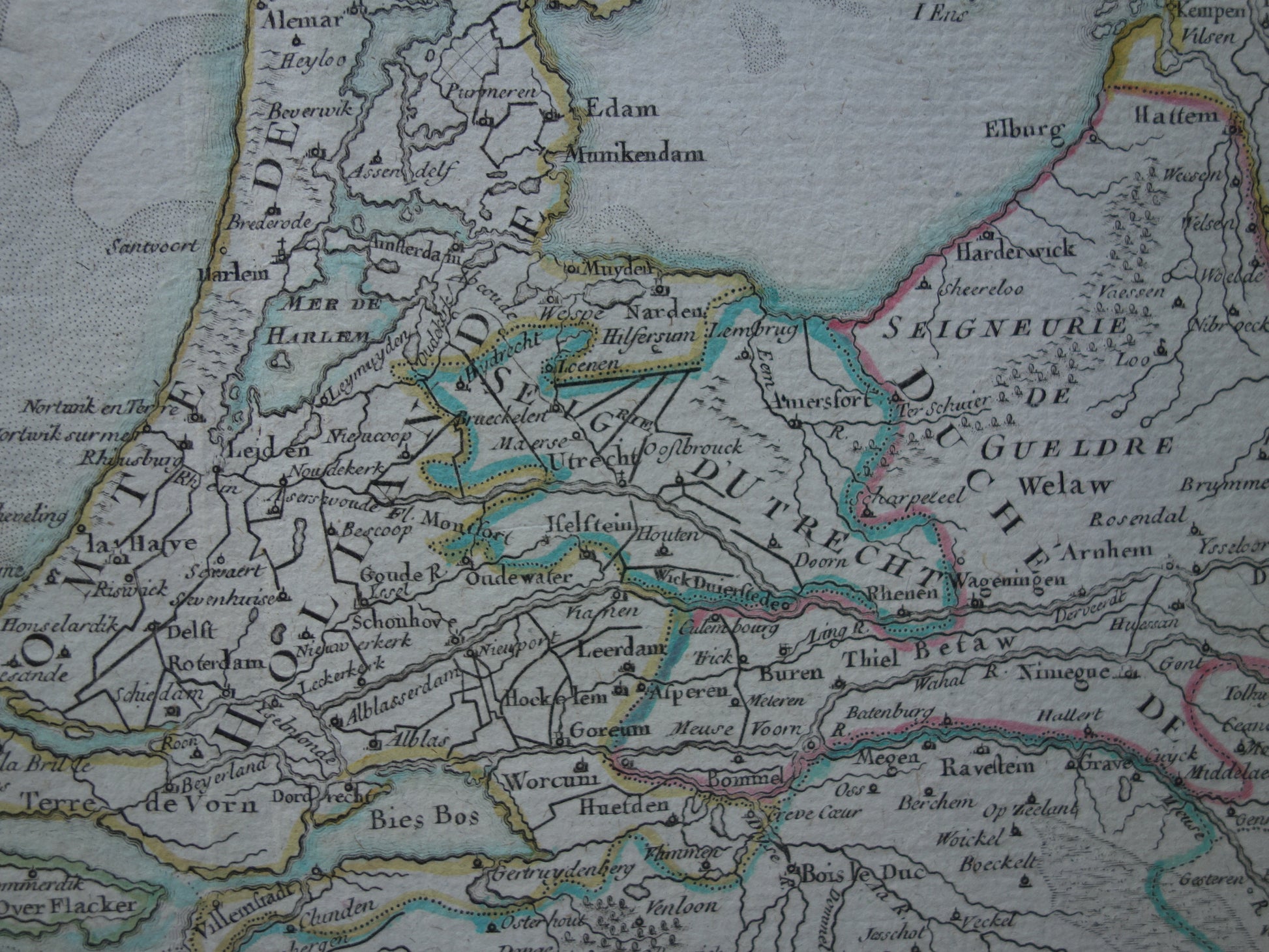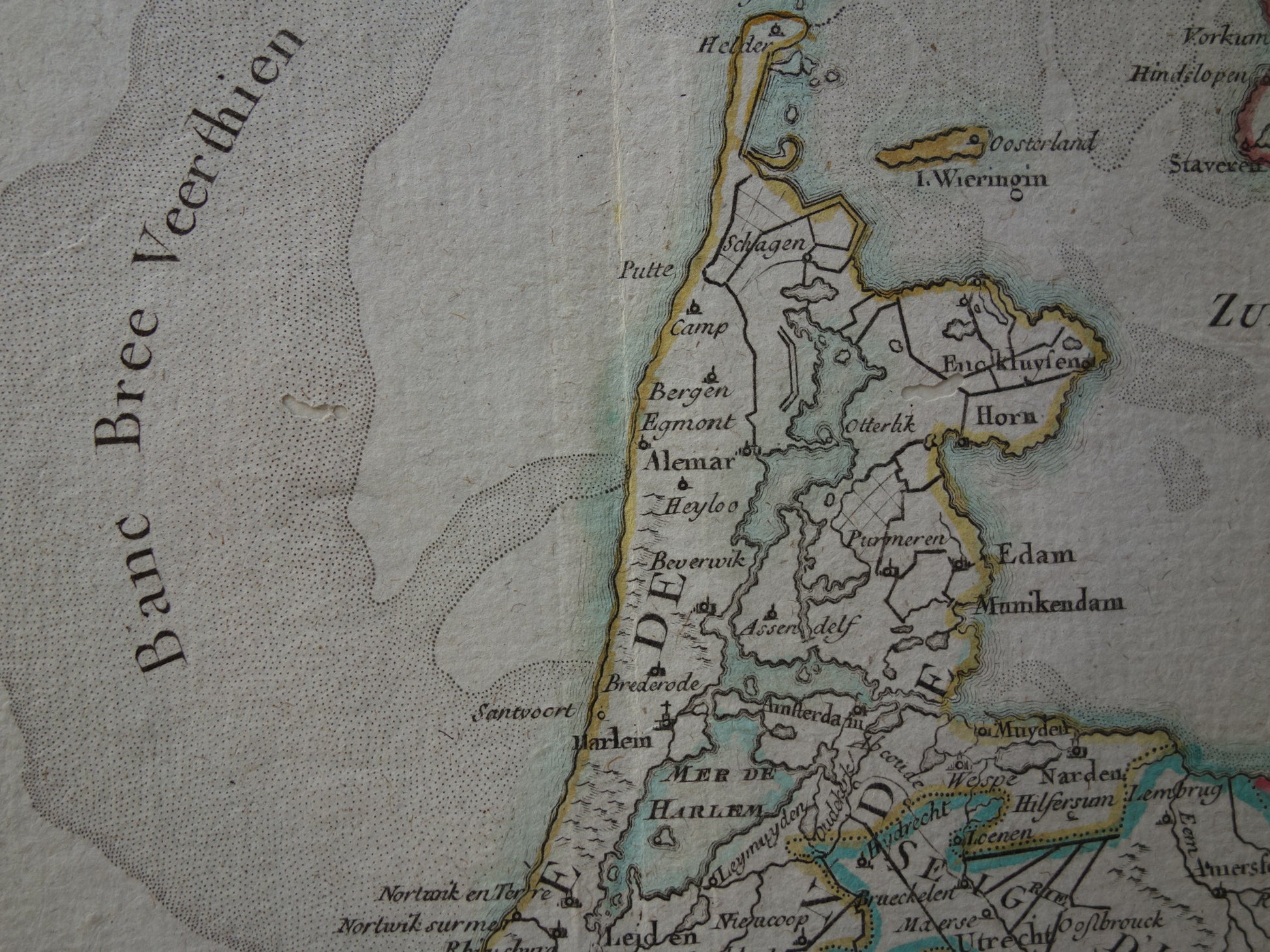 Conditie: de kaart is in goede / zeer goede conditie. In de linker onderhoek is het papier verstevigd (buiten het kaartbeeld). Twee kleine wormgaatjes, die zijn gerepareerd aan de achterzijde en daardoor nauwelijks zichtbaar zijn, zie de laatse foto in zee ten westen van Egmond en op land ten noorden van Hoorn). Verder zeer goed. Kaart heeft een middenvouw, zoals uitgegeven.