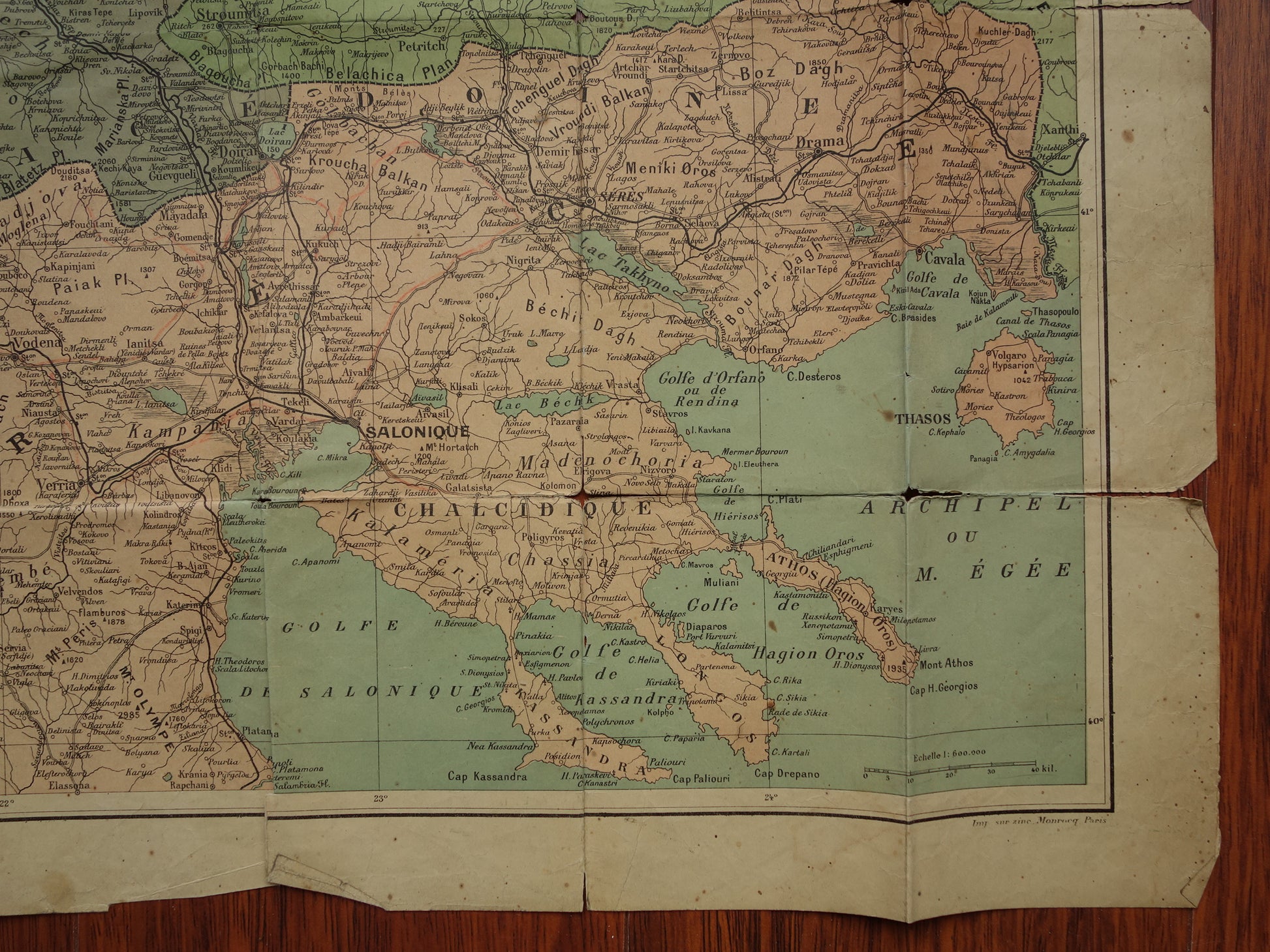 Te koop is een grote oude kaart van Macedonië, noordoost Griekenland en west Bulgarije uit het begin van de 20e eeuw. Deze vrij zeldzame Franse kaart is versleten, zoals duidelijk te zien is op de foto's.