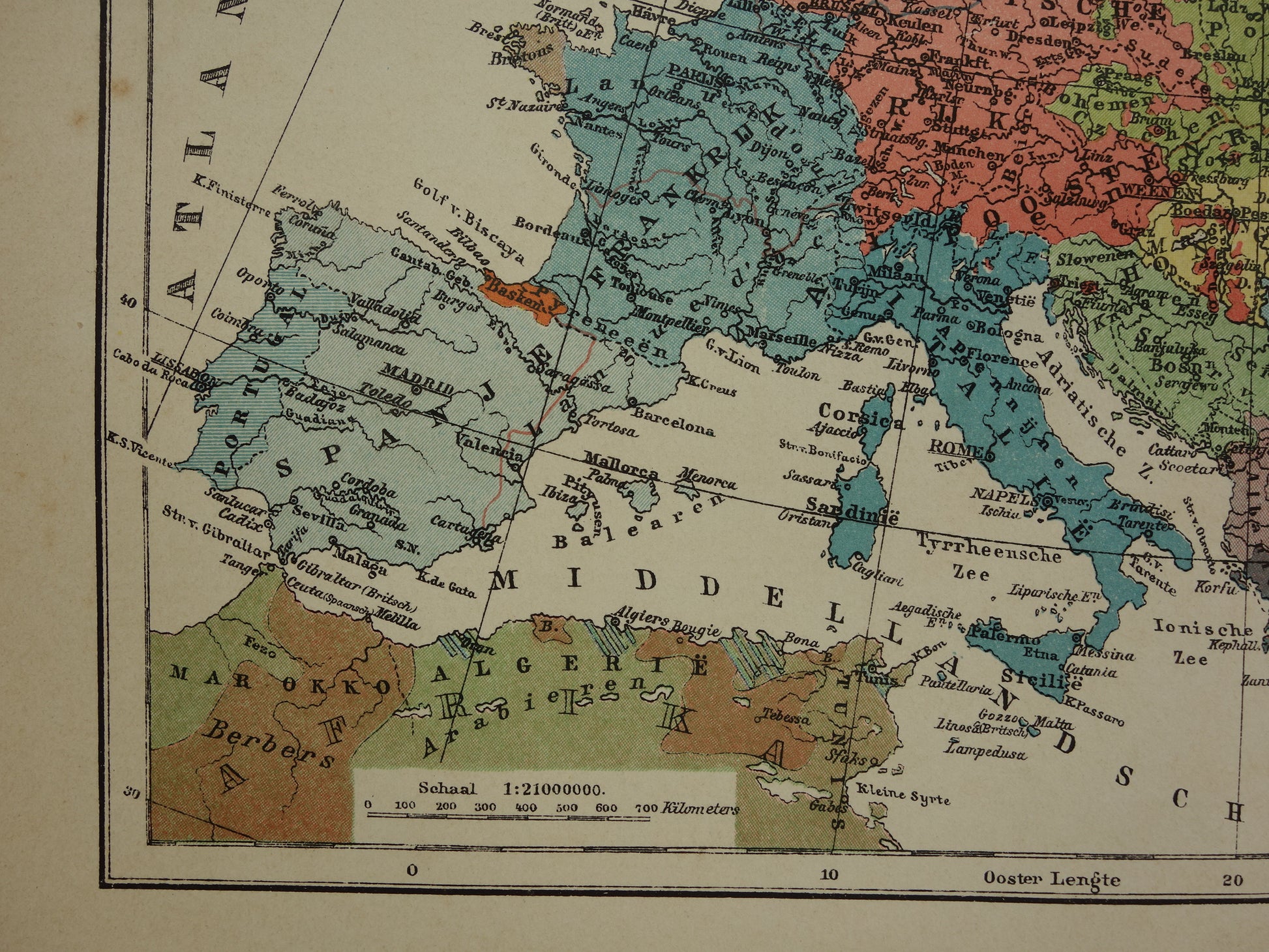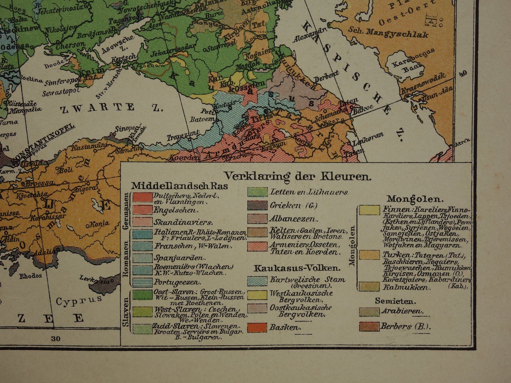 Oude etnografische kaart van Europa uit 1907 originele antieke landkaart etnografie van Europa continent vintage Nederlandse kaarten