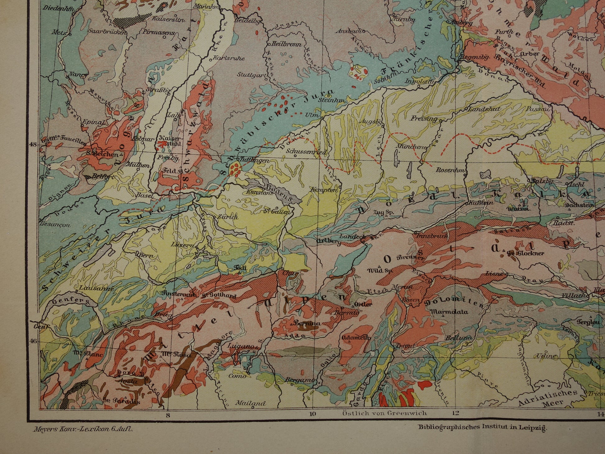A beautiful, colorful antique German map of Germany south of Frankfurt (at the top of the map). It's a geological map, with the different colors representing periods on the geological time scale. Zoom in on the photos for the best view.