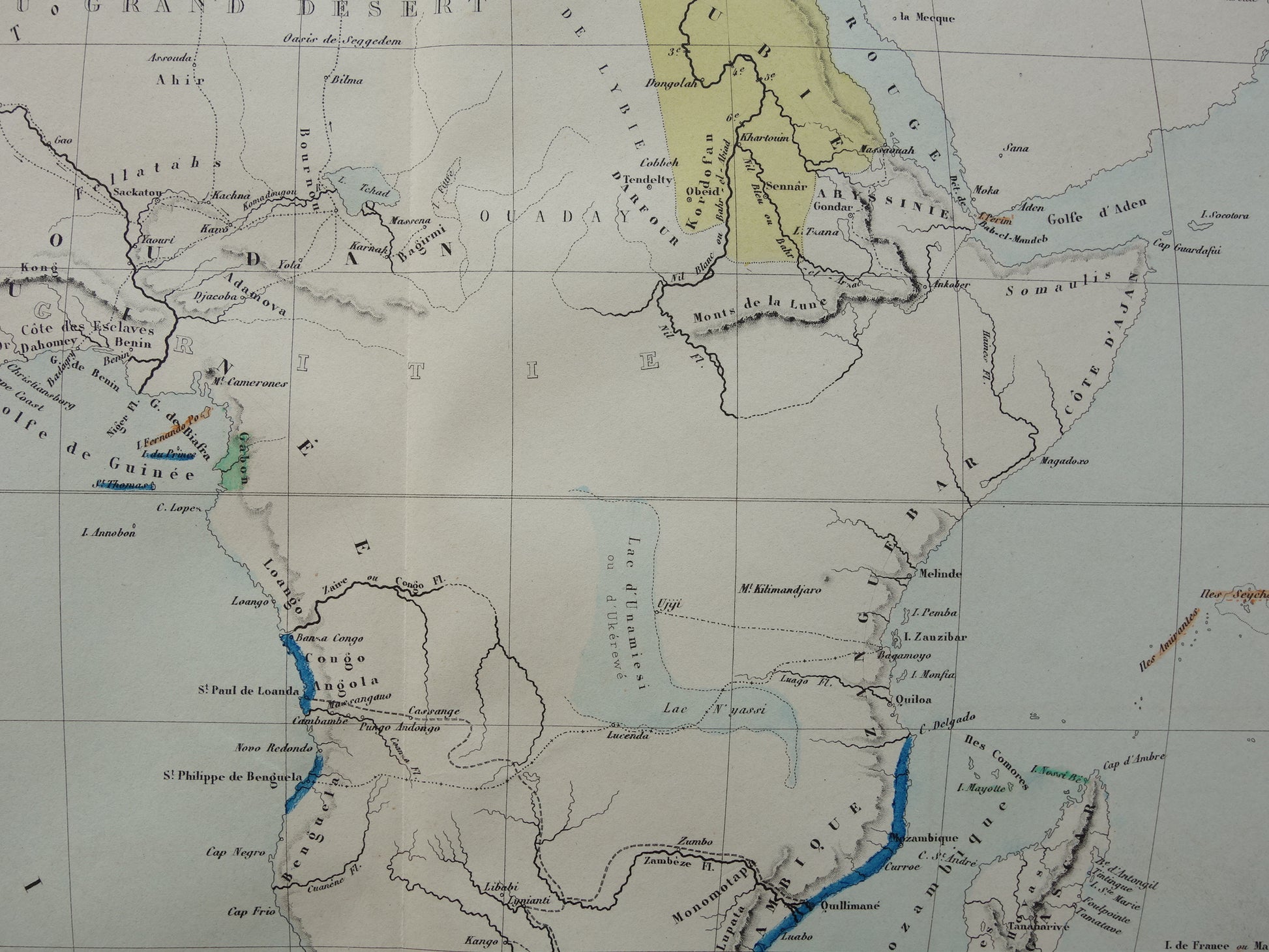 Te koop is een charmante antieke landkaart van Afrika uit het jaar 1859. De kaart is kleurrijk en gedetailleerd. Zoom de foto's om alle details goed te kunnen zien. De kaart is met de hand ingekleurd. Mooi detail is het 'Lac Uniamesi', een gigantisch meer dat helemaal niet bestaat (zie 6e foto).