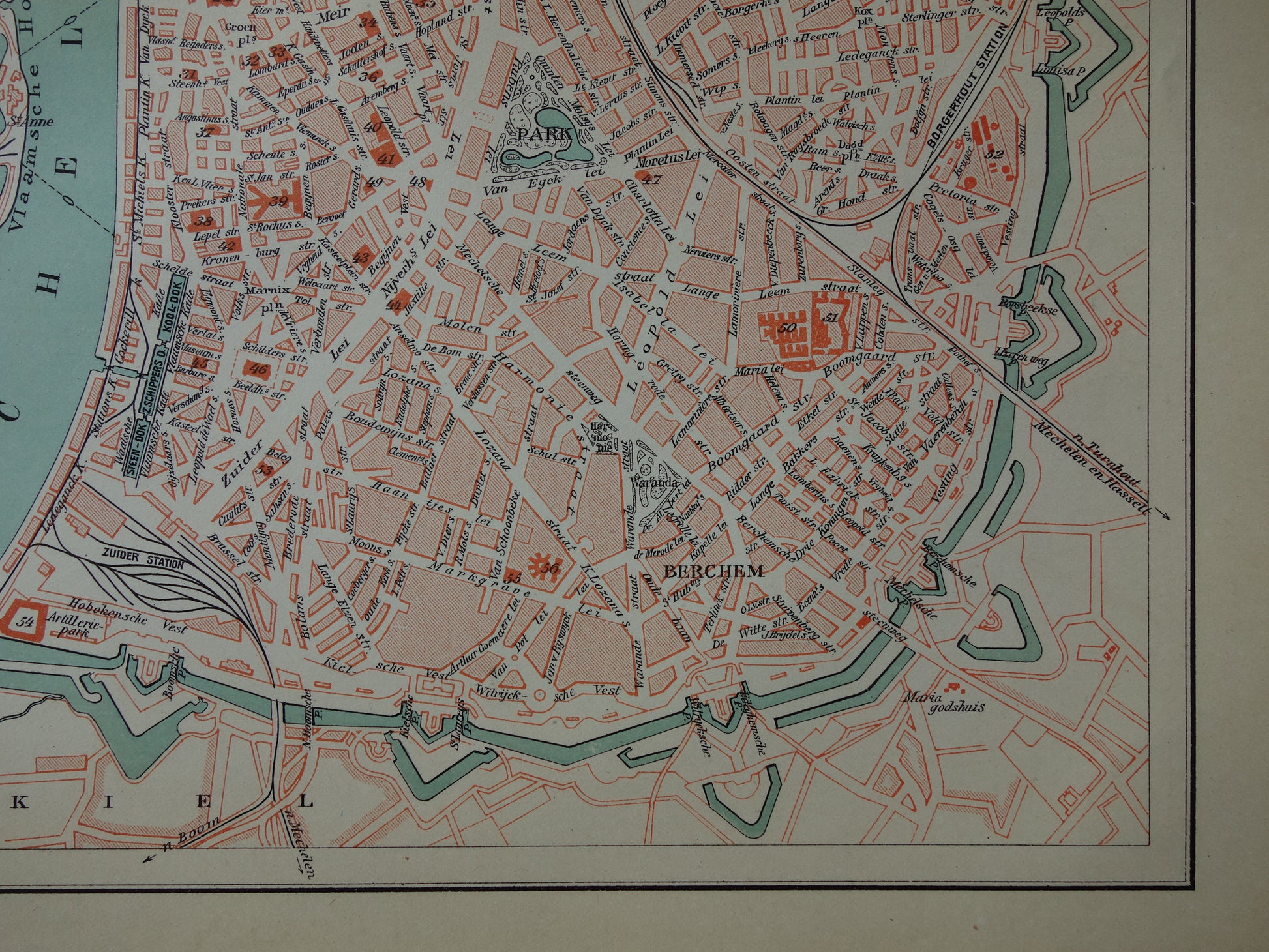 Te koop is een oude kaart / plattegrond van Antwerpen uit het jaar 1914. Links op de kaart staat een index van 56 belangrijke plekken in de stad. De corresponderende nummers zijn op de kaart terug te vinden.
