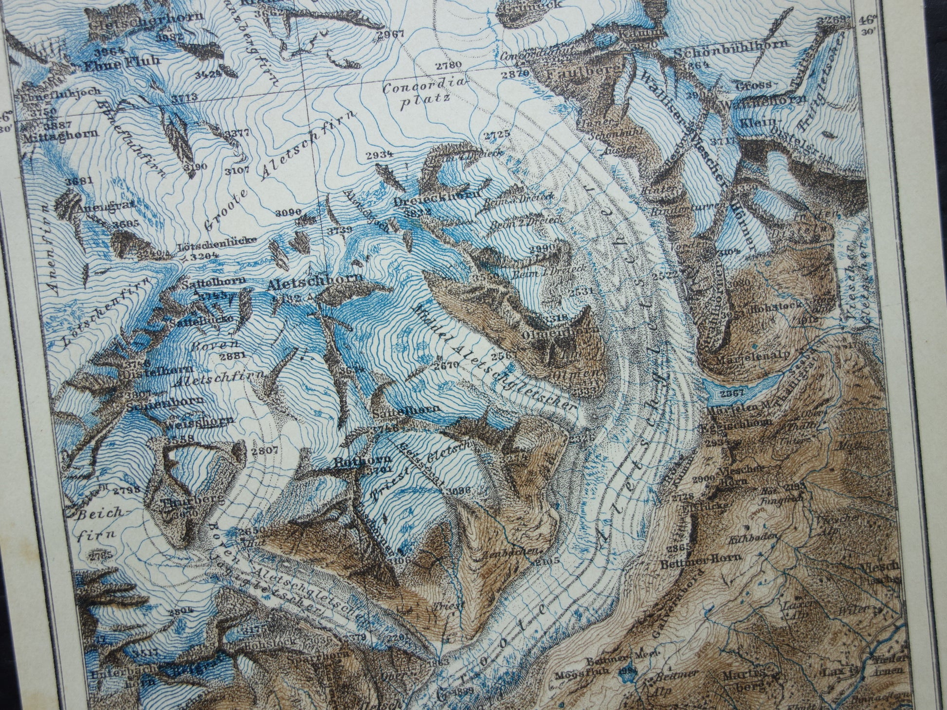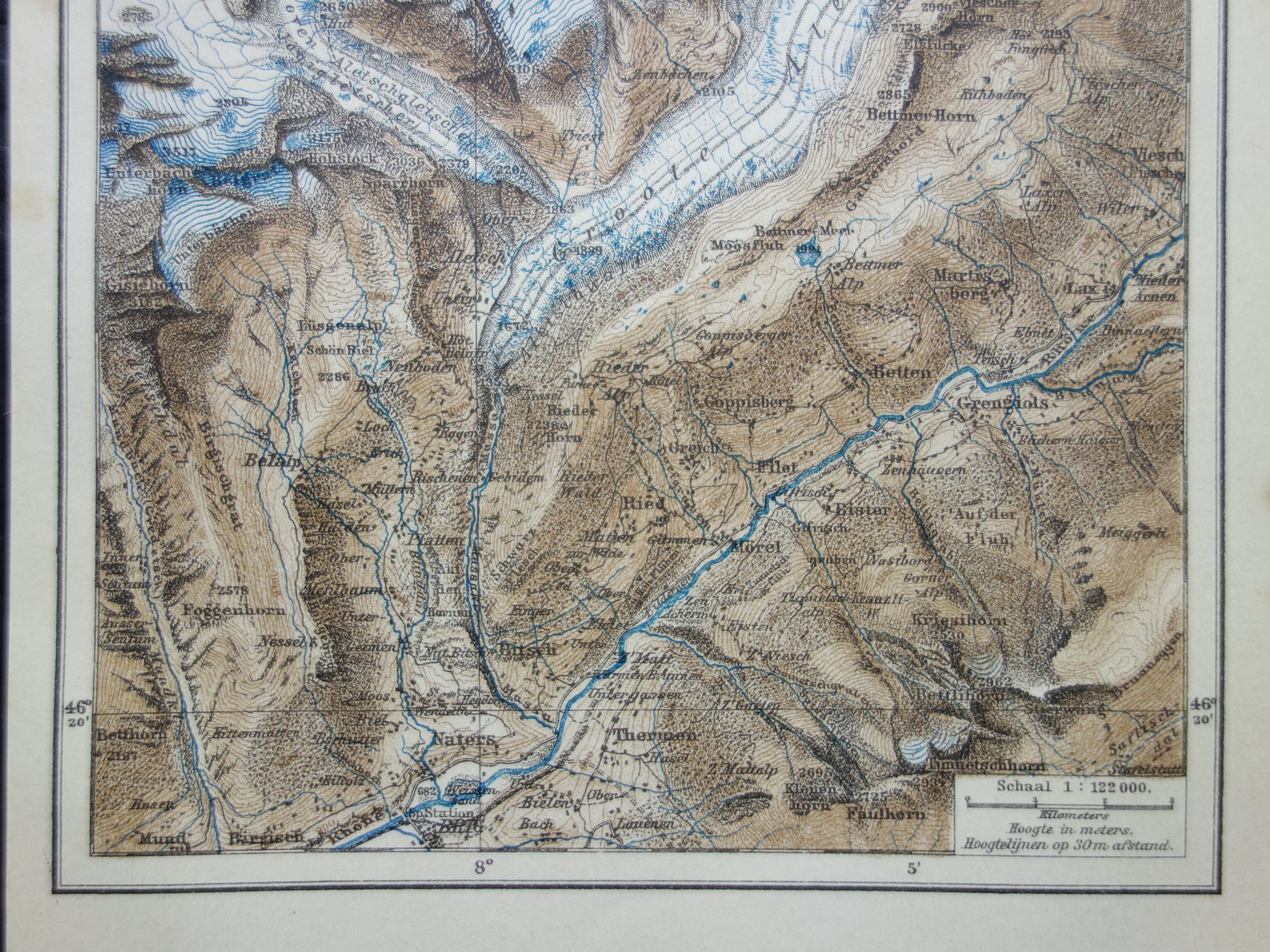 Te koop is een kleine, maar gedetailleerde kaart van de Aletschgletsjer in Zwitserland uit het jaar 1908. Zoom de foto's om alle details van deze Nederlandse kaart goed te zien.