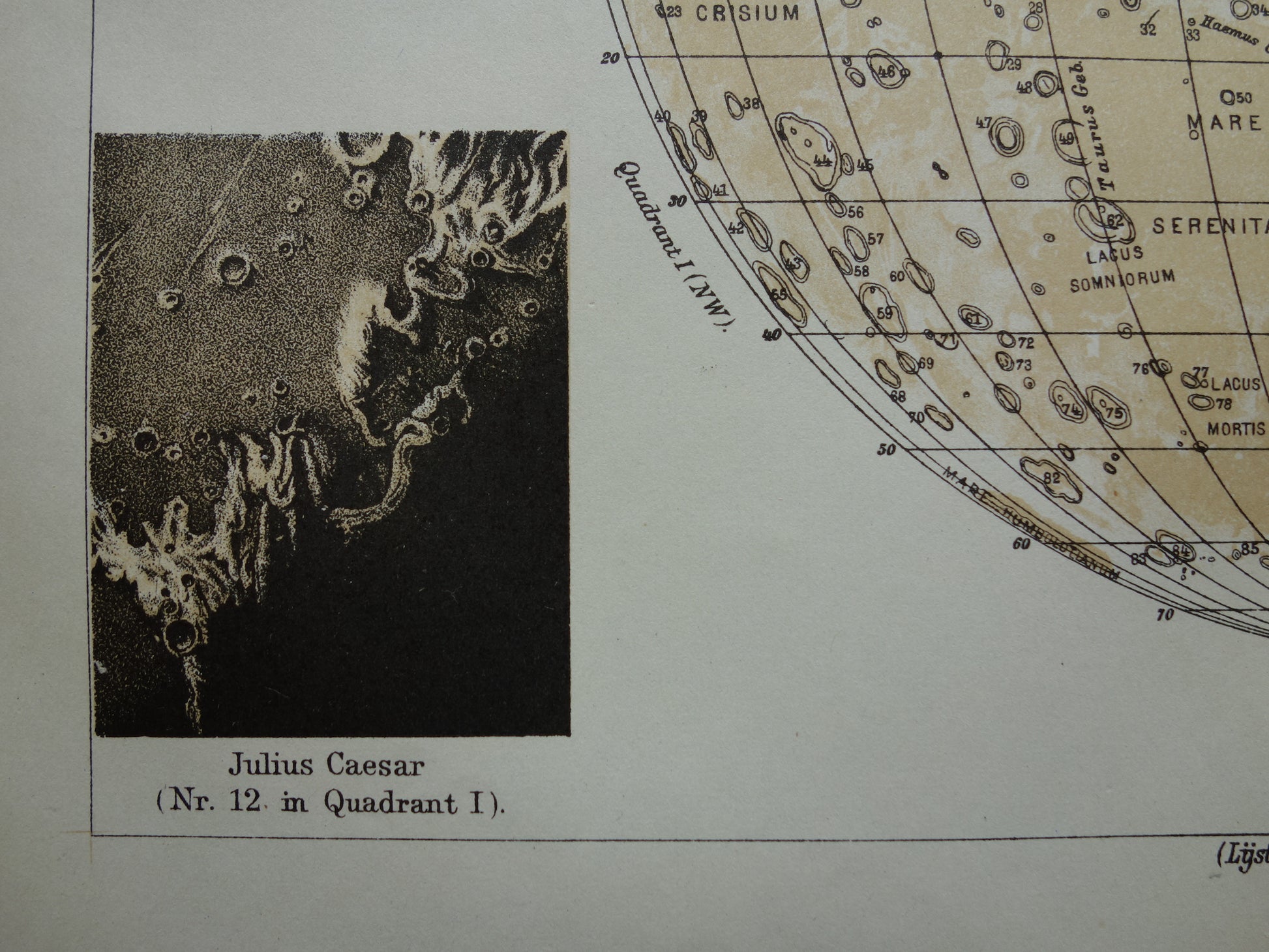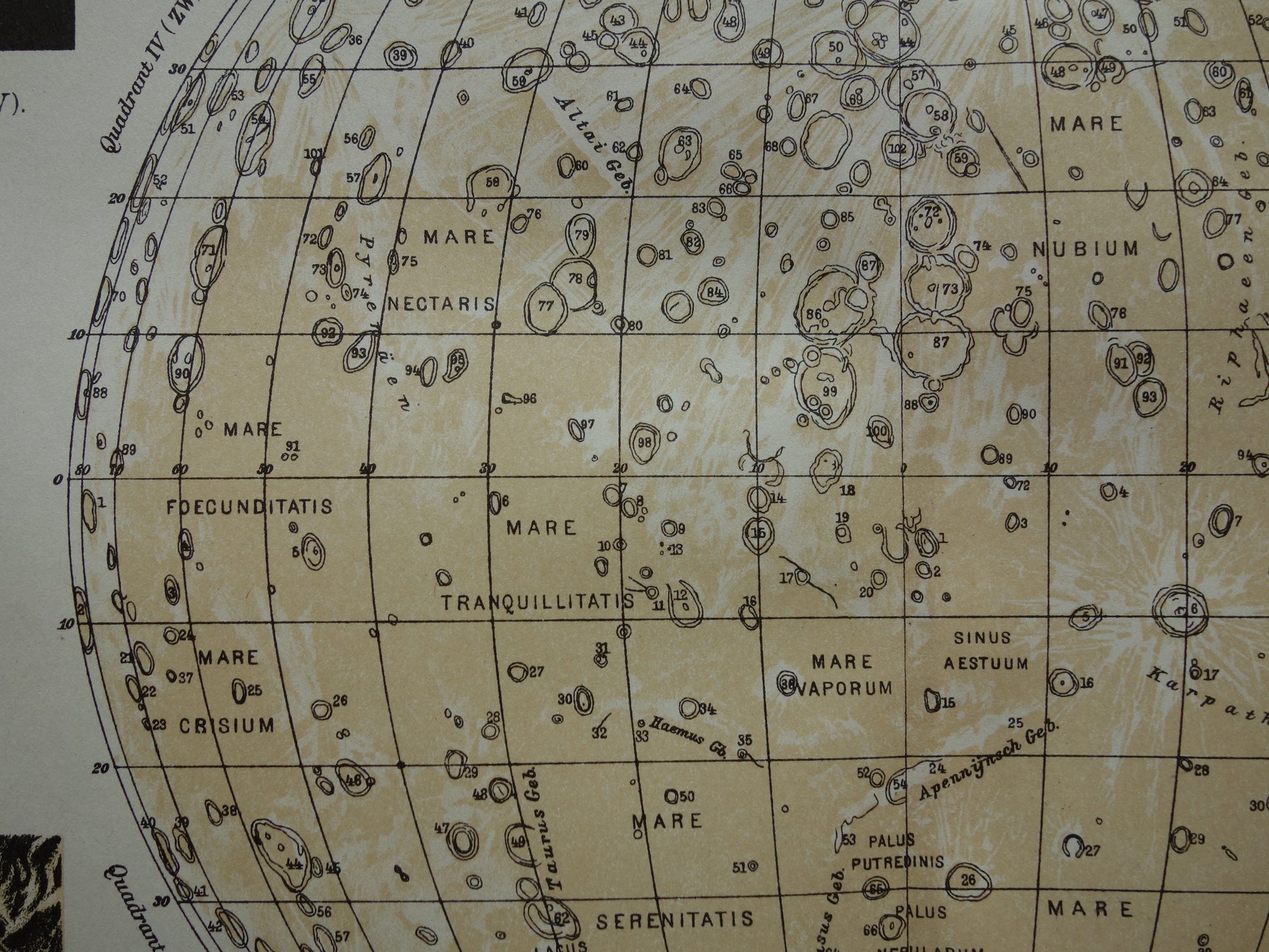 Te koop is een mooie oude kaart van de zichtbare zijde van de maan. Rondom staan afbeeldingen van kraters. Op voorzijde staat onderaan dat er een index aan de achterzijde, die ontbreekt echter.