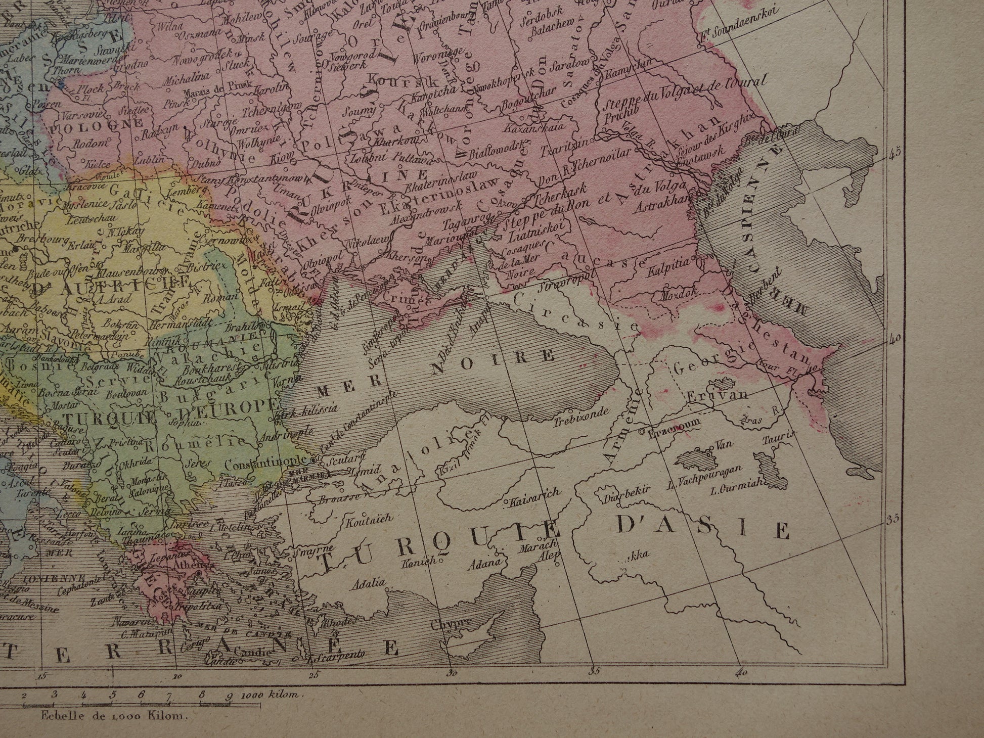 Charmante antieke Franse kaart van Europa uit het jaar 1877. Linksboven staat een index van alle staten die behoren bij het Duitse rijk. Deze kaart is met de hand ingekleurd. Erg gedetailleerde kaart, een vergrootglas kan nodig zijn om alle details goed te zien/lezen.