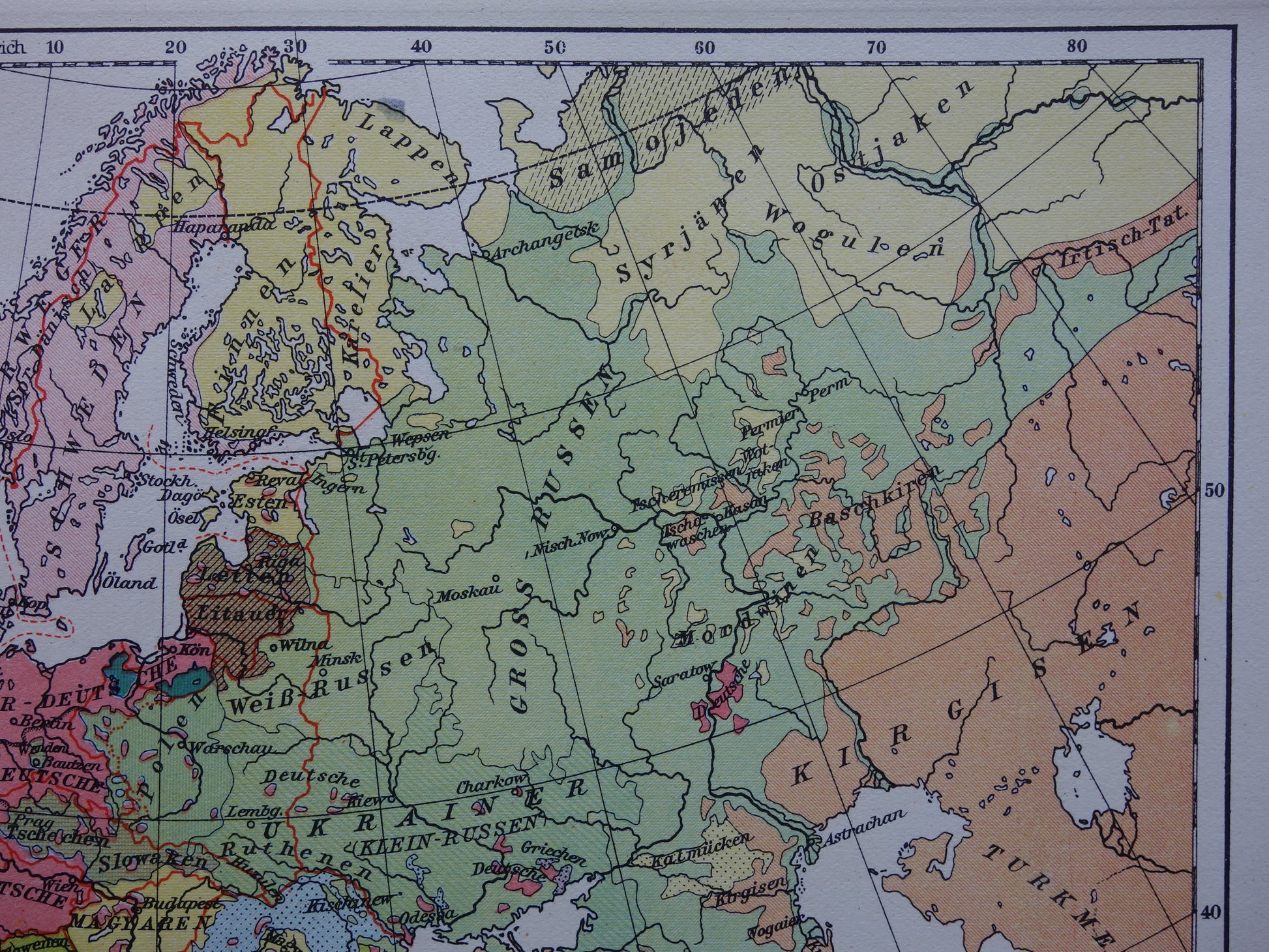 Kleine oude etnologische en linguïstische landkaart van Europa uit 1931. Deze Duitse kaart is kleurrijk en gedetailleerd, zoom de foto's om dat goed te zien.