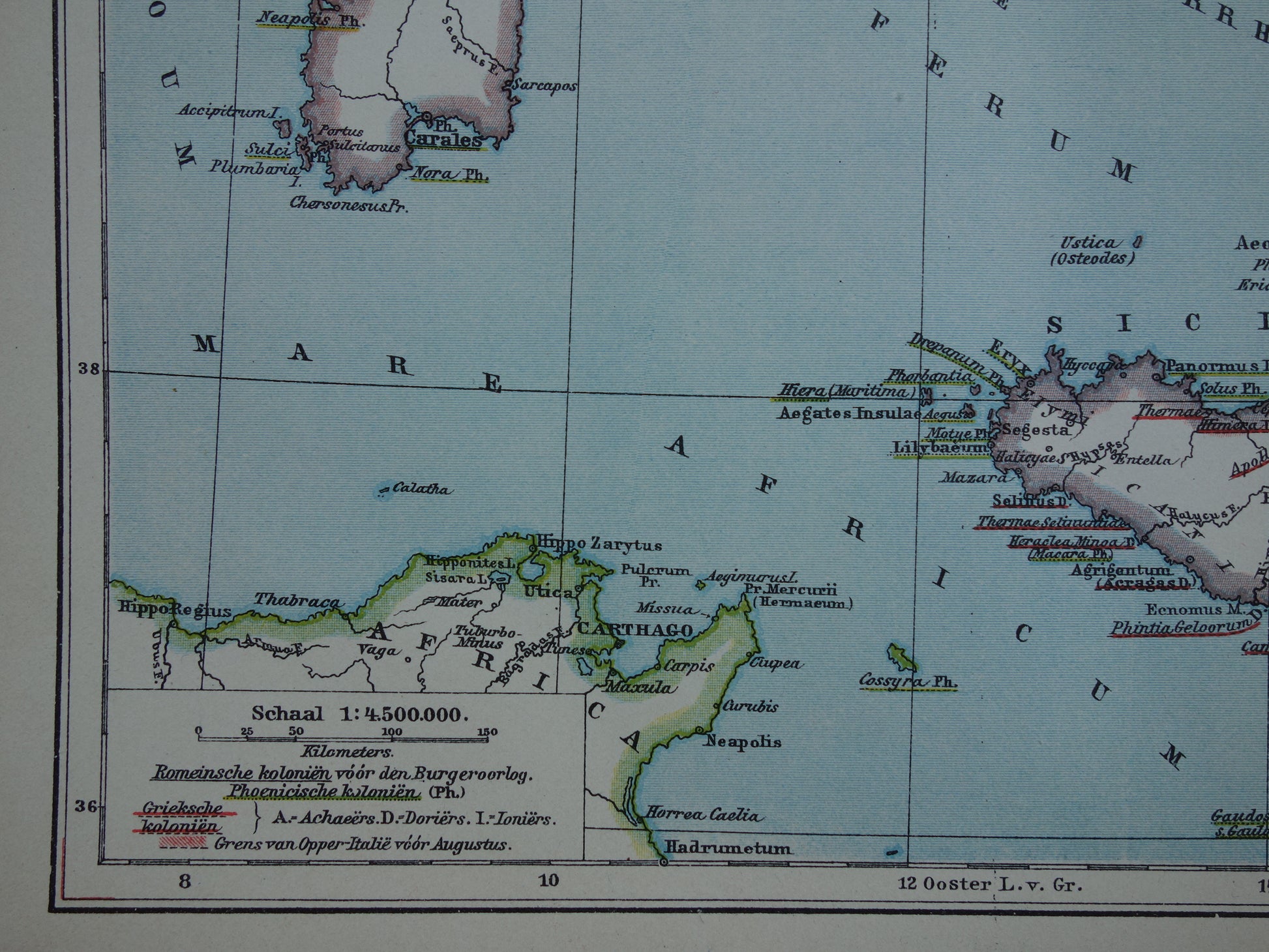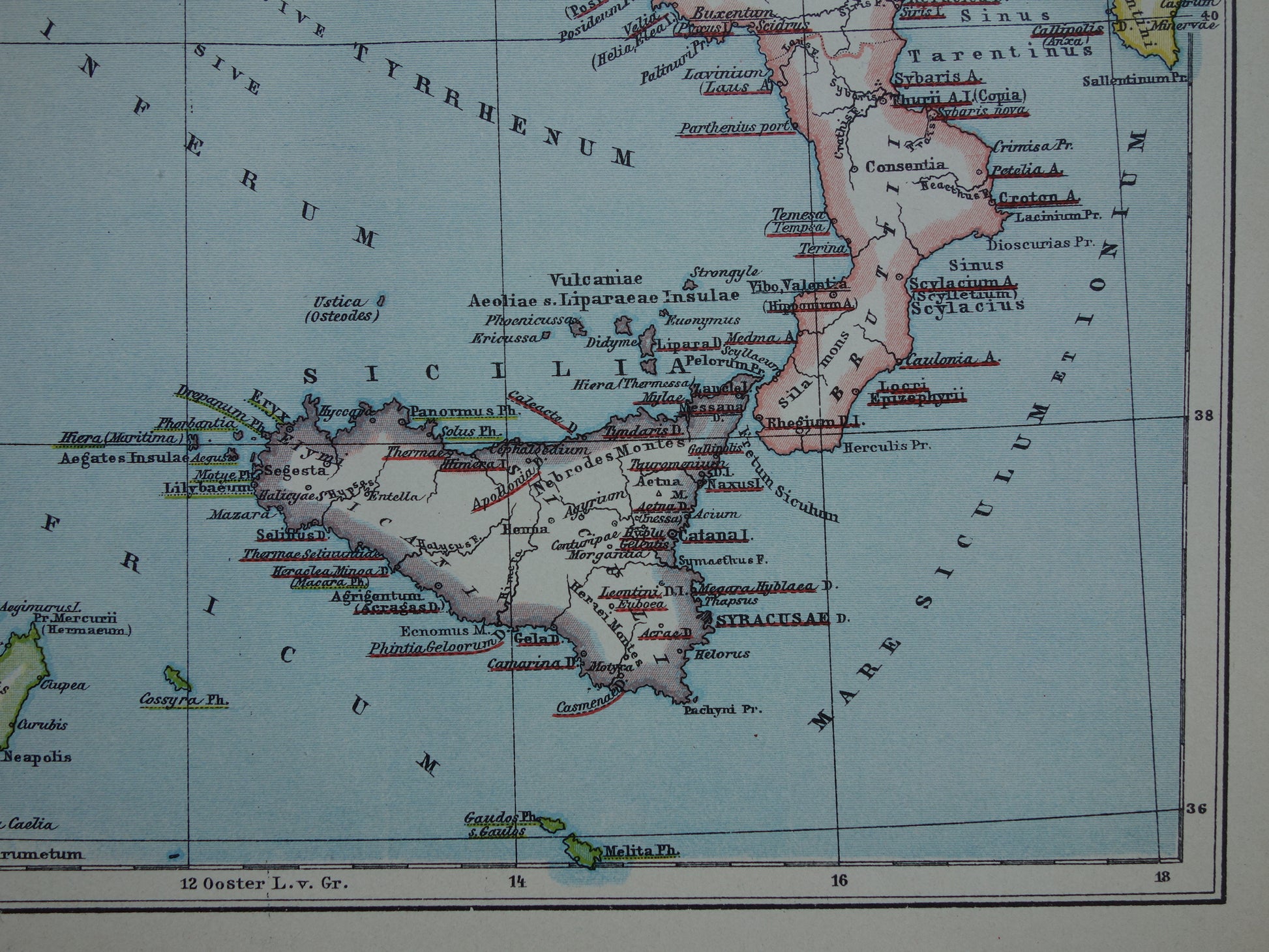 Mooie, kleurrijke oude kaart van Italië in de klassieke oudheid. Alle plaatsen op de kaart hebben hun oude Latijnse naam. Met rood onderstreept zijn Griekse koloniën, met groen koloniën van de Feniciërs / Phoeniciërs. Met stippellijn staat ook nog de grens van Noord-Italië aangegeven van voor Augustus.