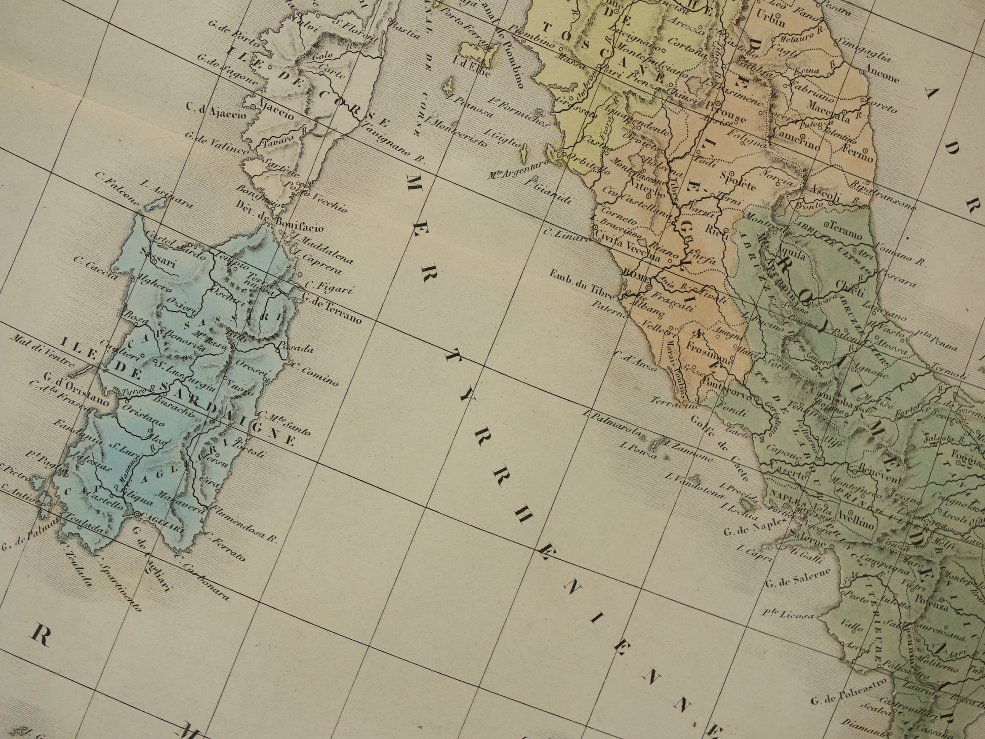 Te koop is een charmante antieke handgekleurde landkaart van Italië uit het jaar 1859. De kaart is kleurrijk en gedetailleerd. Zoom de foto's om alle details goed te kunnen zien. De kaart is met de hand ingekleurd.