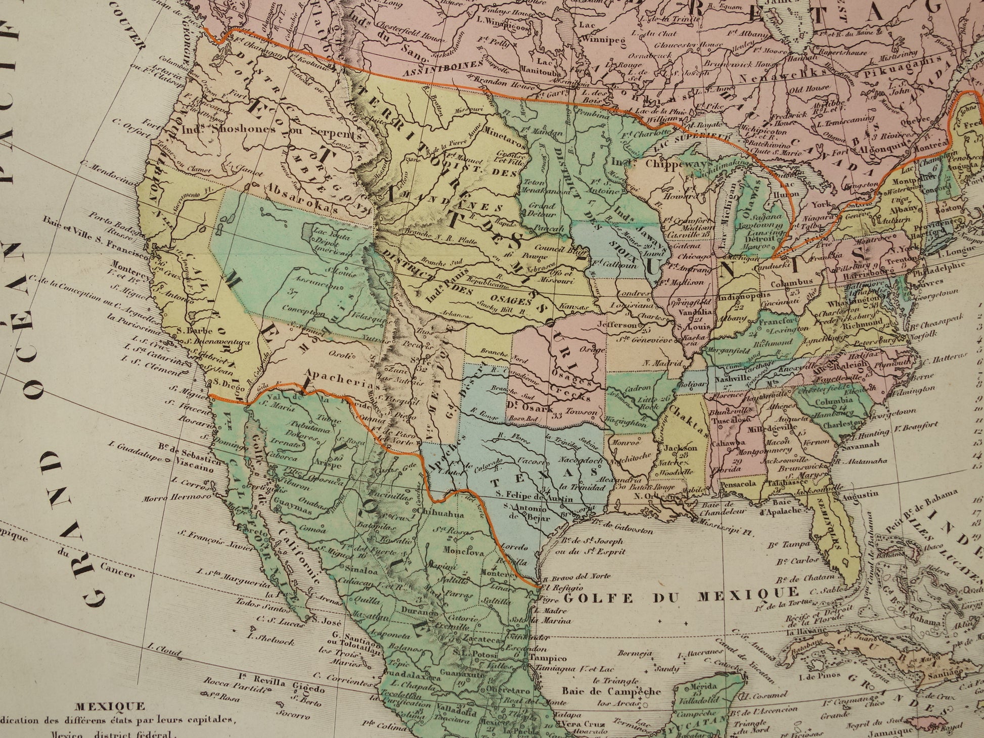Te koop is een charmante antieke landkaart van Noord-Amerika uit het jaar 1859. De kaart is kleurrijk en gedetailleerd. Zoom de foto's om alle details goed te kunnen zien. De kaart is met de hand ingekleurd.