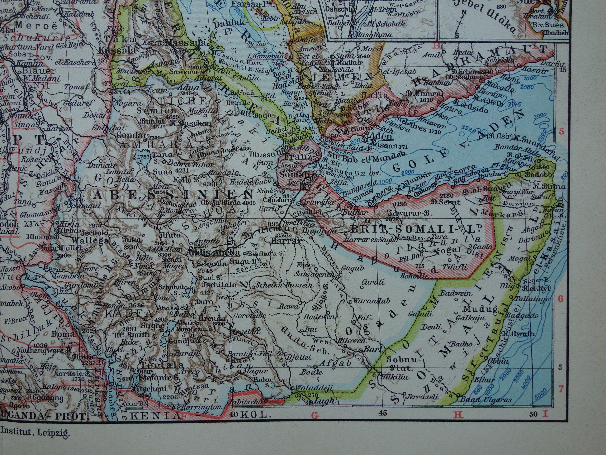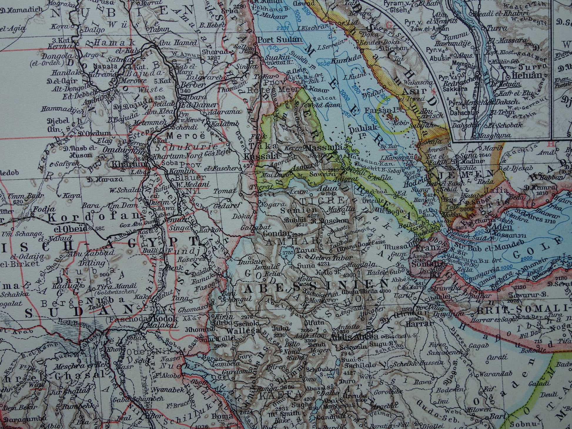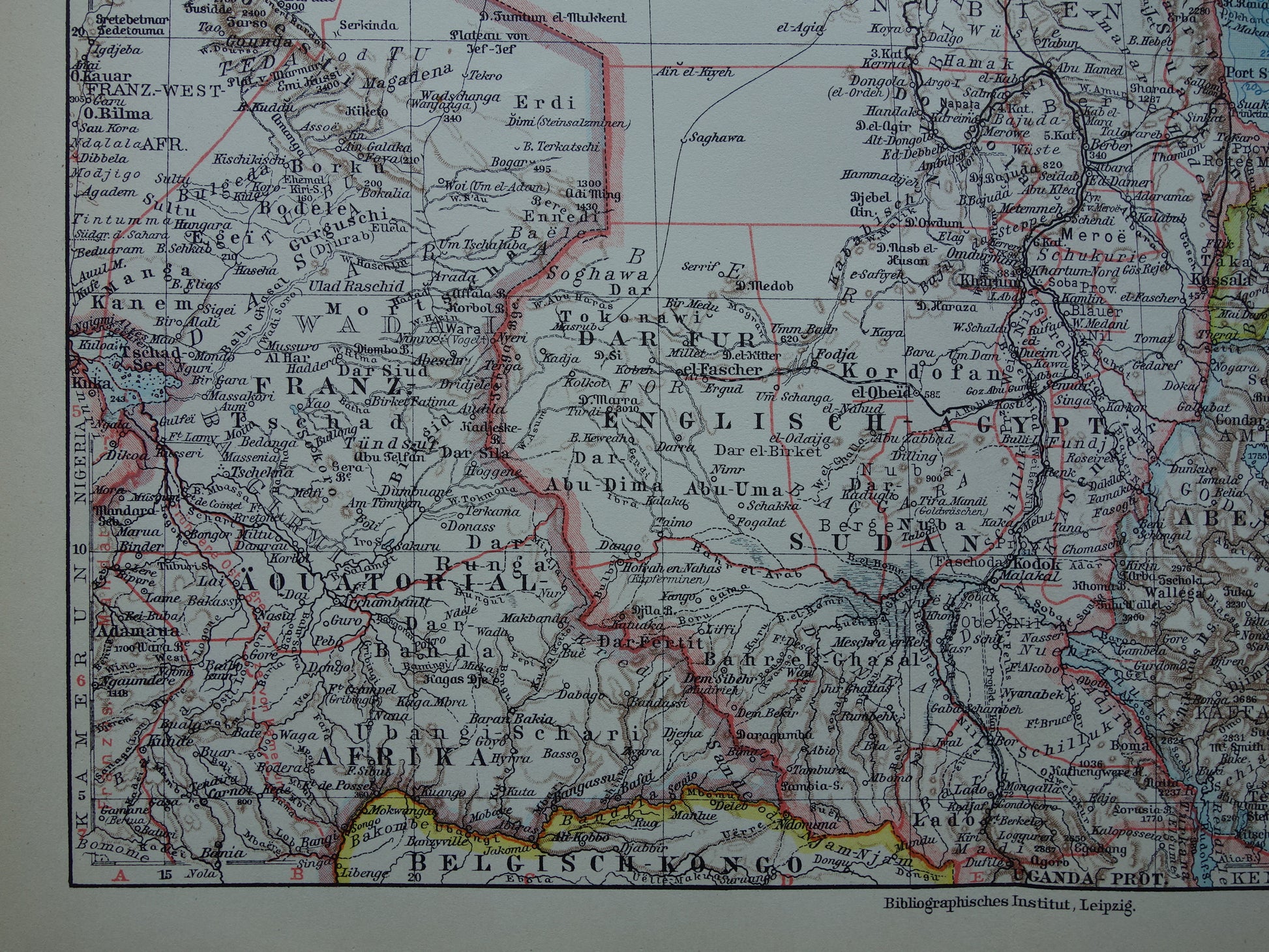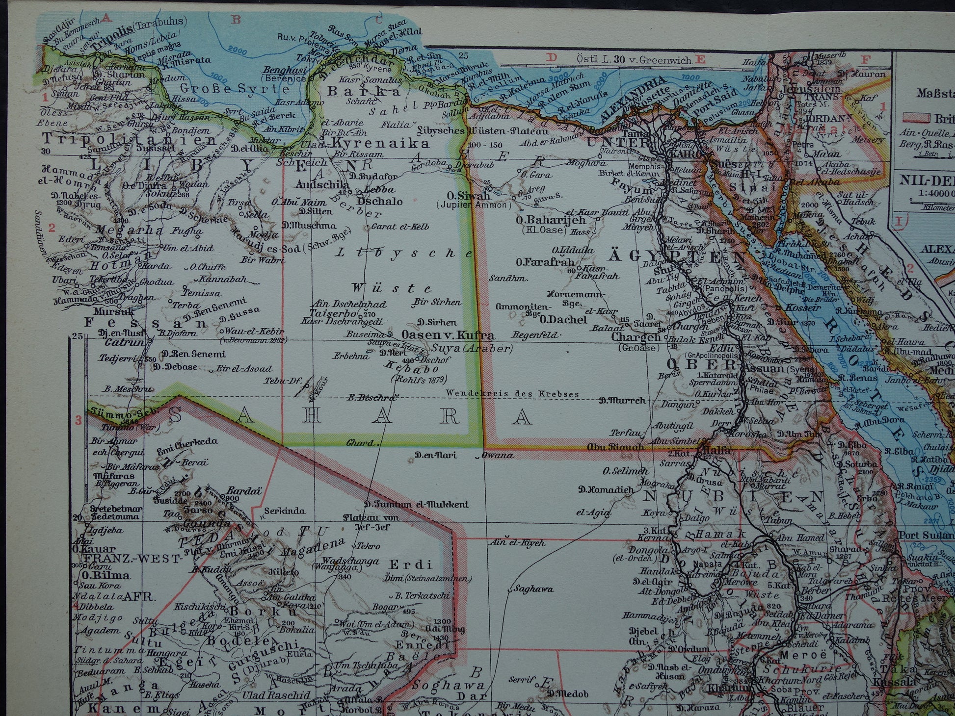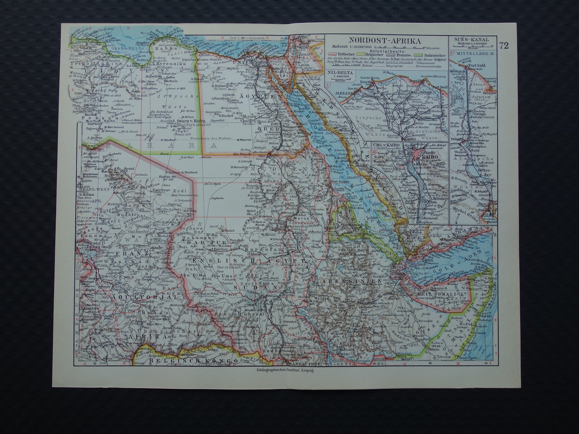 Te koop is een vintage Duitse kaart van Noordoost-Afrika en het westen van het Arabisch Schiereiland. De kaart is zeer gedetailleerd voor zijn formaat en heeft mooie kleuren. Er zijn drie inzetkaarten: een van het Suezkanaal, een van de omgeving van Caïro en een van de Nijldelta.