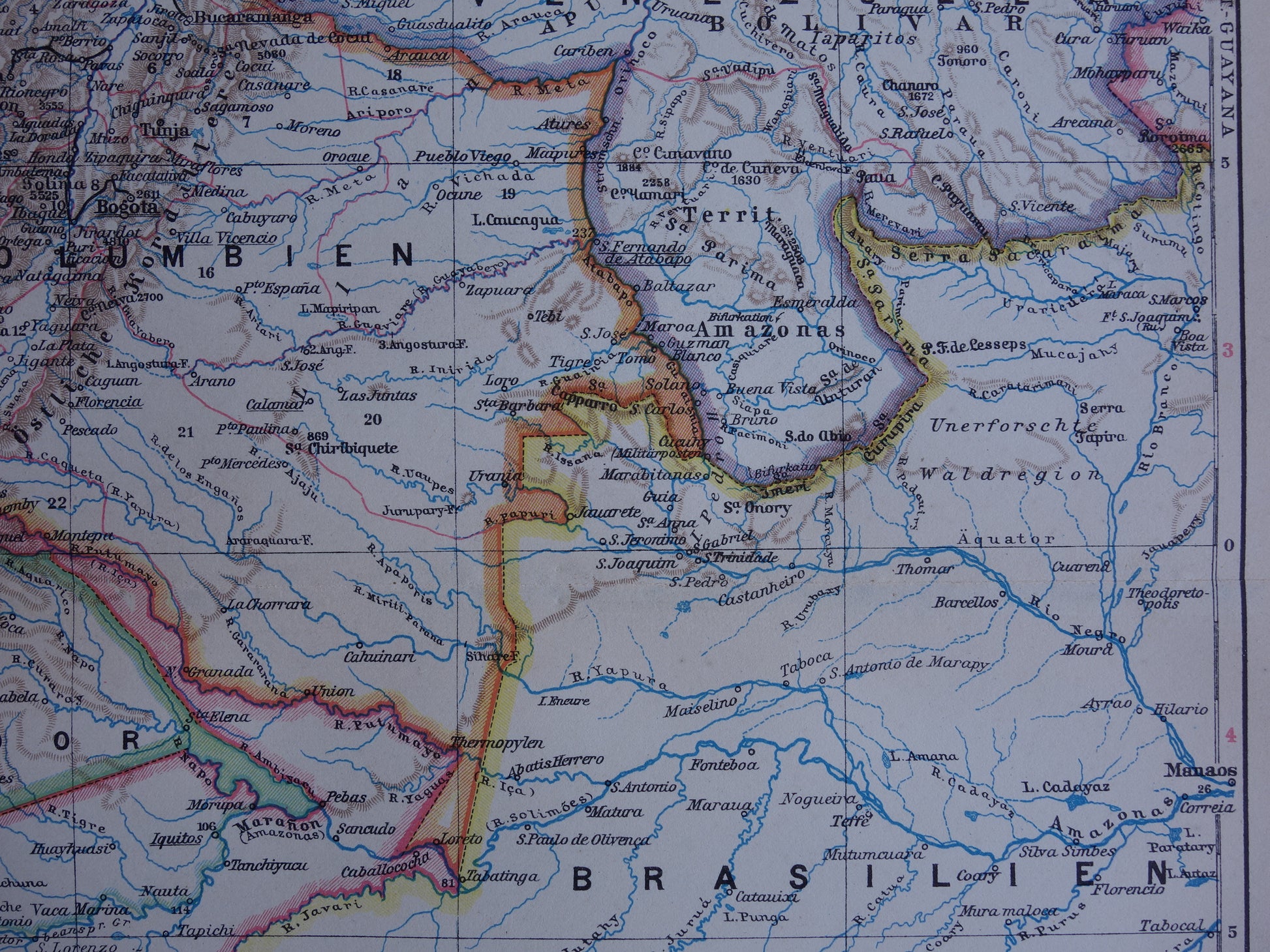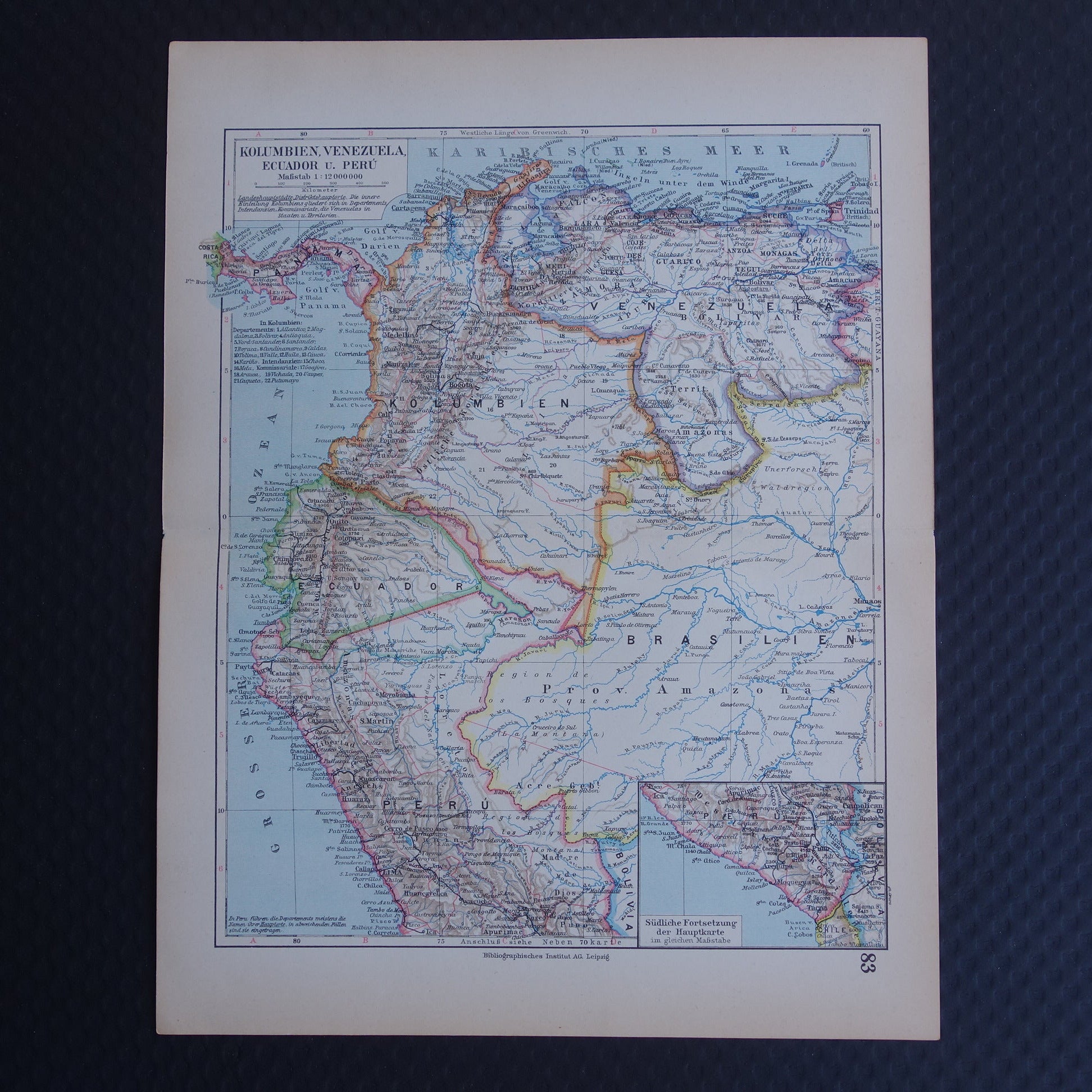 Te koop is een zeer gedetailleerde oude Duitse kaart van het noordwesten van Zuid-Amerika met o.a. Venezuela, Colombia, Ecuador en Peru uit het jaar 1928. Zoom de foto's om alle details goed te zien. Met ruime marges en heel geschikt om in te lijsten.