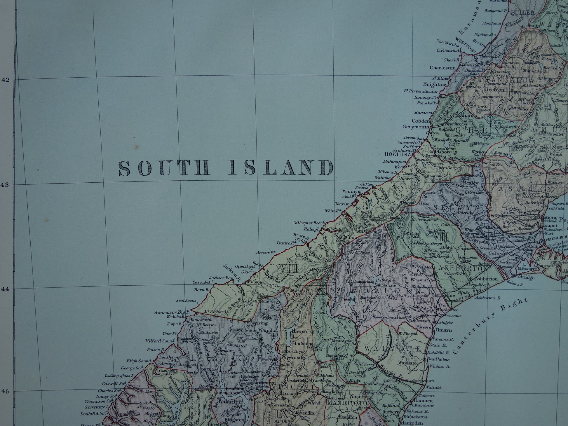 Oude landkaart van Nieuw-Zeeland uit 1890 Mooie origineel antieke kaart New Zealand Vintage landkaarten