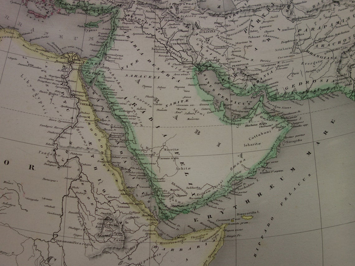 Te koop is een indrukwekkende, grote Franse kaart van de wereld zoals die bekend was in de klassieke oudheid. Onderaan inzetkaartjes van de wereldkaarten van Ptolemaeus en Herodotus. De kaart is met de hand ingekleurd. In de decoratieve titel staat het jaartal 1863 gedrukt.